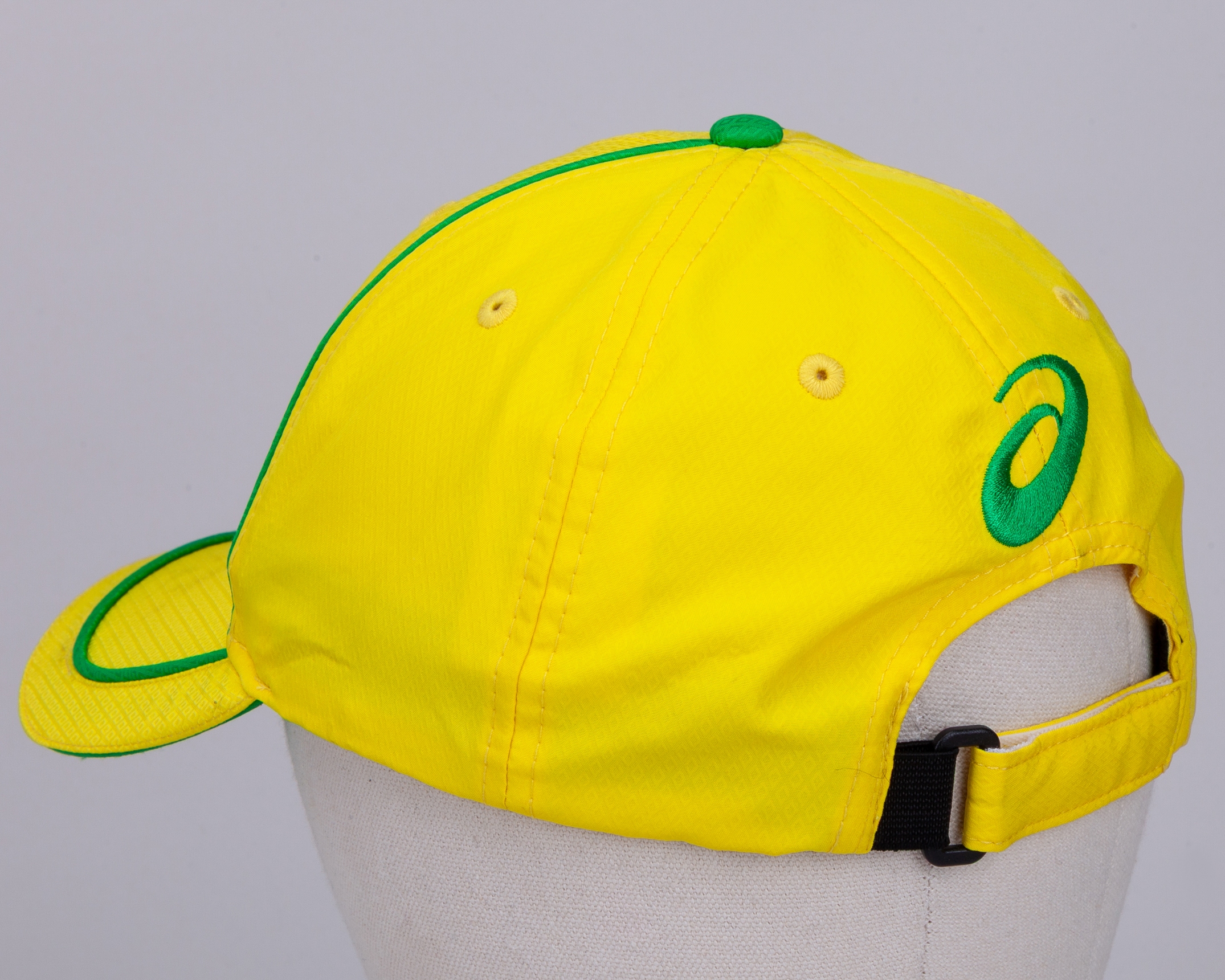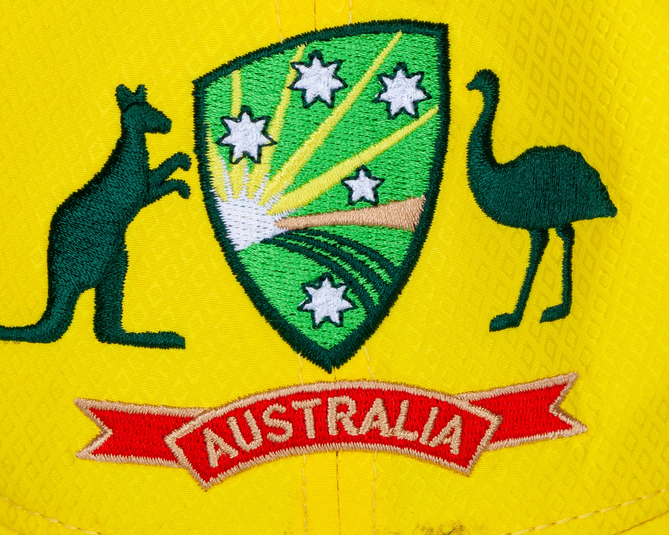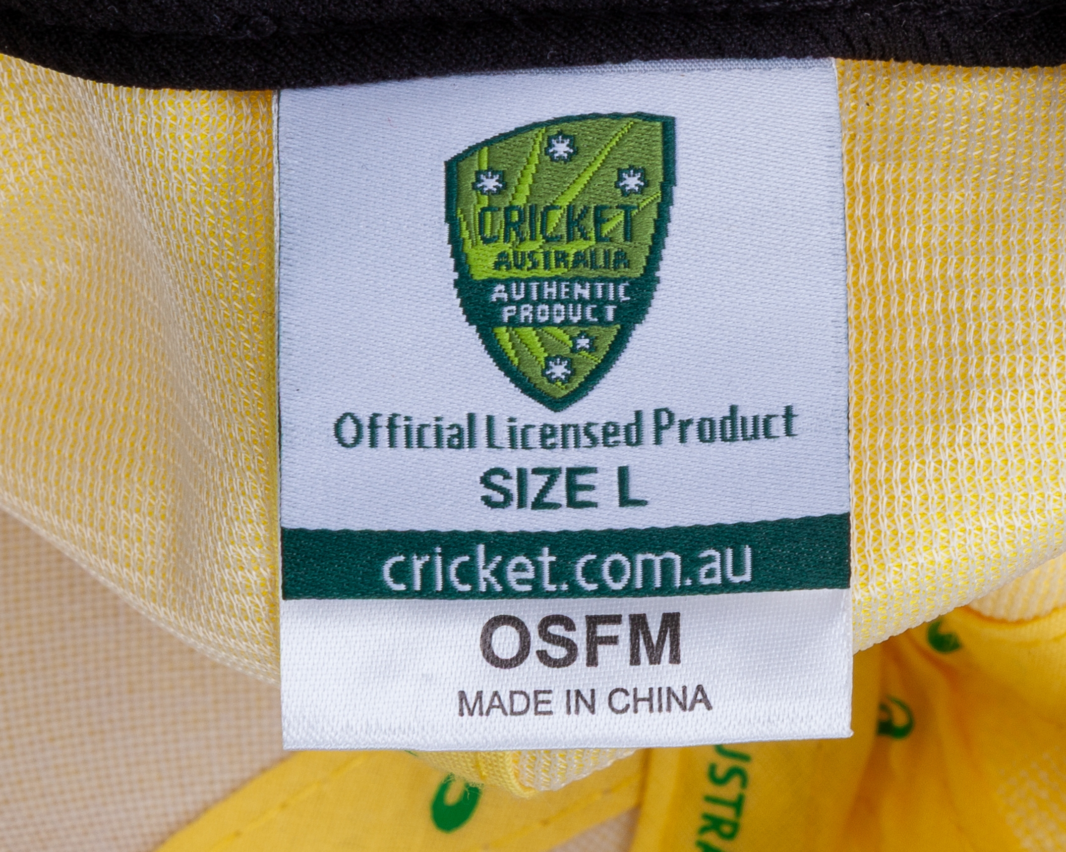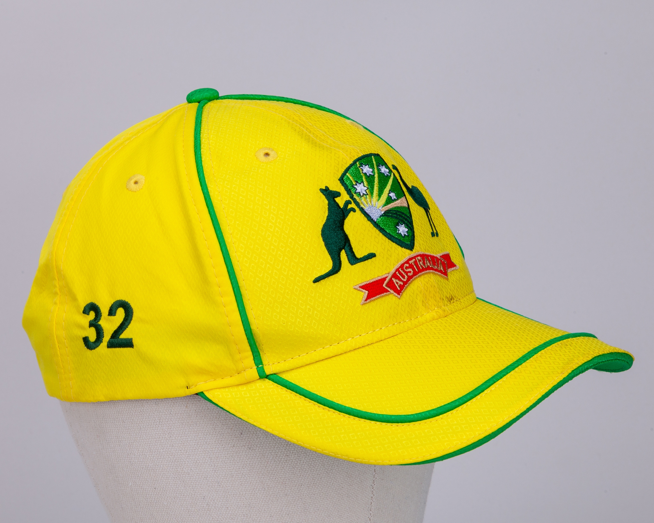 David Warner yellow and green Australia v. England T20 series playing cap, 2020, Asics, L, with embroidered badge inscribed AUSTRALIA 32