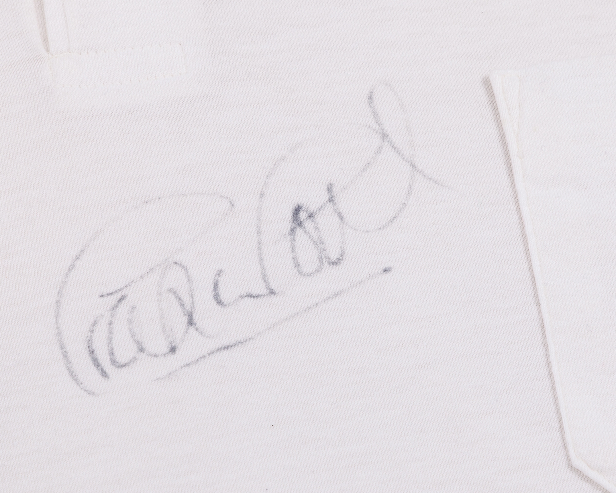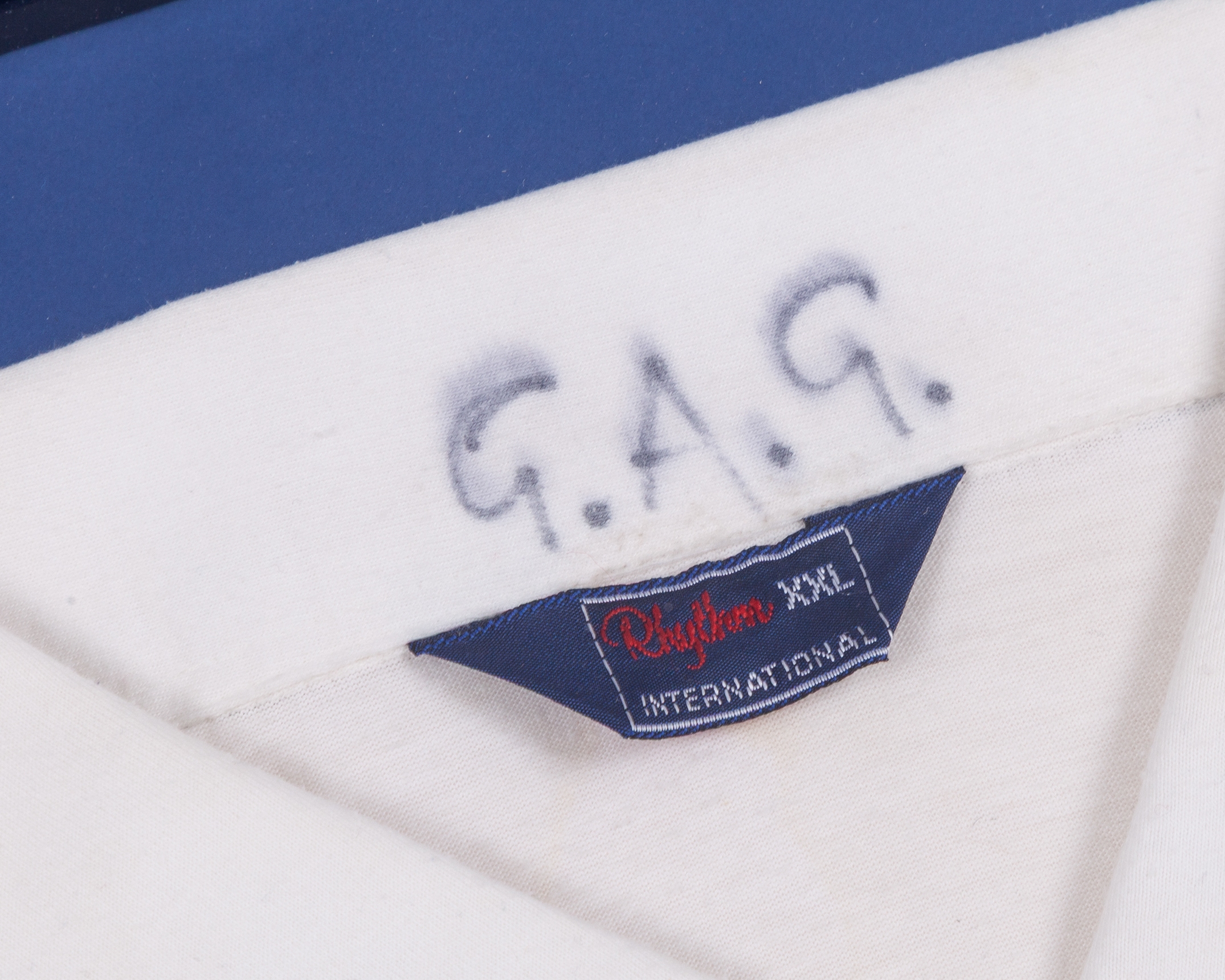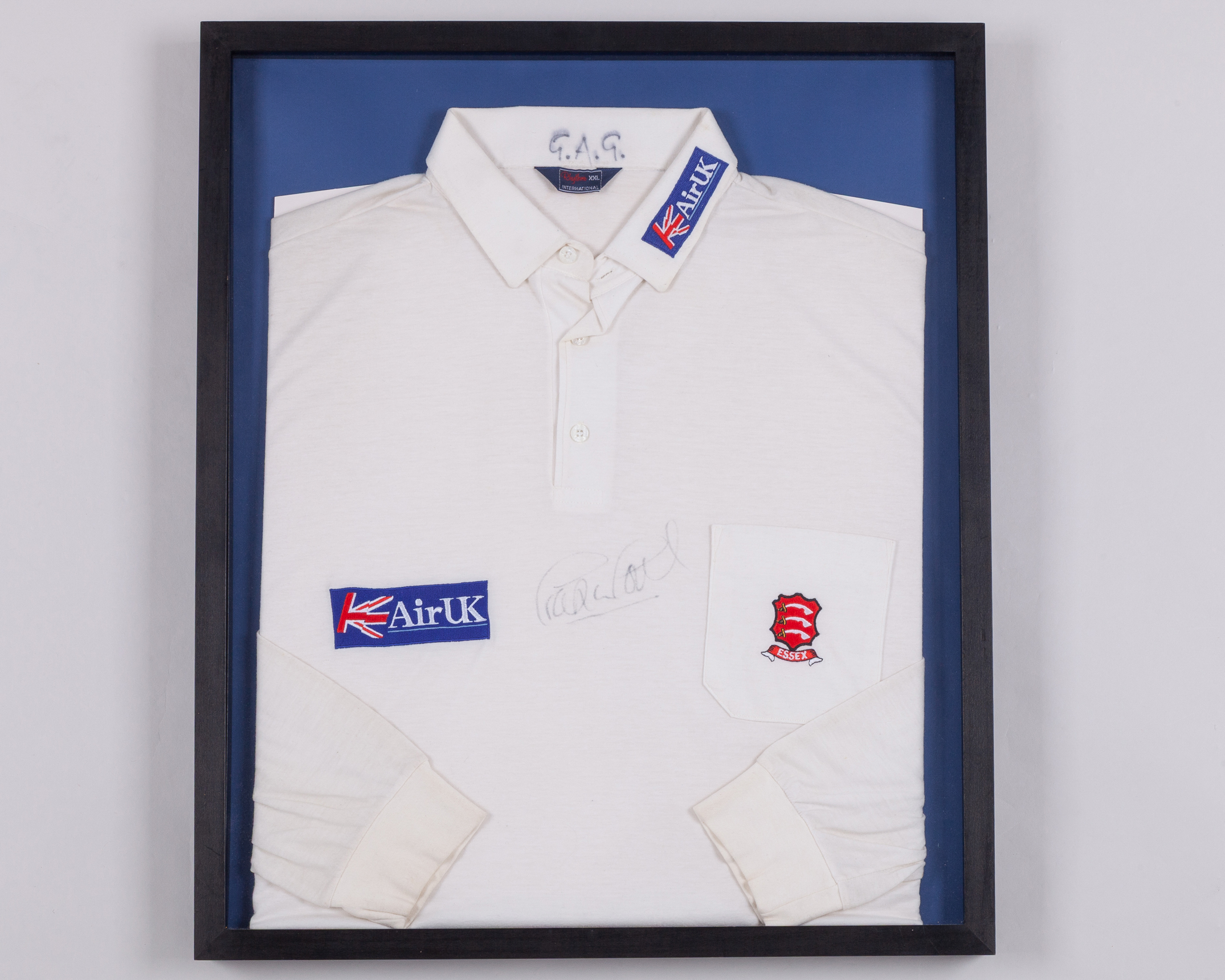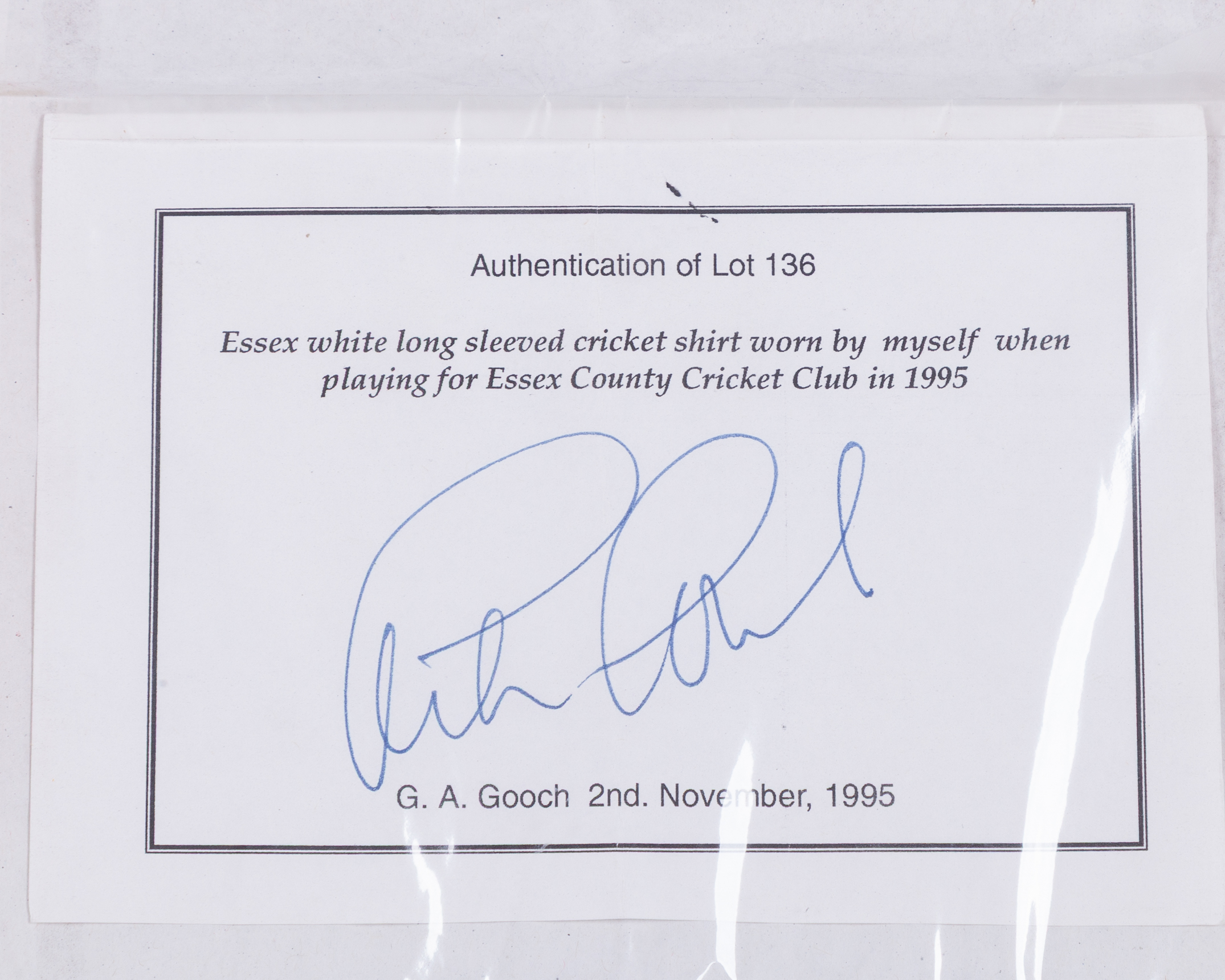 Graham Gooch Essex C.C.C. worn and autographed long-sleeved cricket white, 1995, Rhythm International, XXL, with button-up collar and embroidered badge inscribed ESSEX, autographed on the front and initialed in ink on the collar G.A.G., with COA signed by Graham Gooch and labelled lot 136 in an auction held 2nd November 1995, framed, 23 x 63cm
