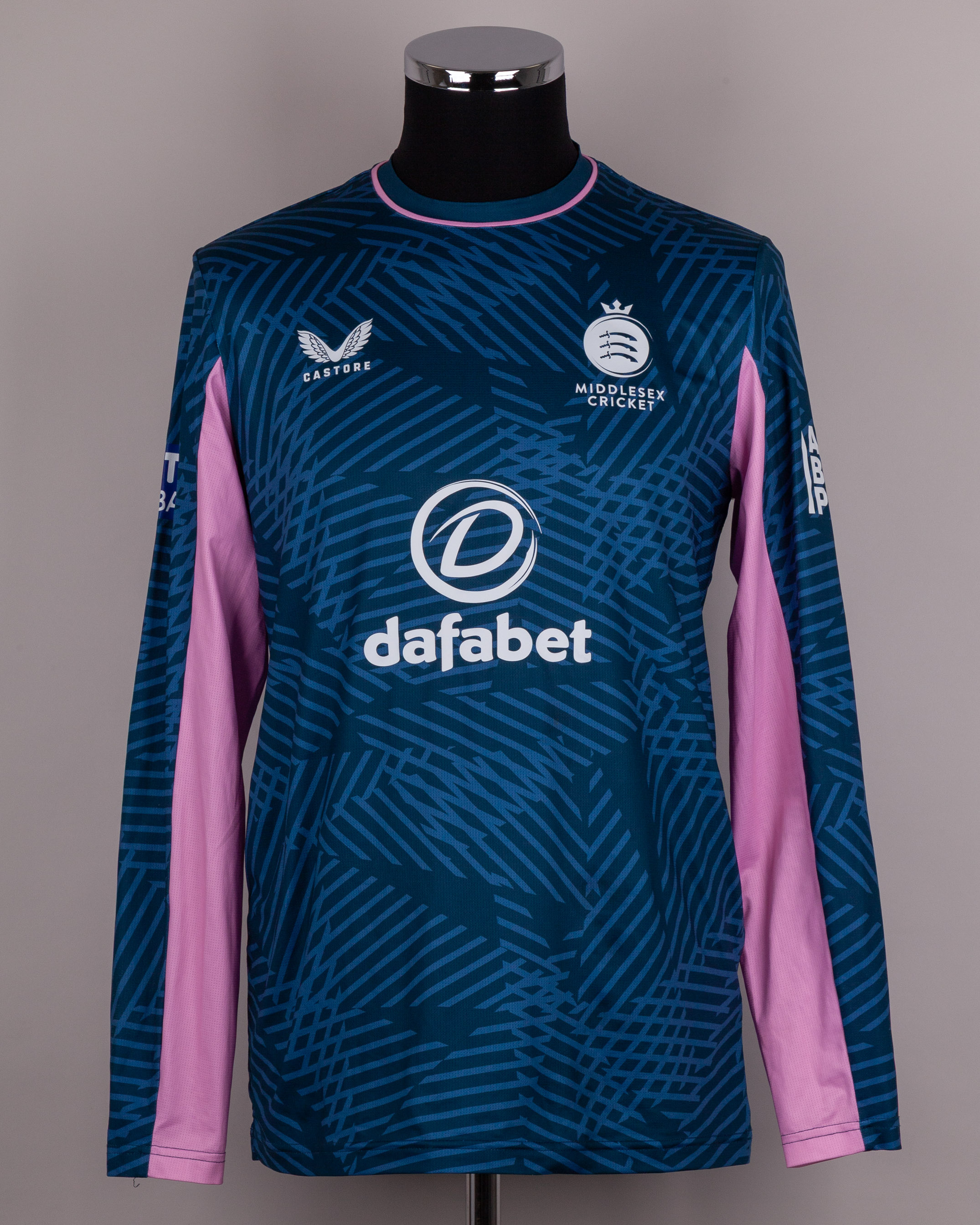 Jack Davies Middlesex CCC No.17 match worn shirt v. Lancashire, Metro Bank One Day Cup, 26th August 2025, Castore, gibraltar sea and pink trim long sleeved with club crest decal, autographed on number