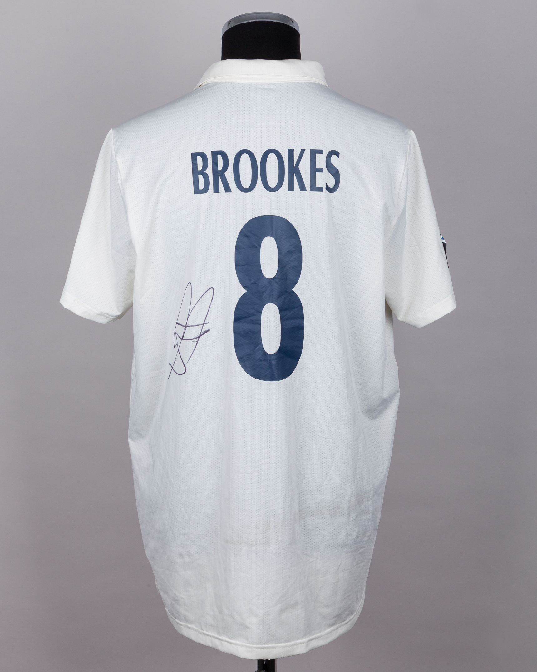Henry Brookes Middlesex CCC No.8 match issued white short-sleeved shirt v. Gloucestershire CCC, played at Lord's on the 24th September 2025, Castore, with club crest decal, autographed on the rear of shirt