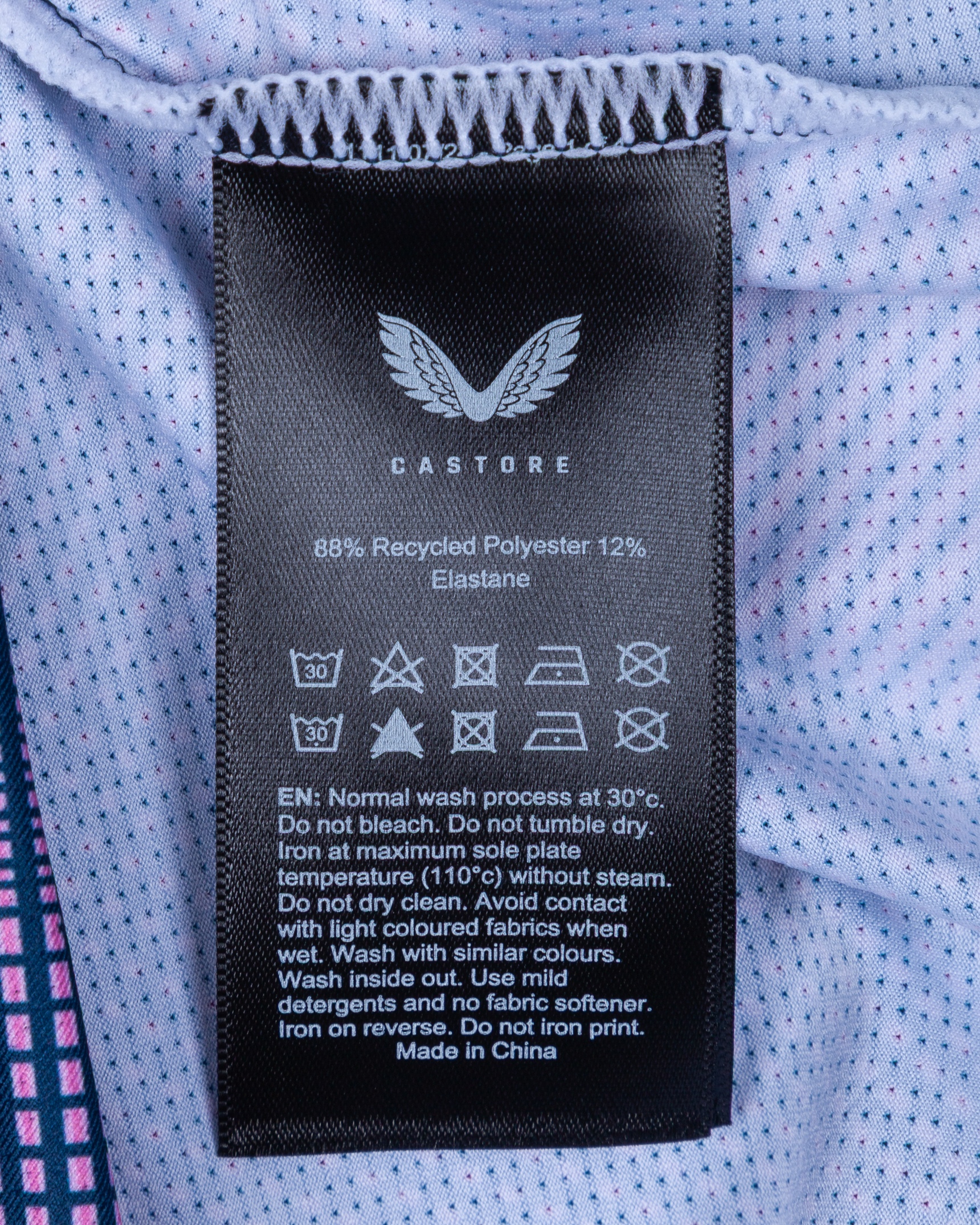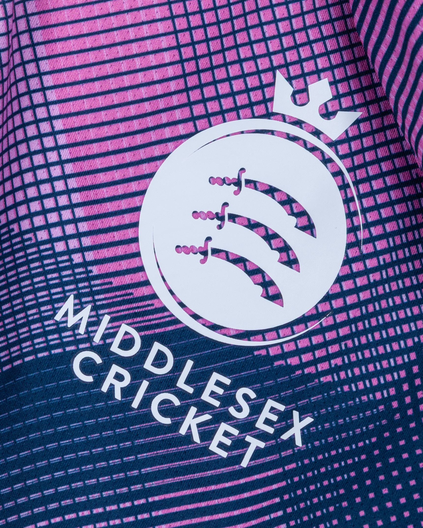 Noah Cornwell Middlesex CCC No.10 match worn shirt vs Surrey, T20 Vitality Blast, at Lords on 16th of July, 2025, Castore, gibraltar sea and pink frosting coloured long-sleeved with club crest decal, autographed on number