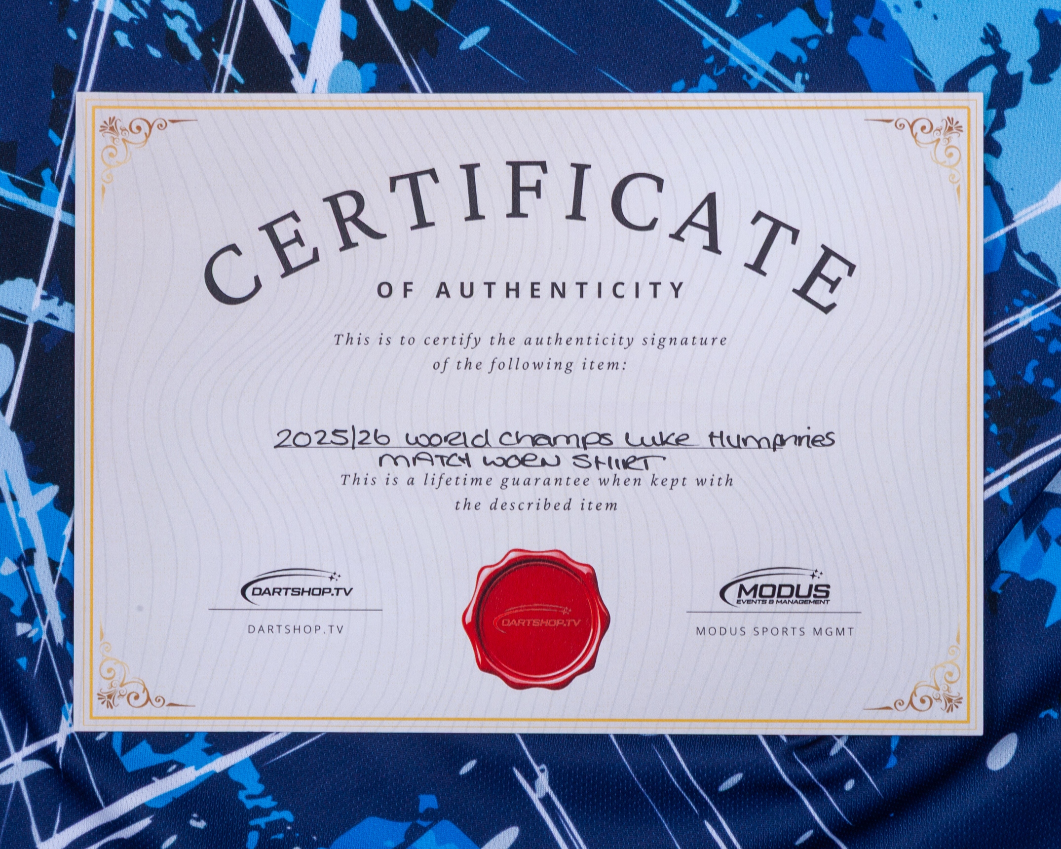 Straight from the oche, this shirt was worn by “Cool Hand” Luke Humphries during his Round 2 match at the 2025/26 PDC World Darts Championship.