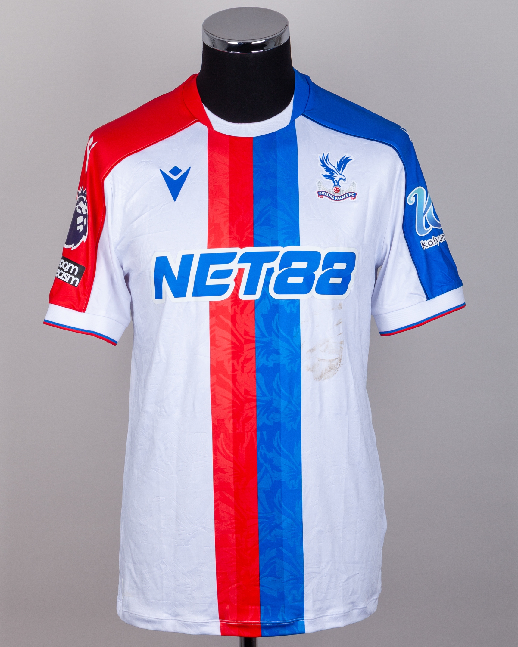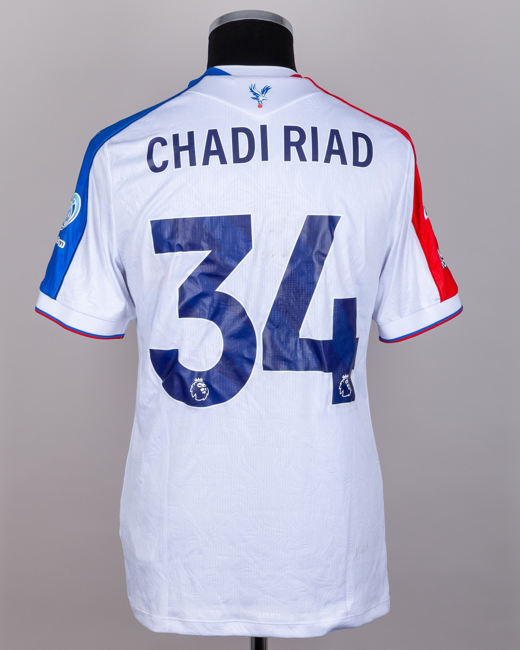 Chadi Riad No.34 Crystal Palace v. Nottingham Forest (Away) match worn short-sleeved shirt, Premier League 2026, Macron, with crew-neck collar and printed badge, the reverse lettered CHADI RIAD, the right sleeve with Premier League logo