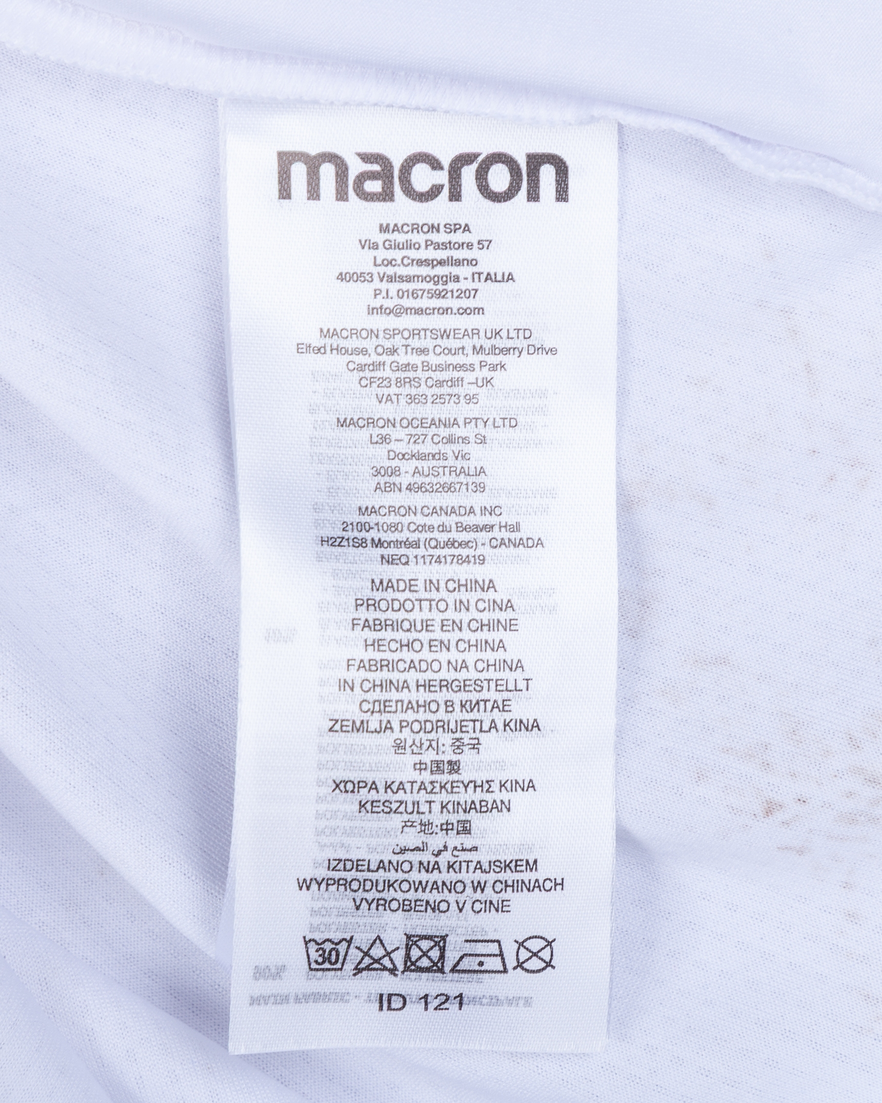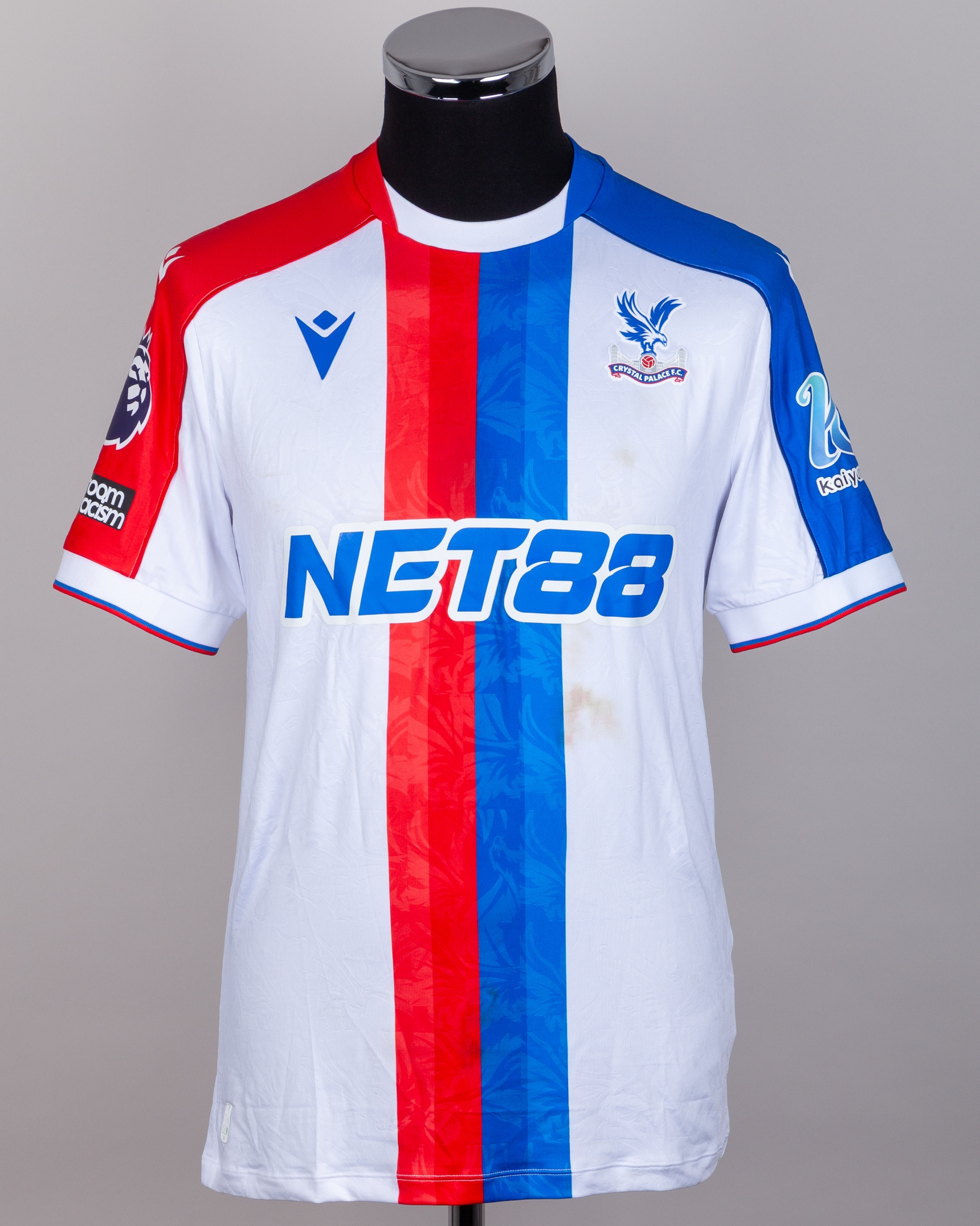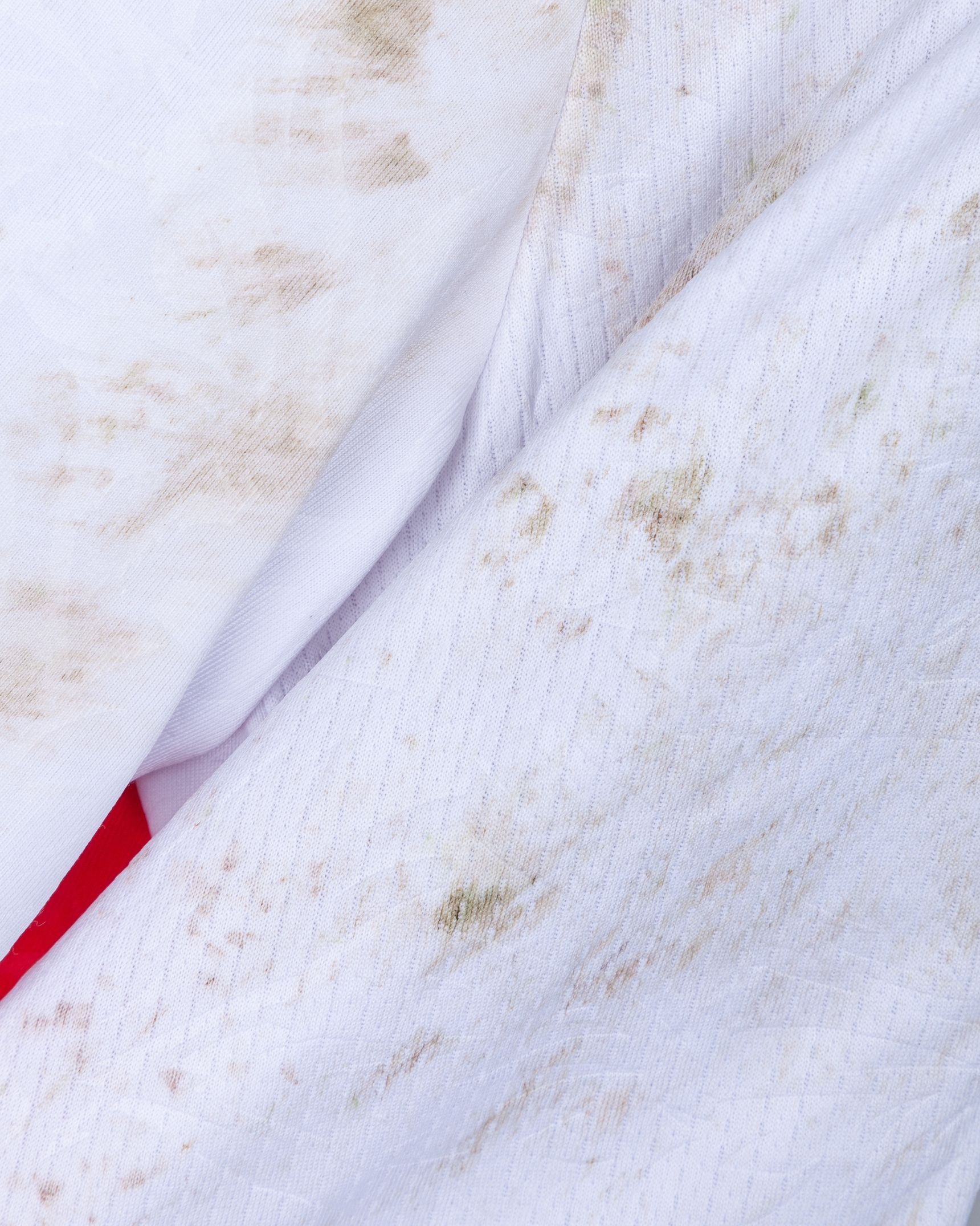 The shirt is match worn and unwashed with staining on front and rear