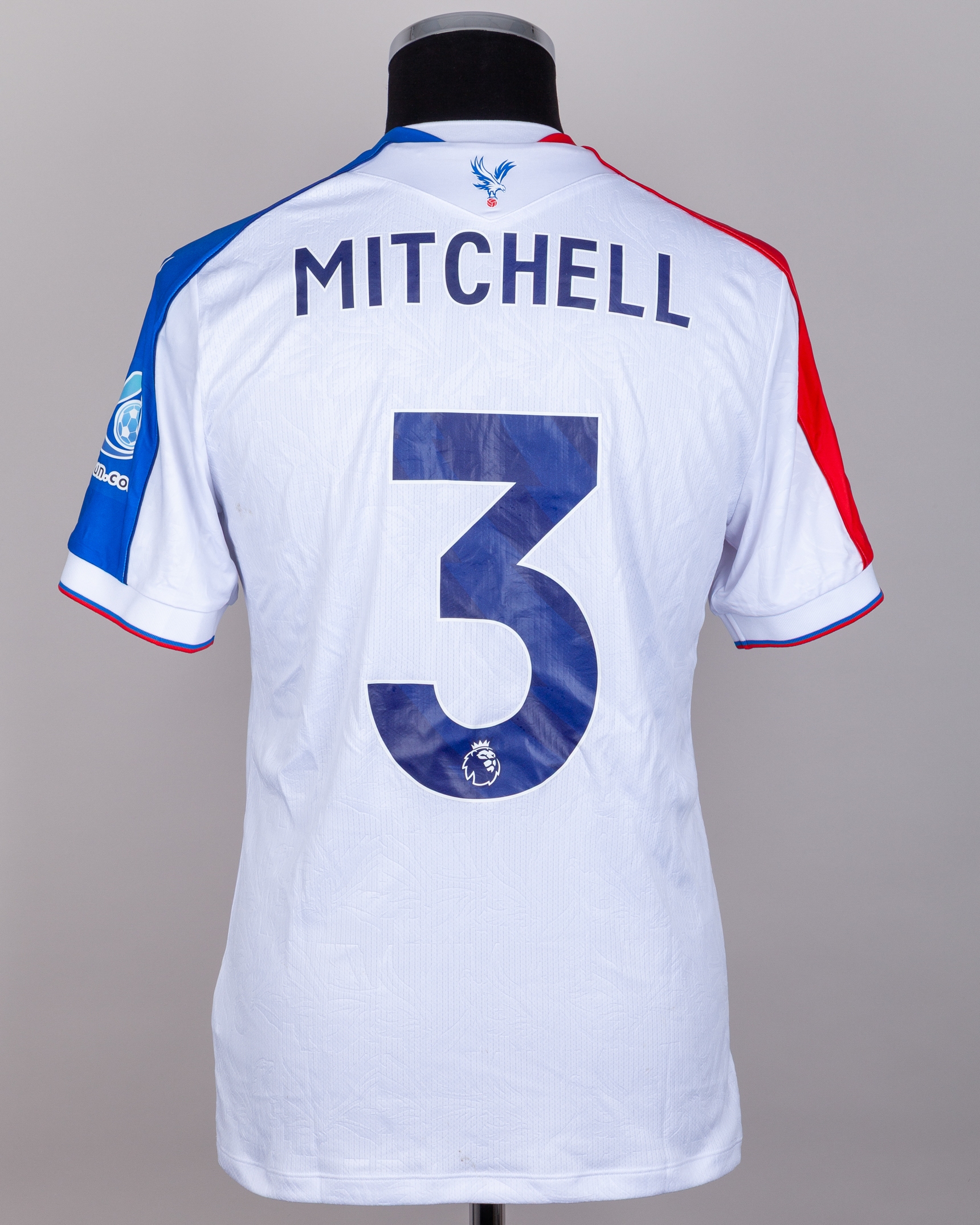 Tyrick Mitchell No.3 Crystal Palace v. Nottingham Forest (Away) match worn shirt, Premier League 2026, Macron, with crew-neck collar and printed badge, the reverse lettered MITCHELL, the right sleeve with Premier League logo