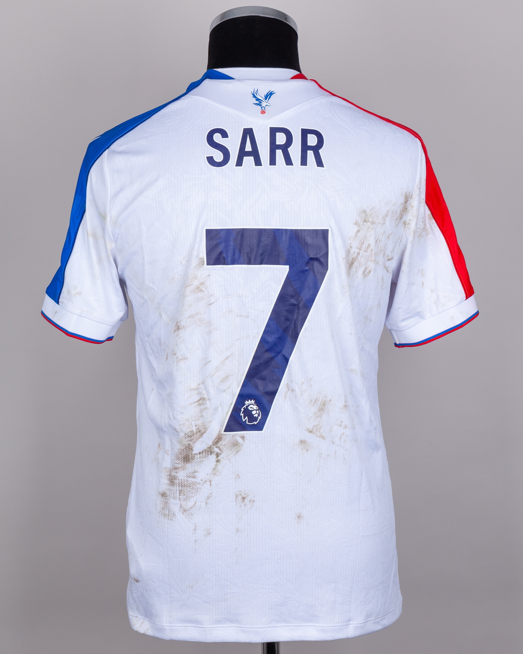 Ismaïla Sarr No.7 Crystal Palace v. Nottingham Forest (Away) match worn short-sleeved shirt, Premier League 2026, Macron, with crew-neck collar and printed badge, the reverse lettered SARR, the right sleeve with Premier League logo