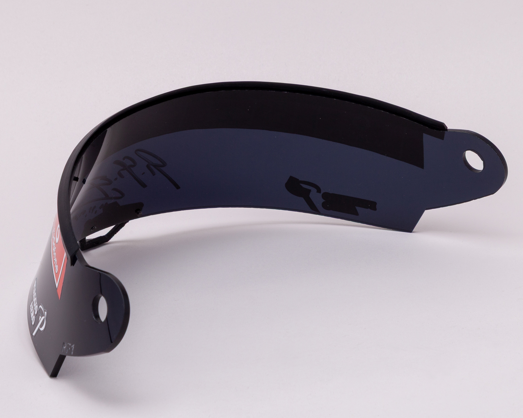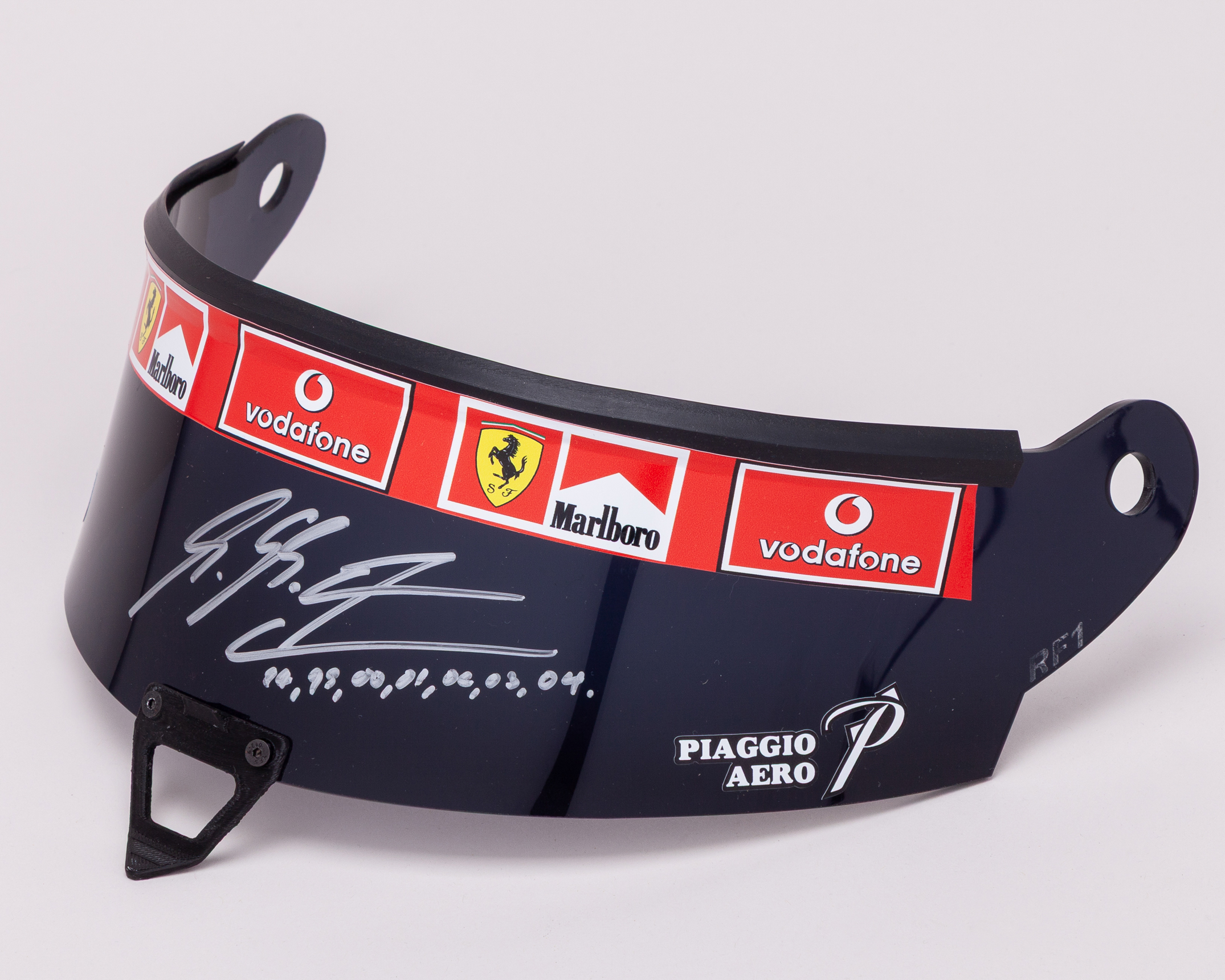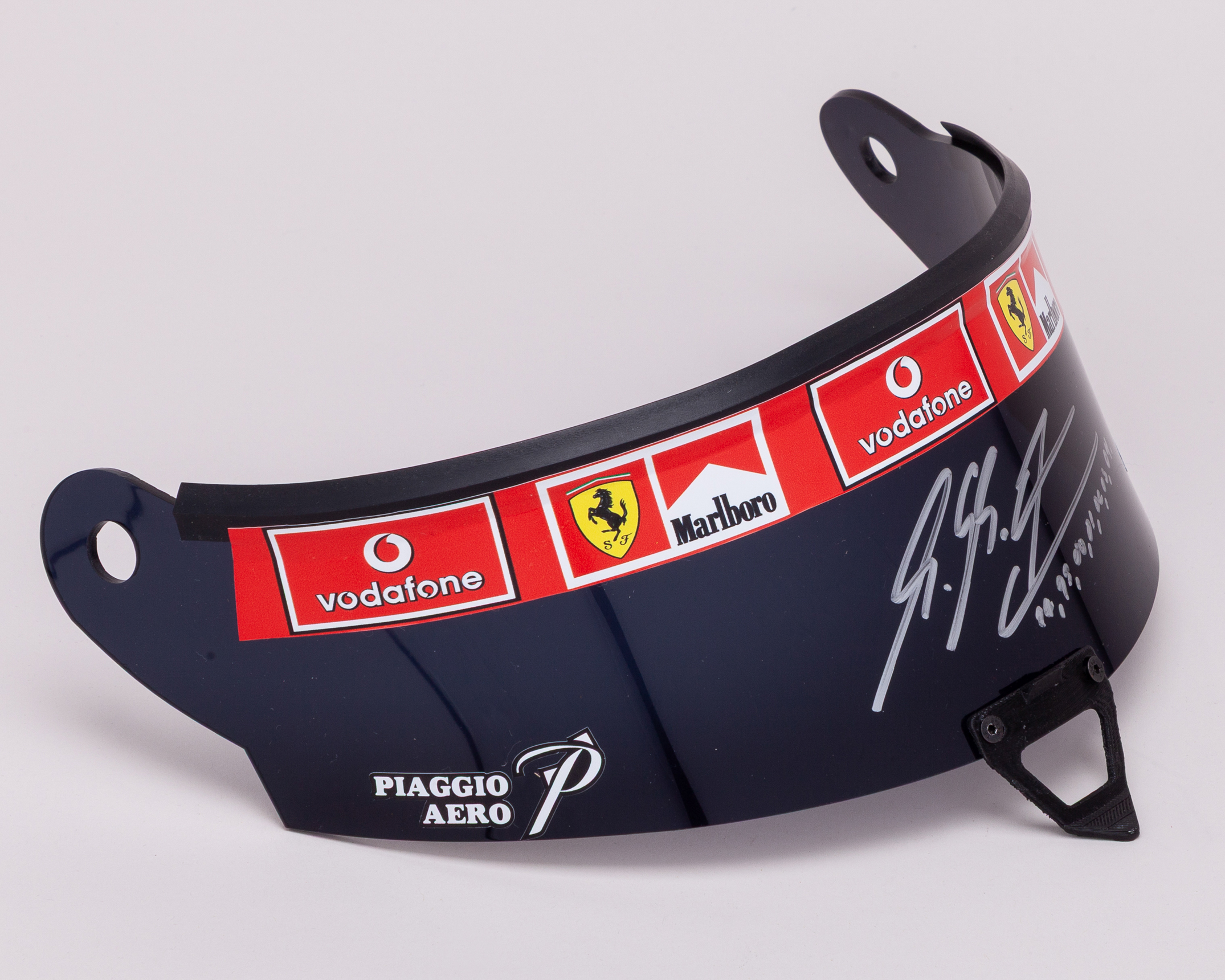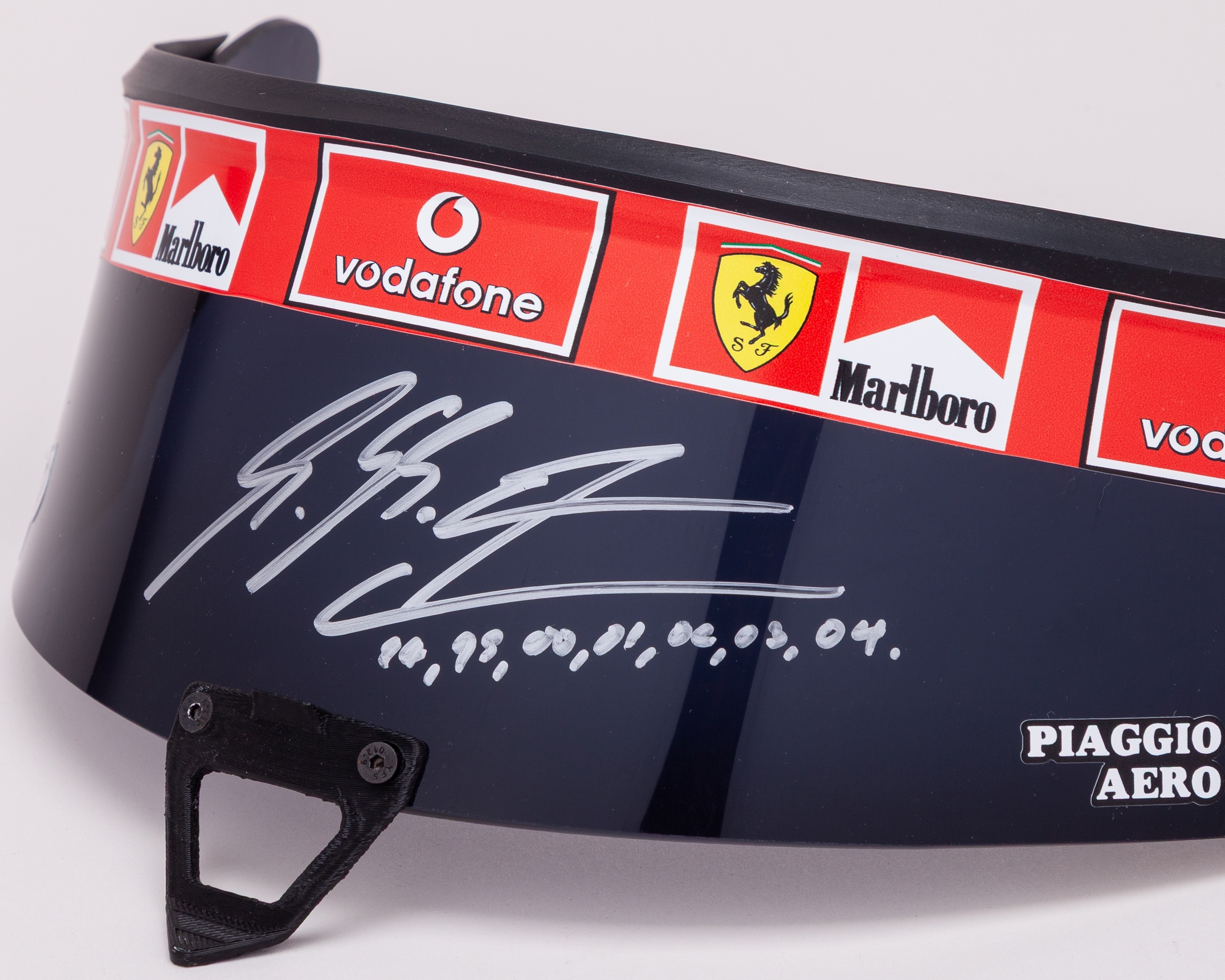 This is a replica Ferrari visor, personally hand signed and dated by 7-time F1 World Champion, Michael Schumacher.