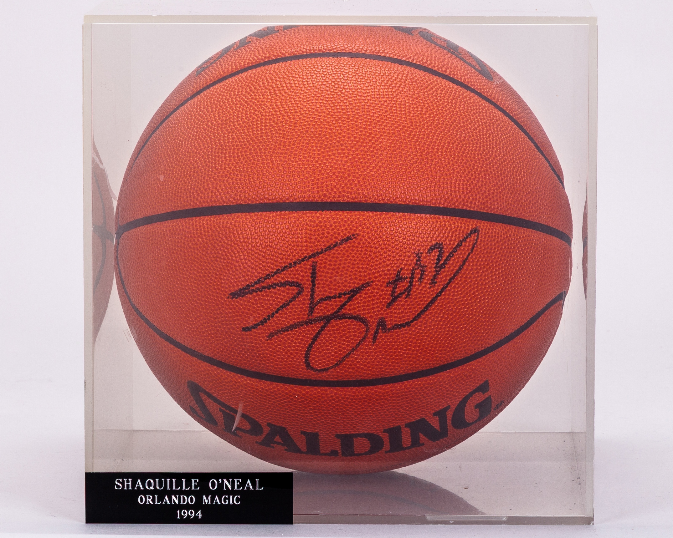 A Spalding basketball autographed by Shaquille O'Neal, in perspex case, with plaque (loose) inscribed Shaquille O'Neal Orlando Magic 1994
