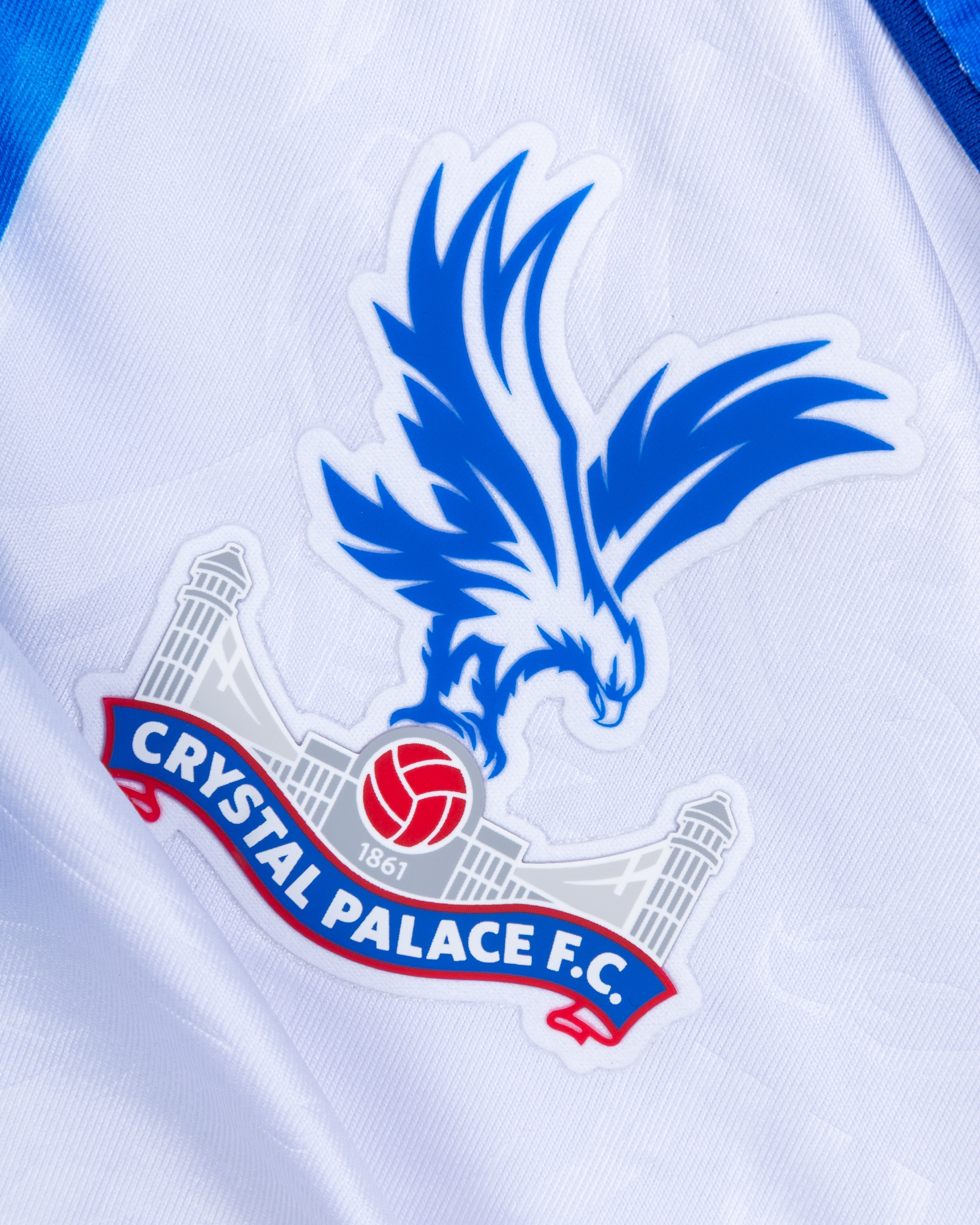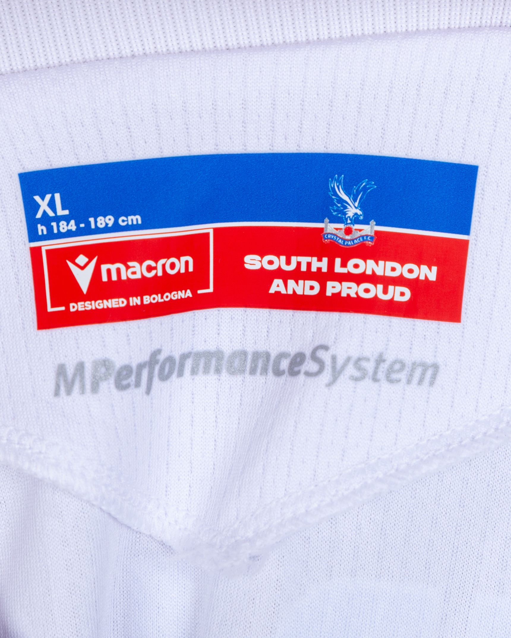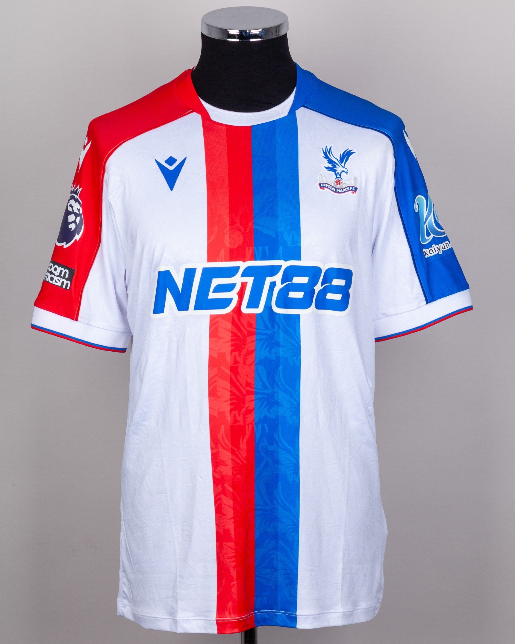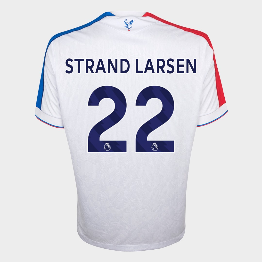 Jørgen Strand Larsen No.22 Crystal Palace v. Manchester United (Away) match-worn short-sleeved Premier League shirt 2026, Macron, with crew-neck collar and printed badge, the reverse lettered STRAND LARSEN, the right sleeve with Premier League logo