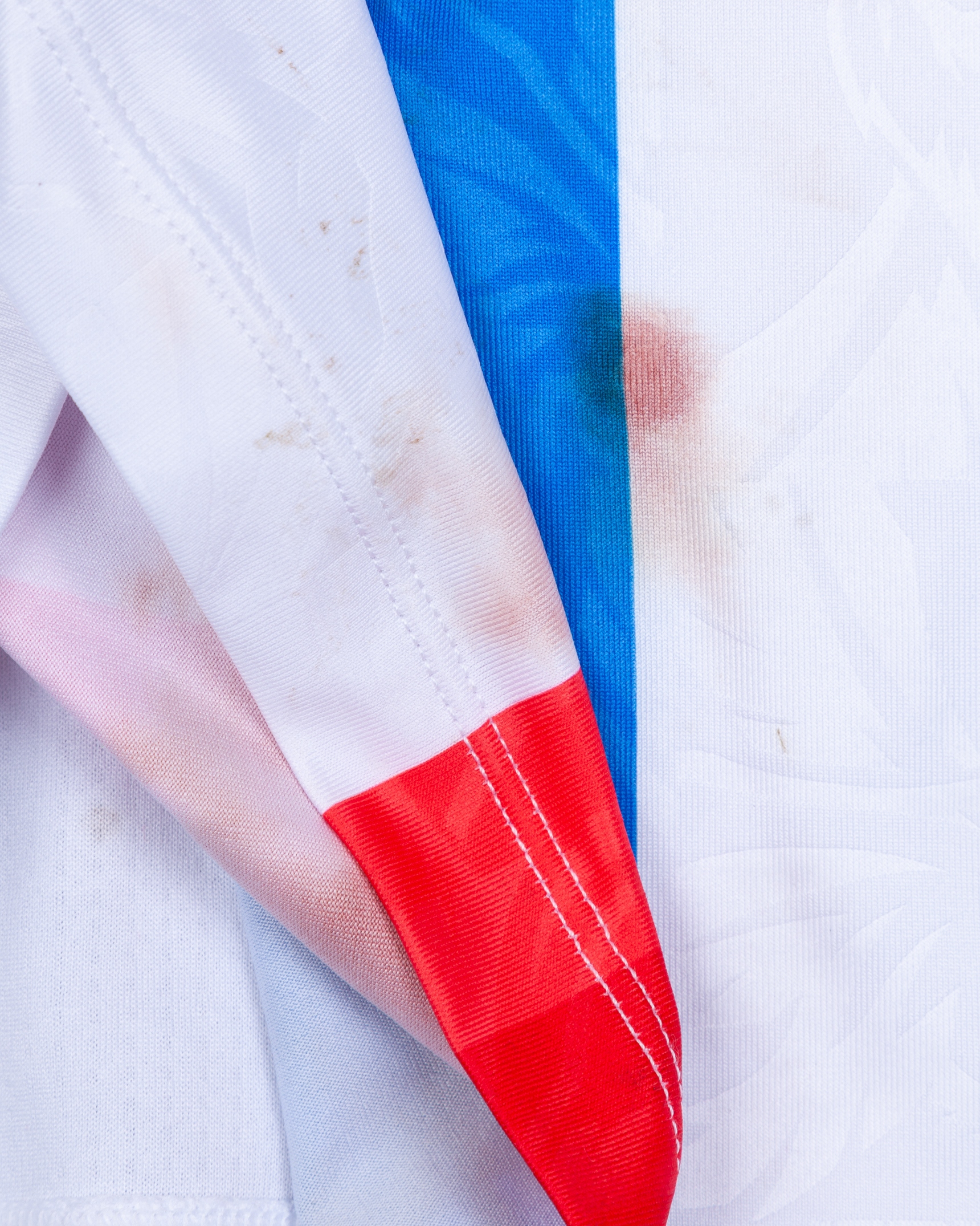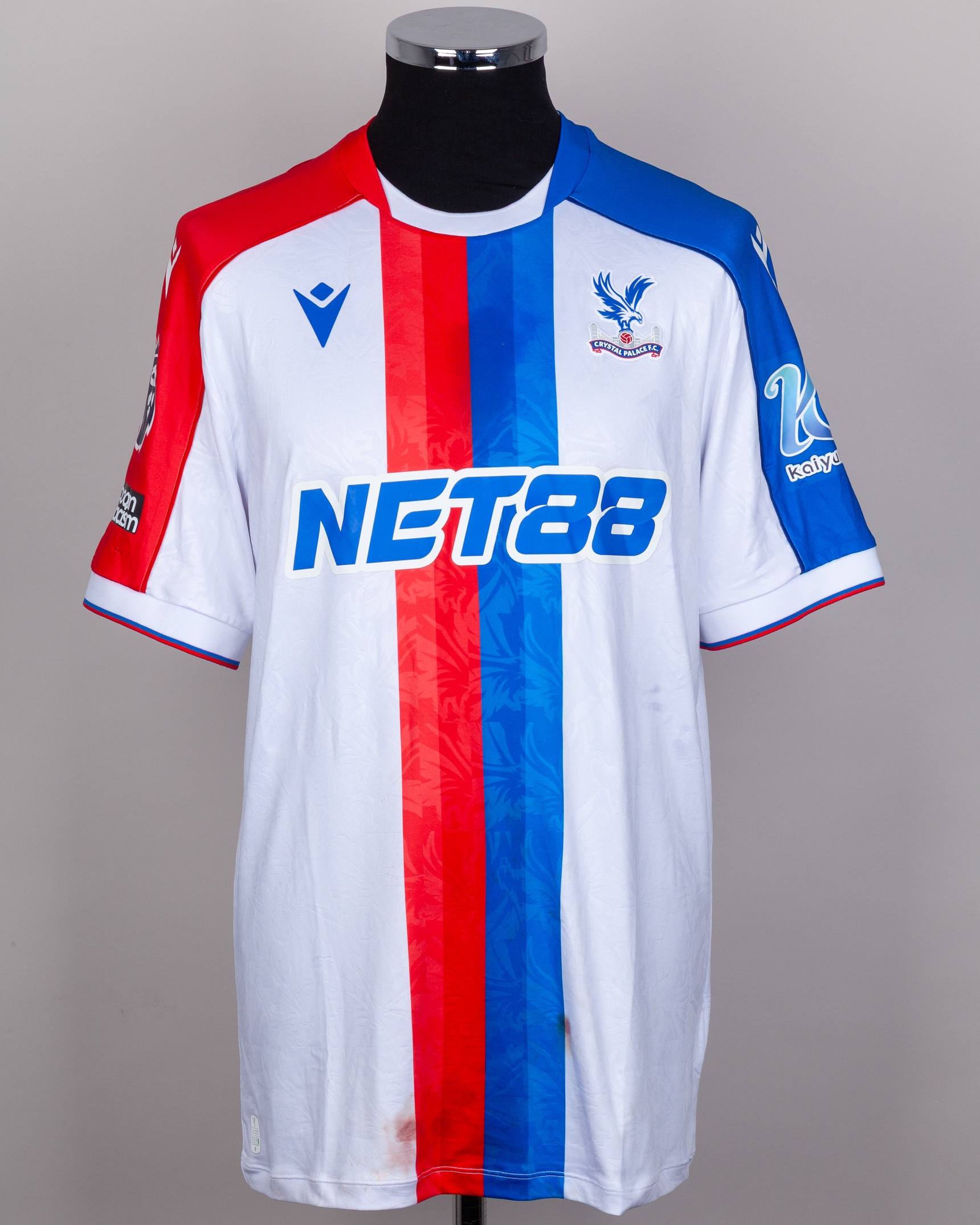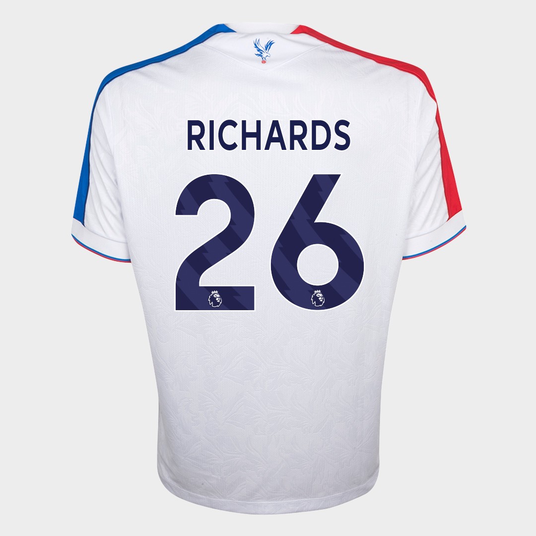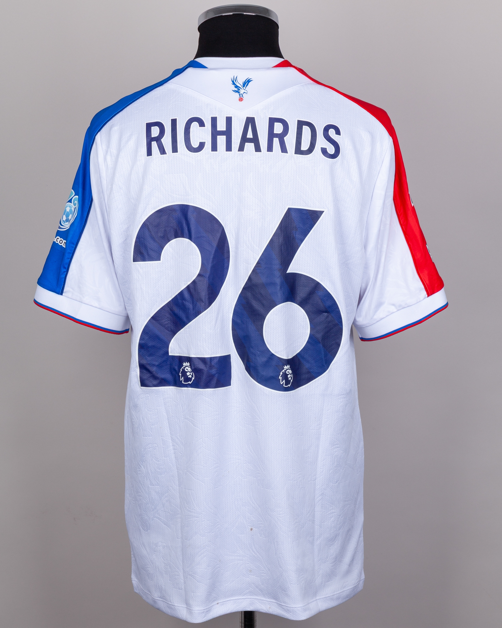 Chris Richards No.26 Crystal Palace v. Manchester United (Away) match-worn short-sleeved Premier League shirt 2026, Macron, with crew-neck collar and printed badge, the reverse lettered RICHARDS, the right sleeve with Premier League logo