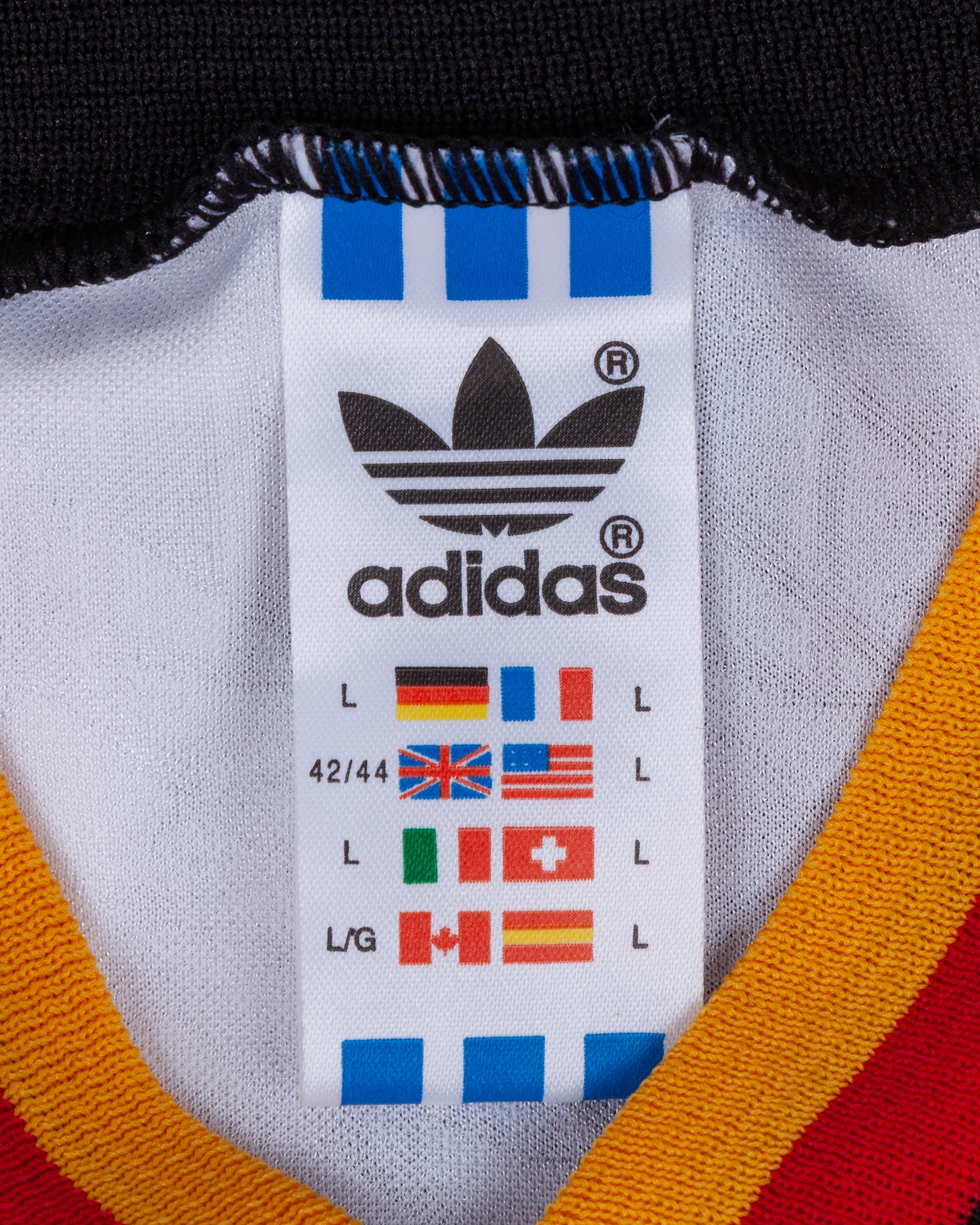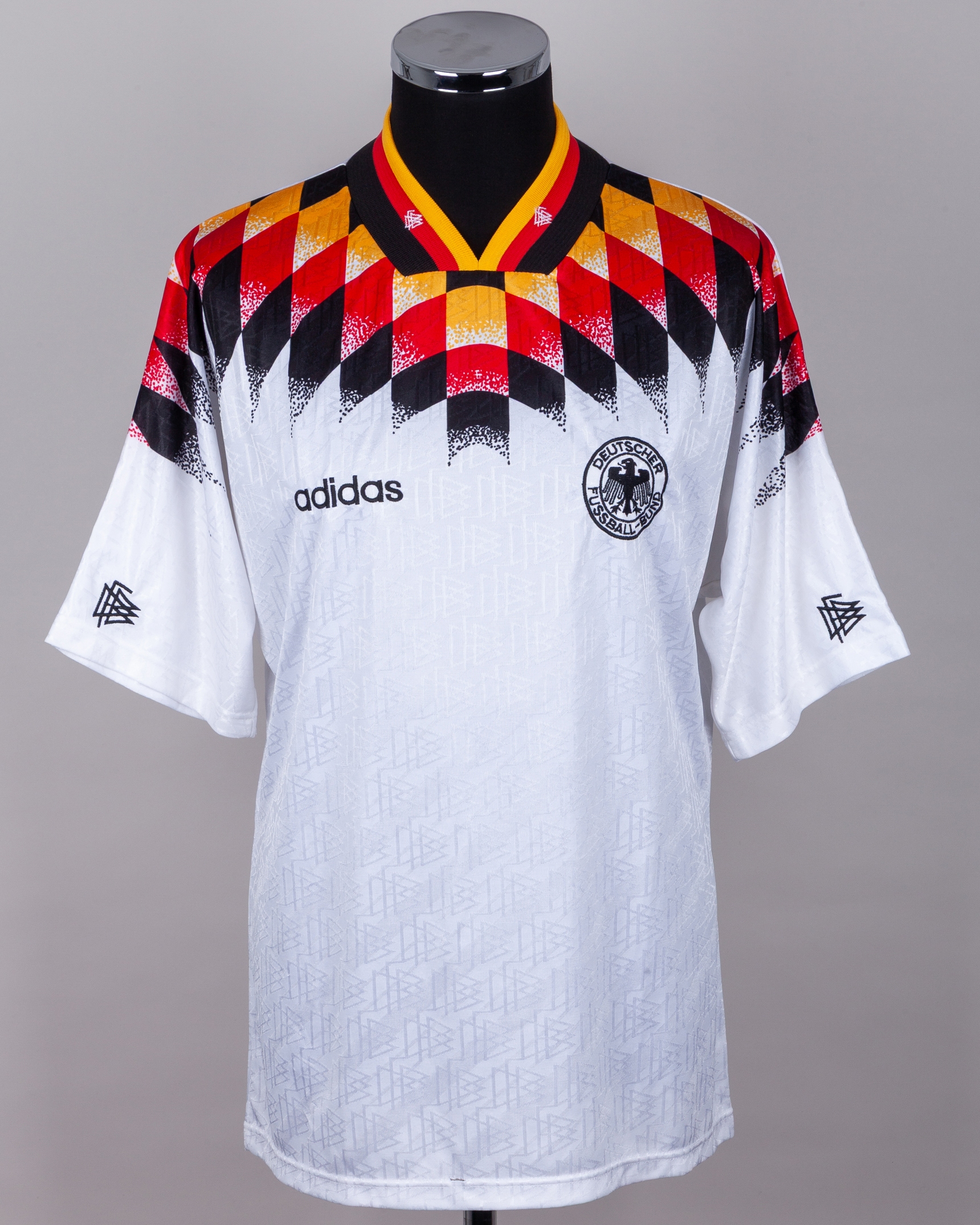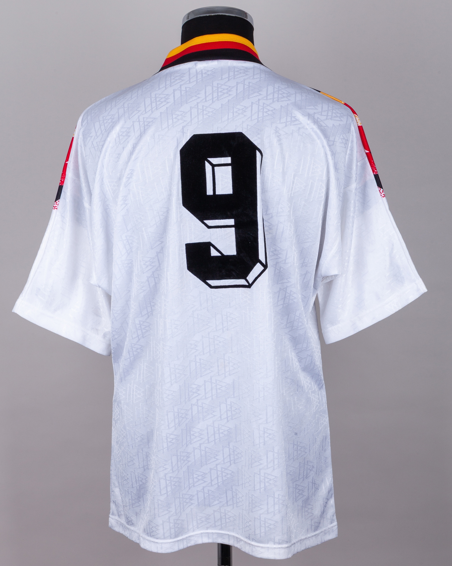 Jurgen Klinsmann white, black, red and yellow No.9 Germany v. Albania match worn short-sleeved shirt, 1994, Adidas, 42/44, with v-neck collar and embroidered badge inscribed DEUTSHER FUSSBALL-BUND, with letter of provenance, with a small tear to the lower seam