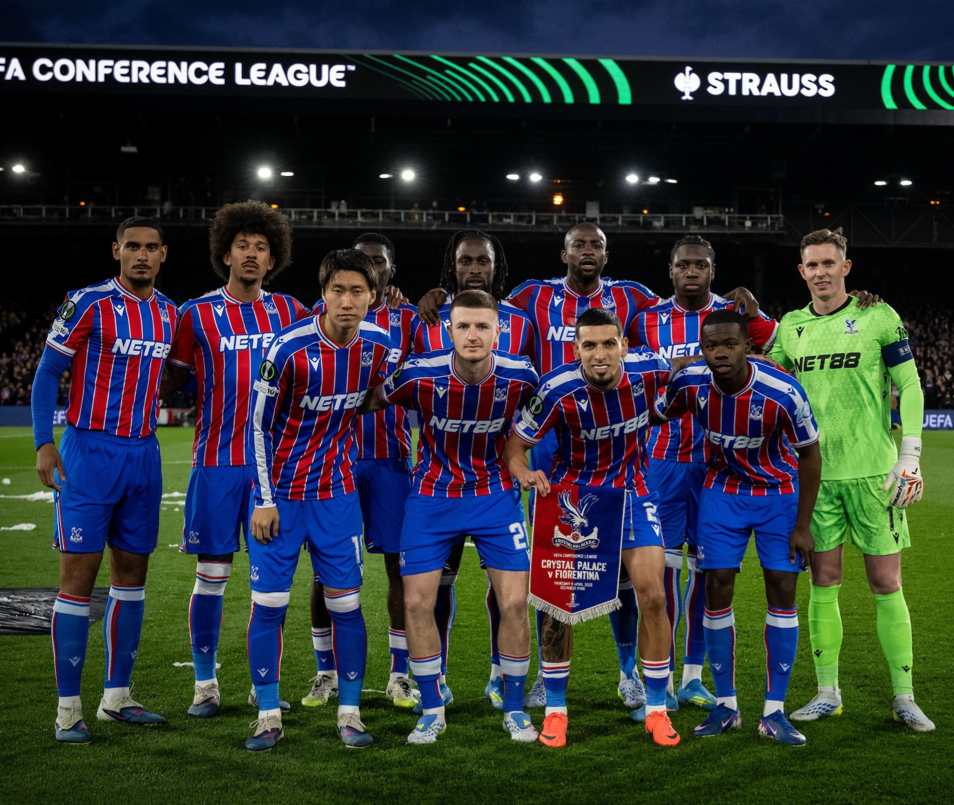 Crystal Palace v. Fiorentina match issued squad signed shirt, UEFA Conference League - Quarter Final 2026, Macron, with crew-neck collar and printed badge, the right sleeve with UEFA flash