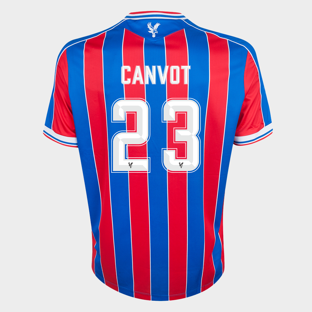 Jaydee Canvot No.23 Crystal Palace v. Fiorentina match worn shirt, UEFA Conference League - Quarter Final 2026, Macron, with crew-neck collar and printed badge, the reverse lettered CANVOT, the right sleeve with UEFA flash