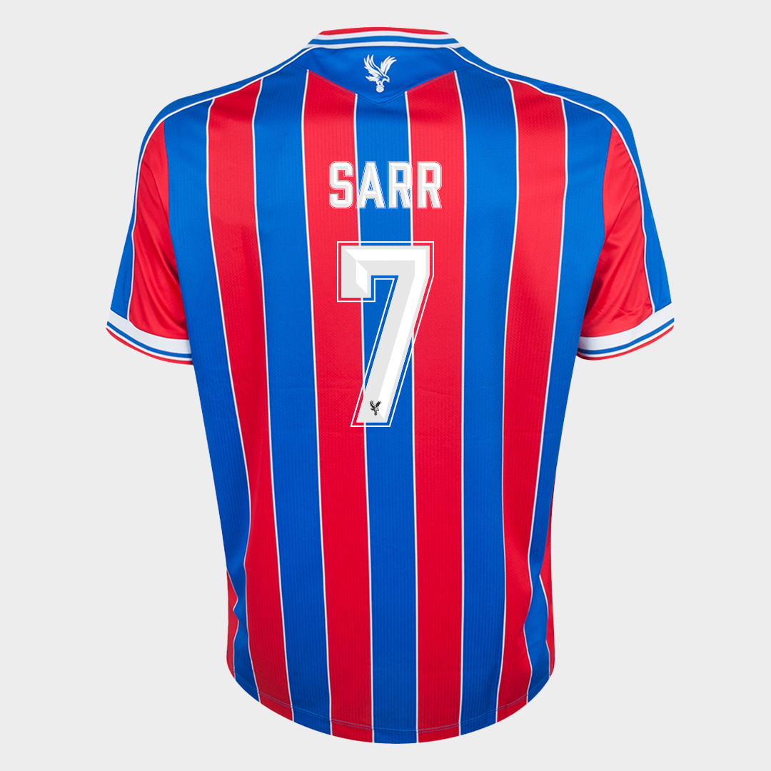 Ismaïla Sarr No.7 Crystal Palace v. Fiorentina match worn shirt, UEFA Conference League - Quarter Final 2026, Macron, with crew-neck collar and printed badge, the reverse lettered SARR, the right sleeve with UEFA flash