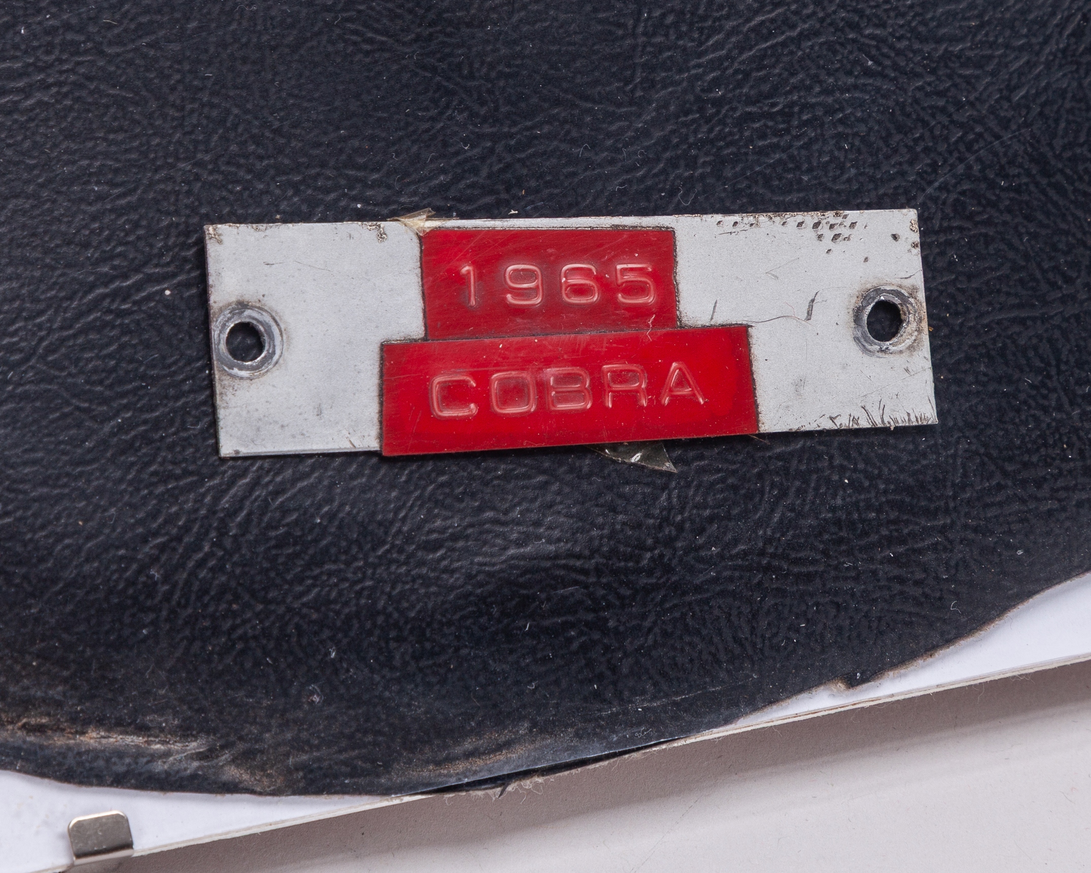 This is a black leather panel removed from a door panel of AC Cobra serial number CSX2532.