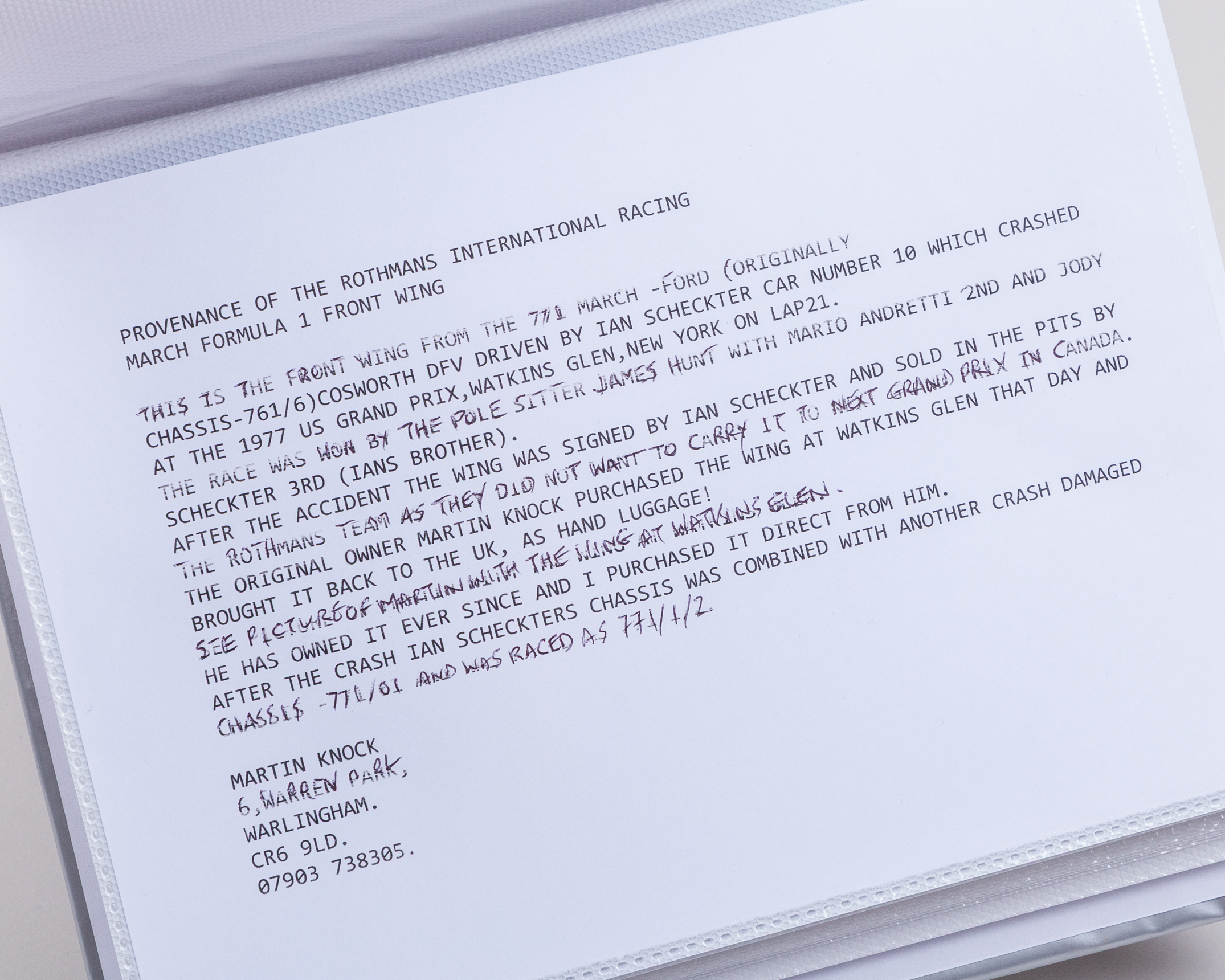 This is the front wing from the March 771, original chassis 761/6 driven by Ian Scheckter which crashed at the 1977 USA Grand Prix, Watkins Glen.