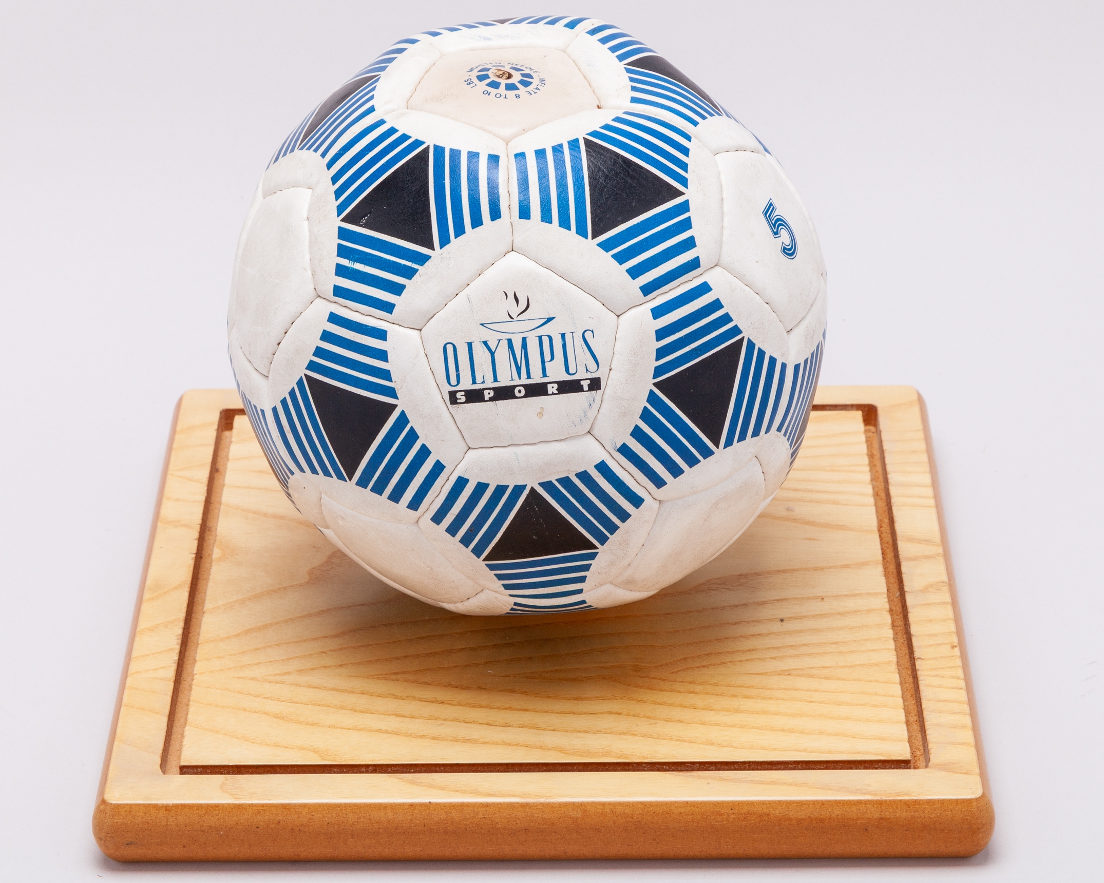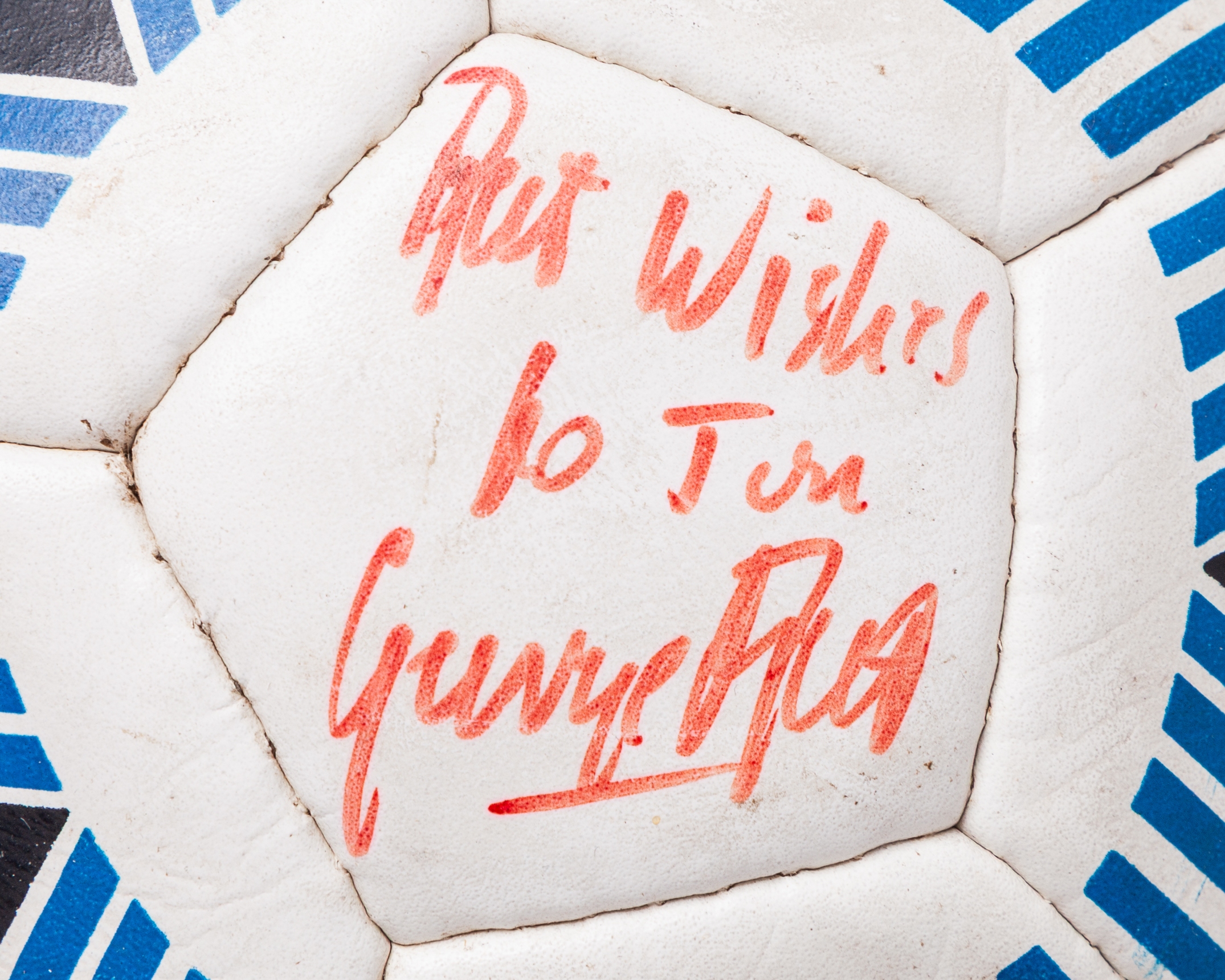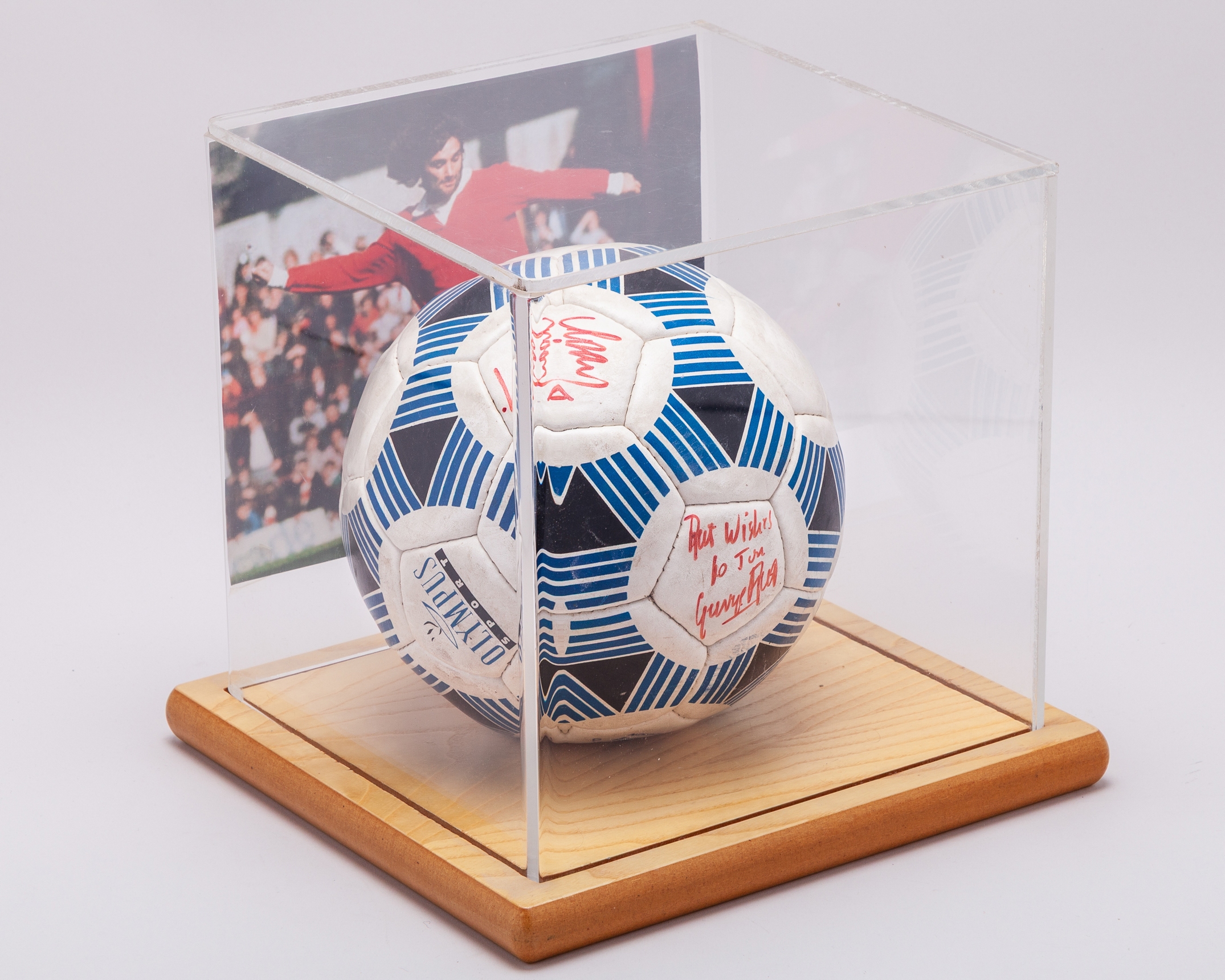 George Best autographed white, blue and black Olympus Sport football, autographed best wishes to (possibly Tim or Jim), with another autograph, in a display case with a colour photograph of Best, 28cm high