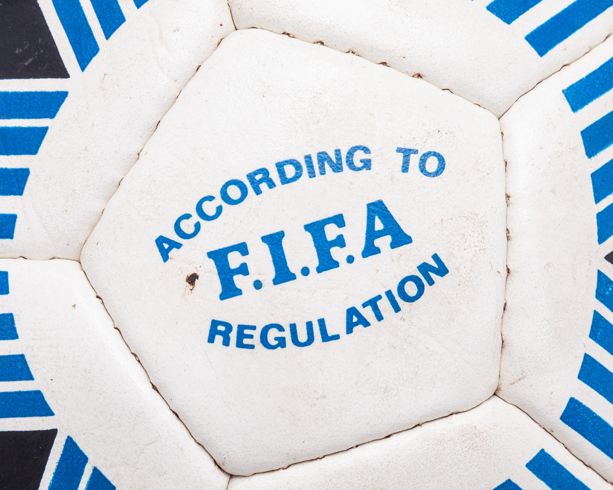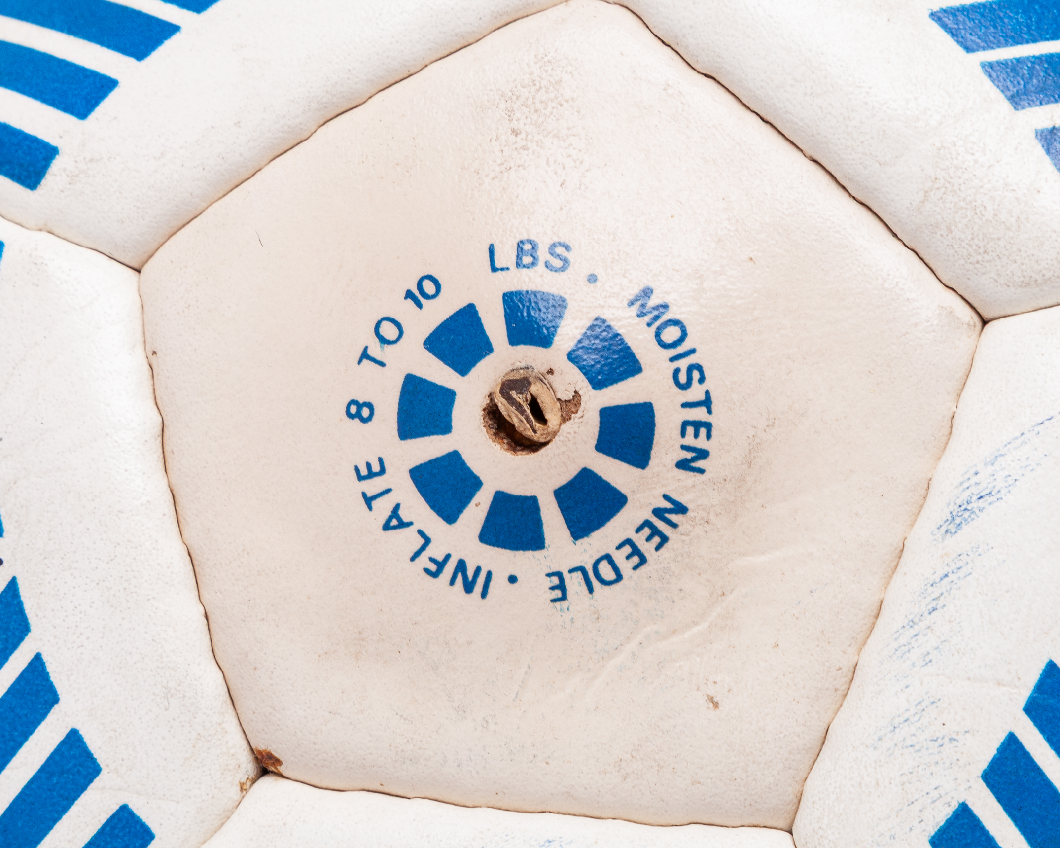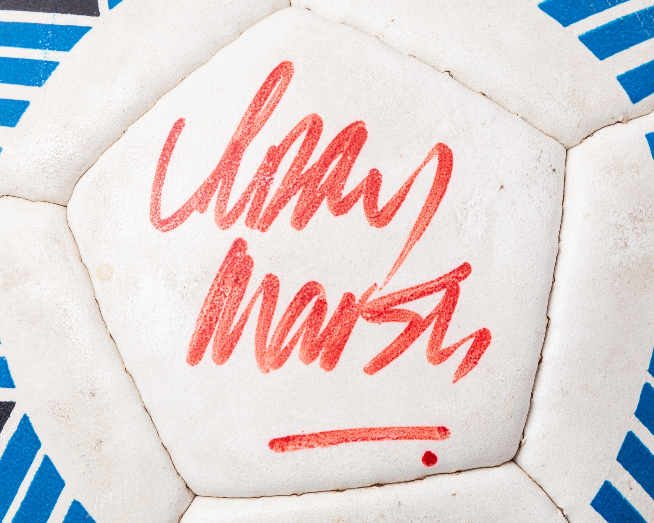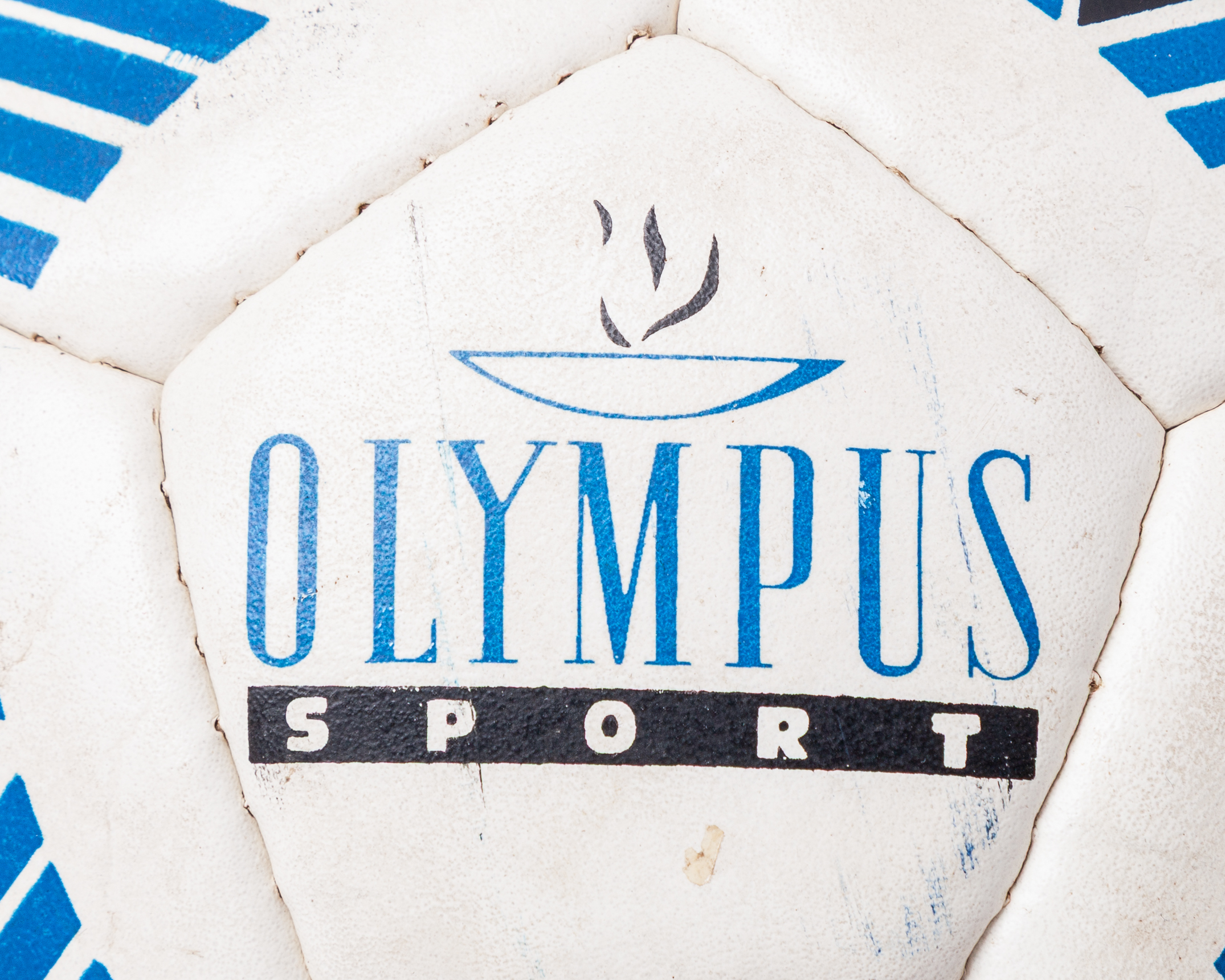 George Best autographed white, blue and black Olympus Sport football, autographed best wishes to (possibly Tim or Jim), with another autograph, in a display case with a colour photograph of Best, 28cm high