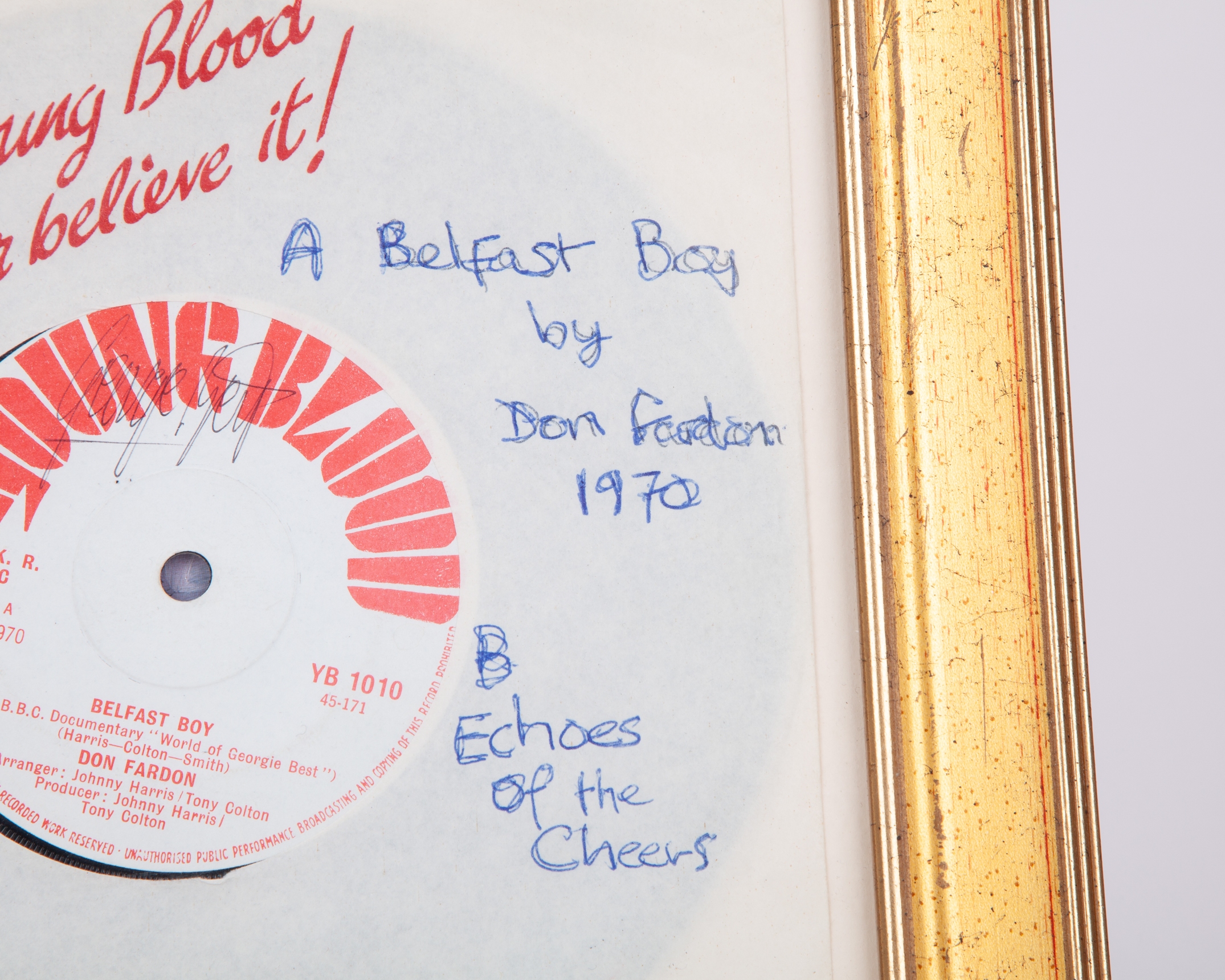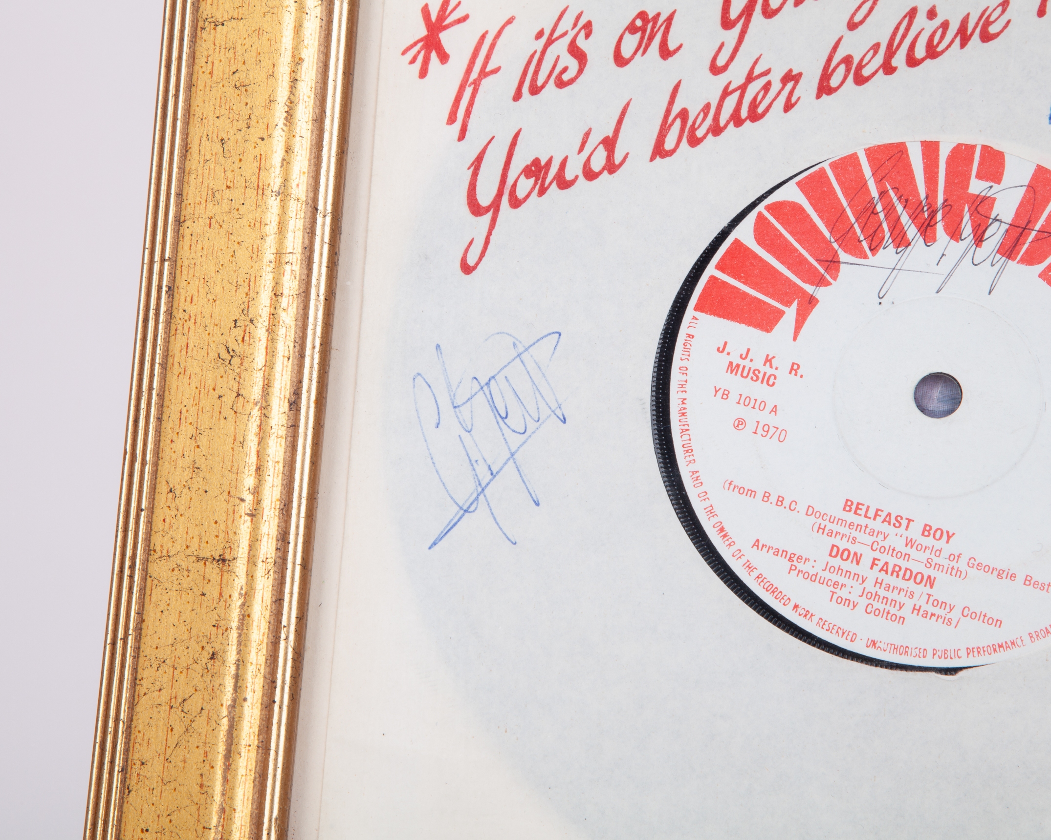George Best autographed Belfast Boy by Don Fardon 7in vinyl record, framed and glazed, 26 x 26cm