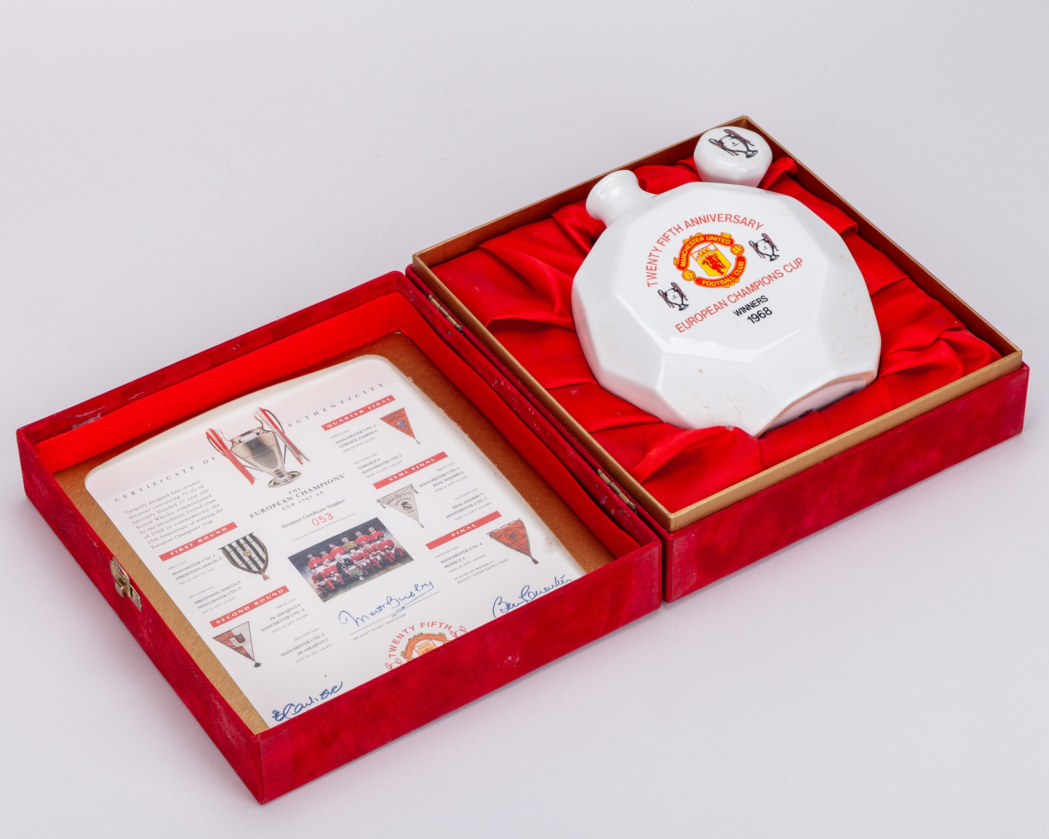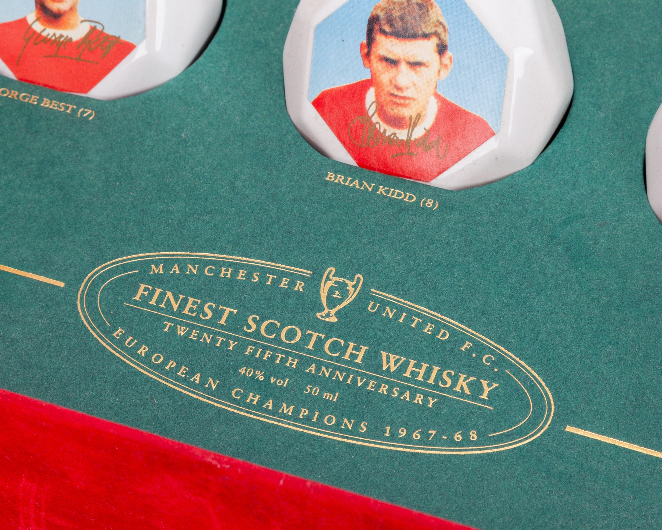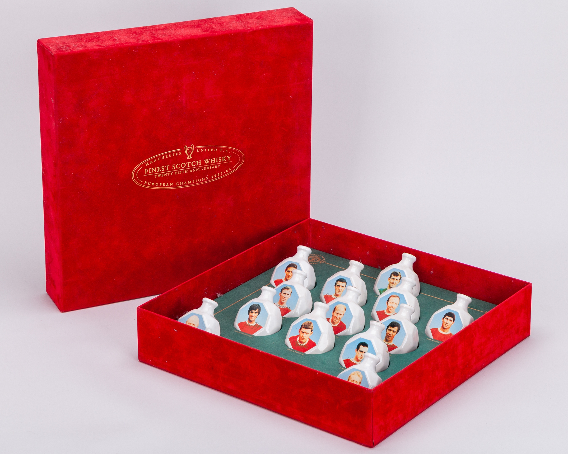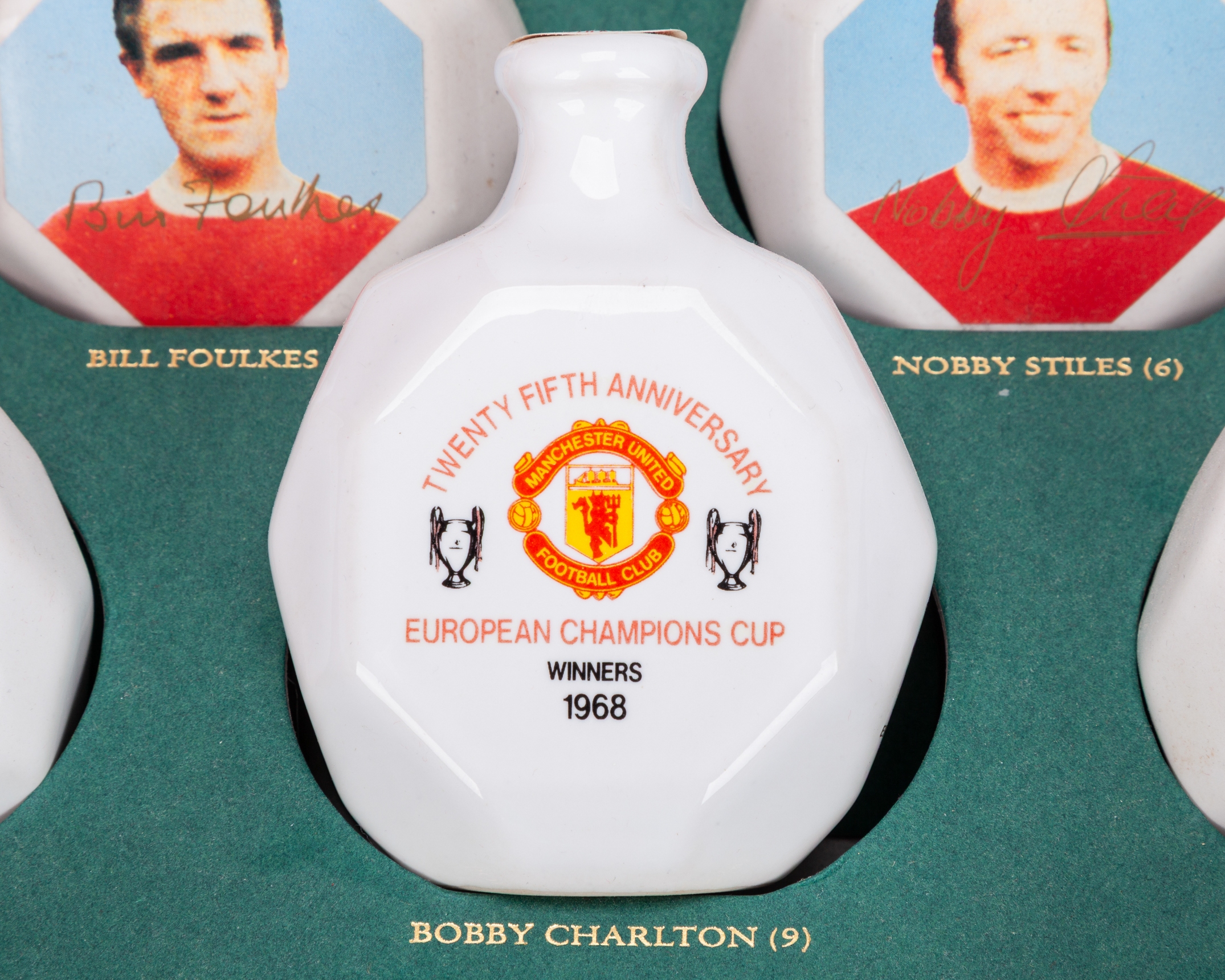 Manchester United case set of whiskey miniatures, to commemorate the 25th anniversary of winning the 1968 European Cup in original case, all with liquid present apart from seemingly Brian Kidd, case with minor marks and dirty, the similar whiskery decanter, full, No.053 of limited edition