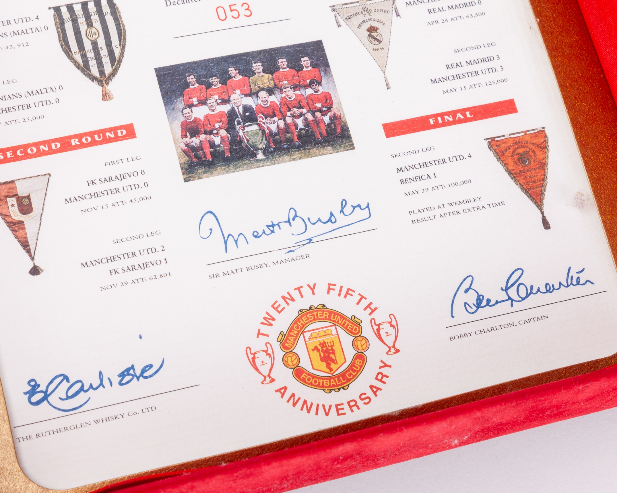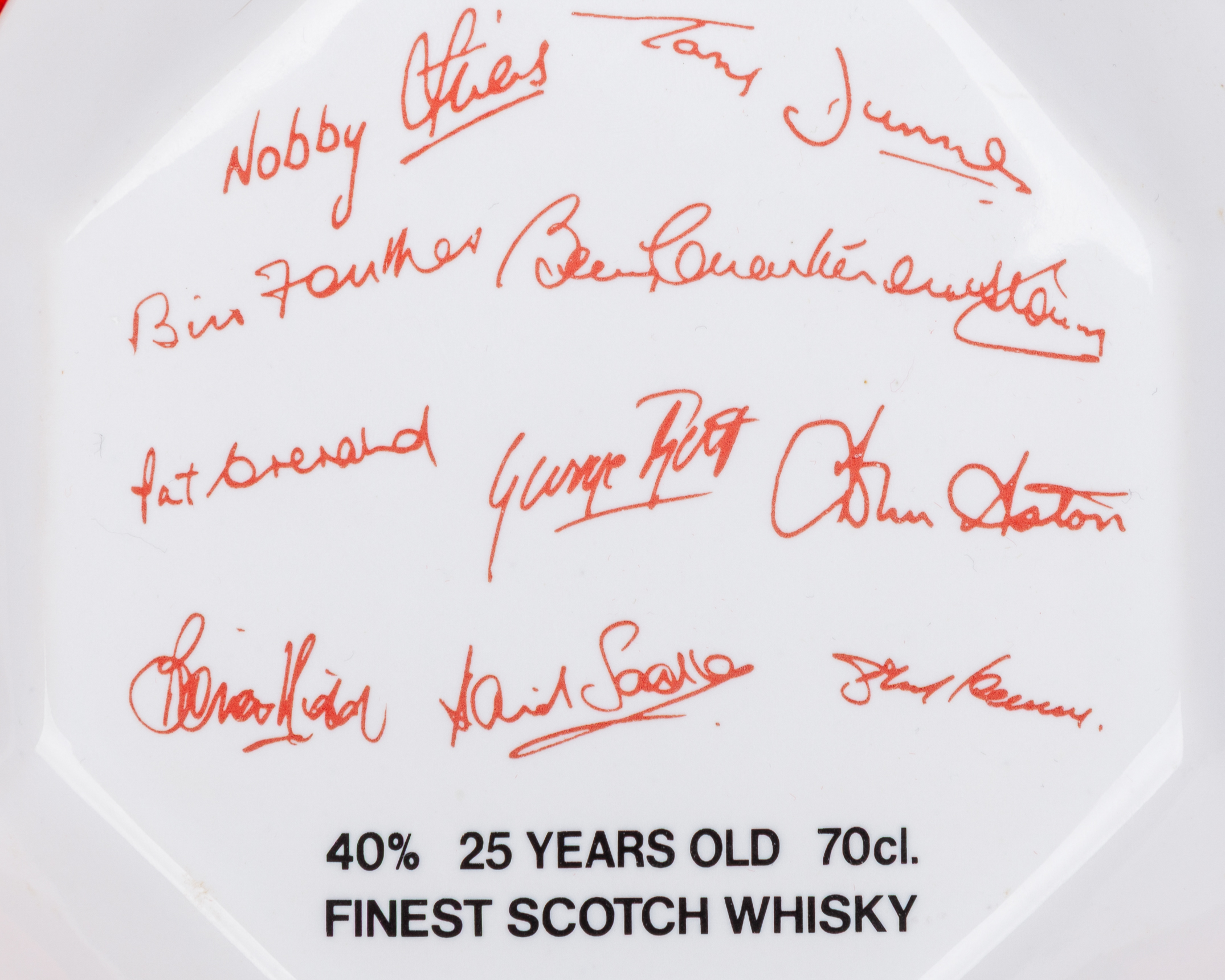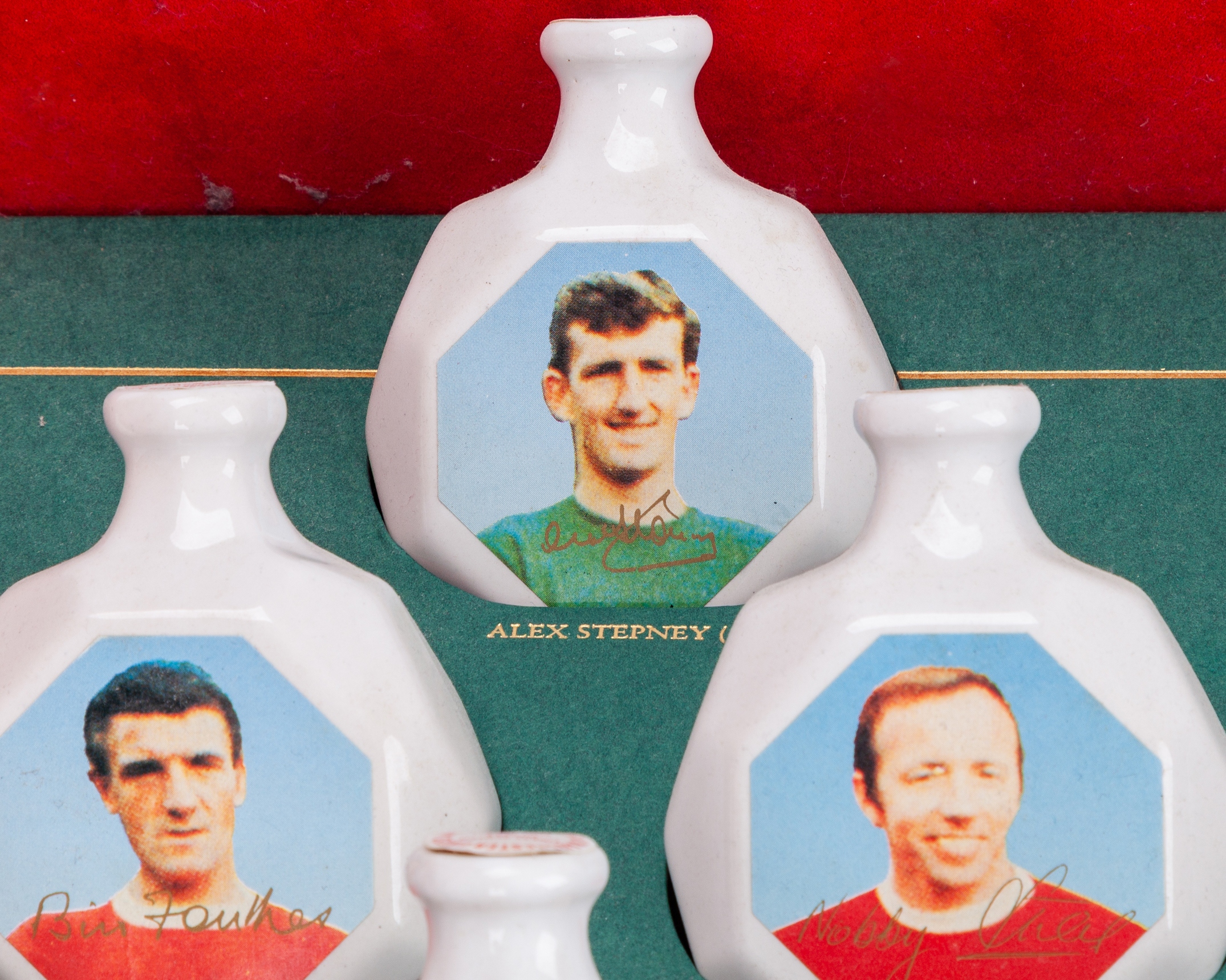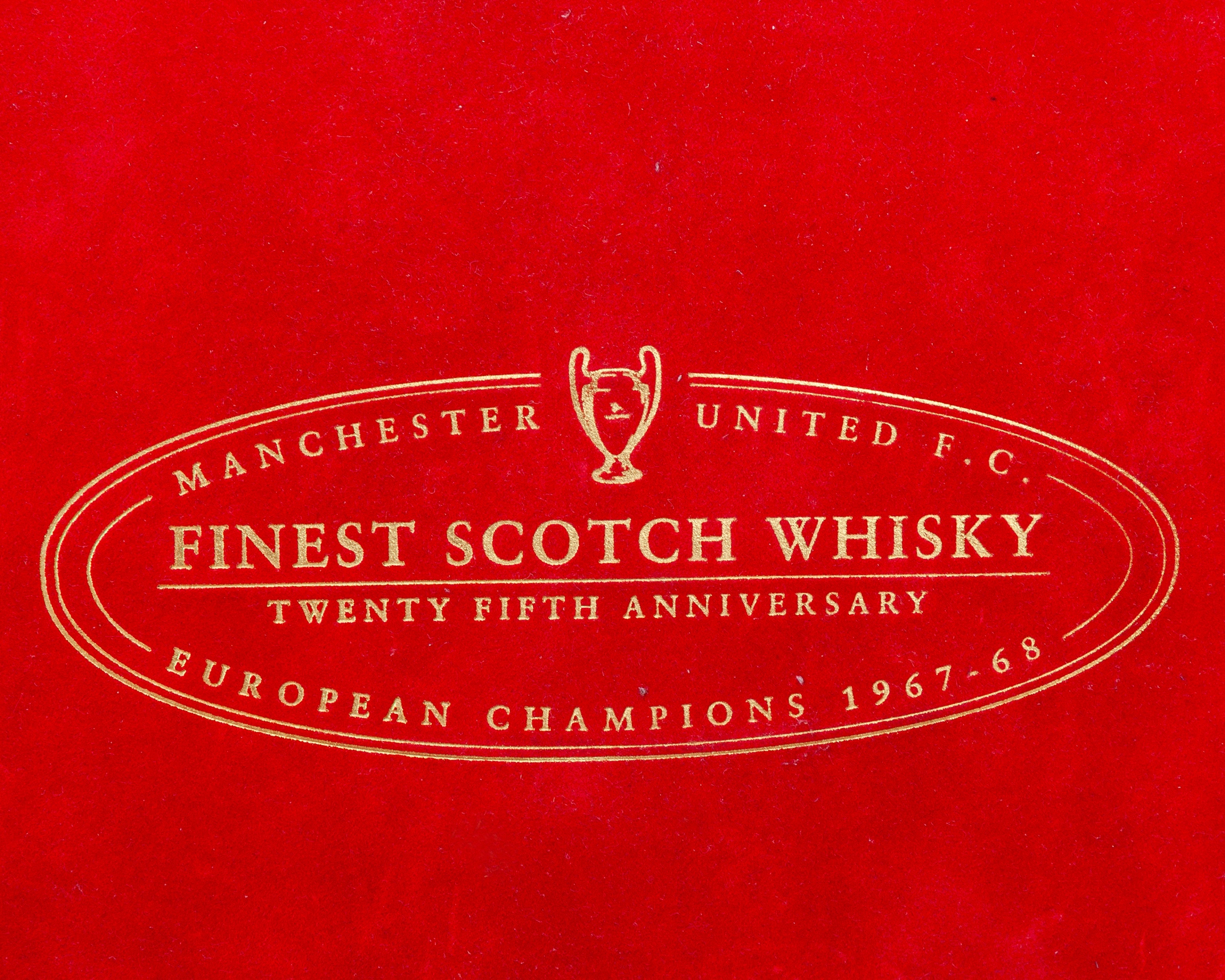 Manchester United case set of whiskey miniatures, to commemorate the 25th anniversary of winning the 1968 European Cup in original case, all with liquid present apart from seemingly Brian Kidd, case with minor marks and dirty, the similar whiskery decanter, full, No.053 of limited edition