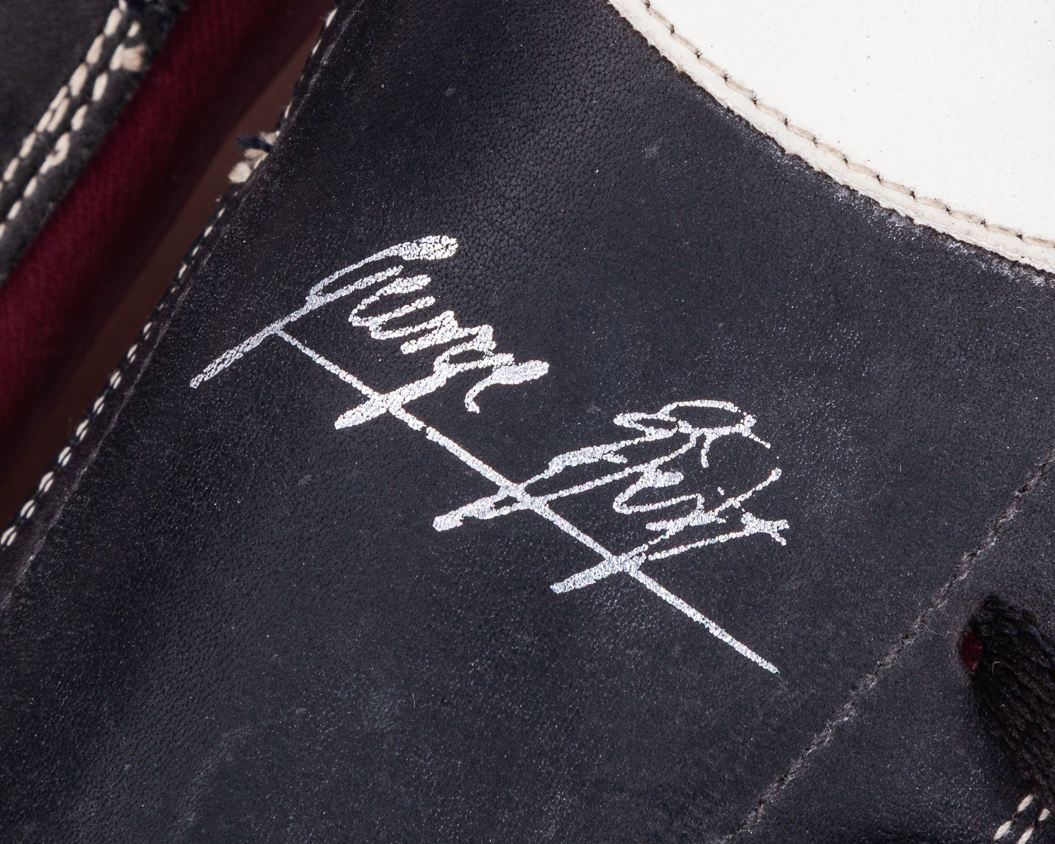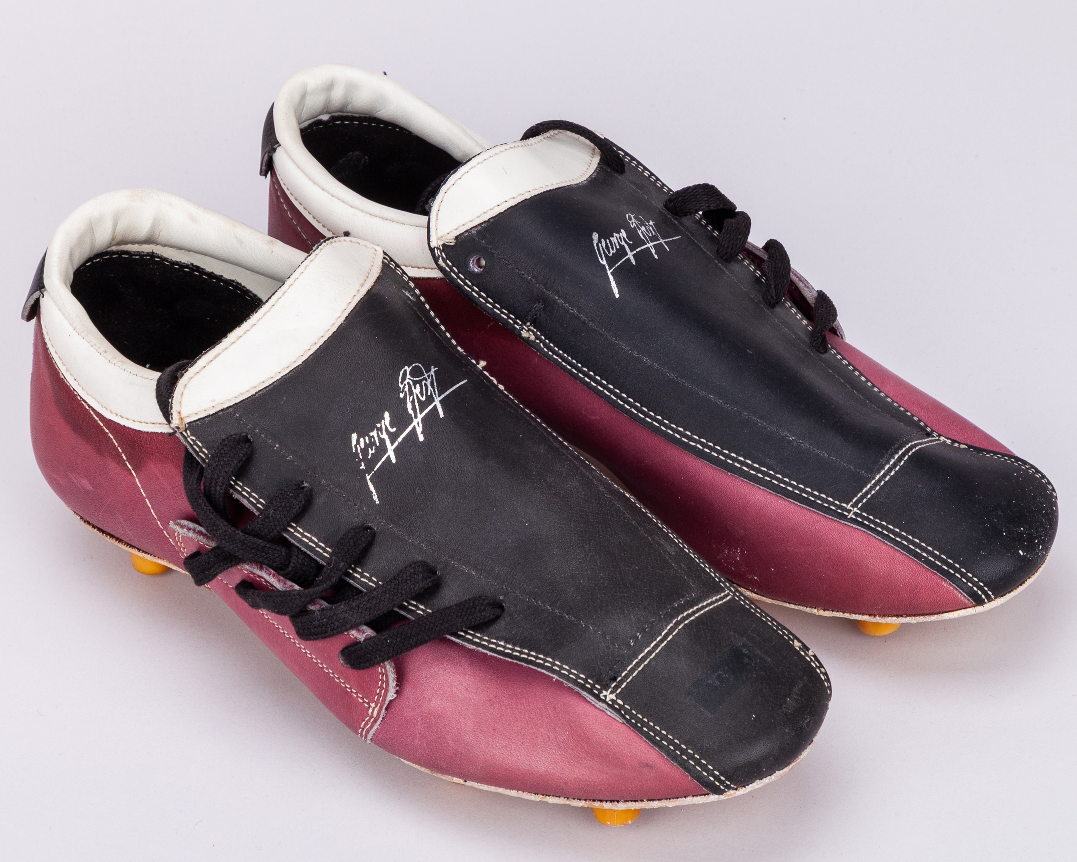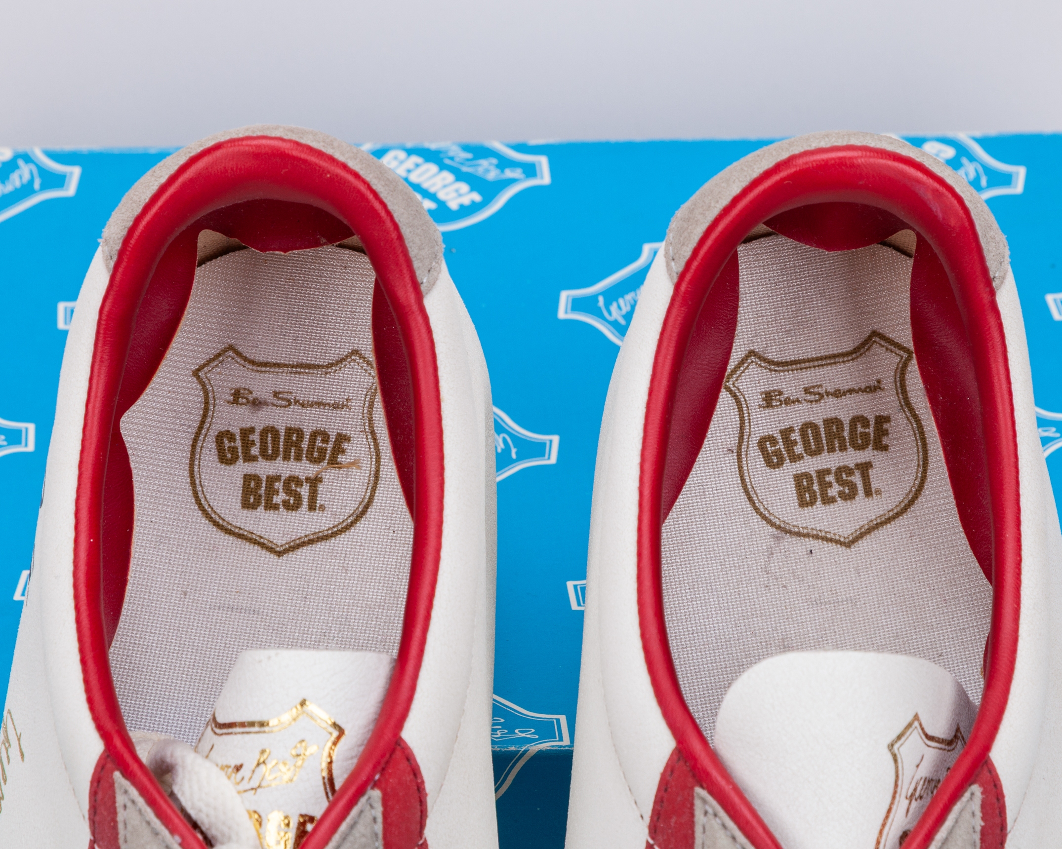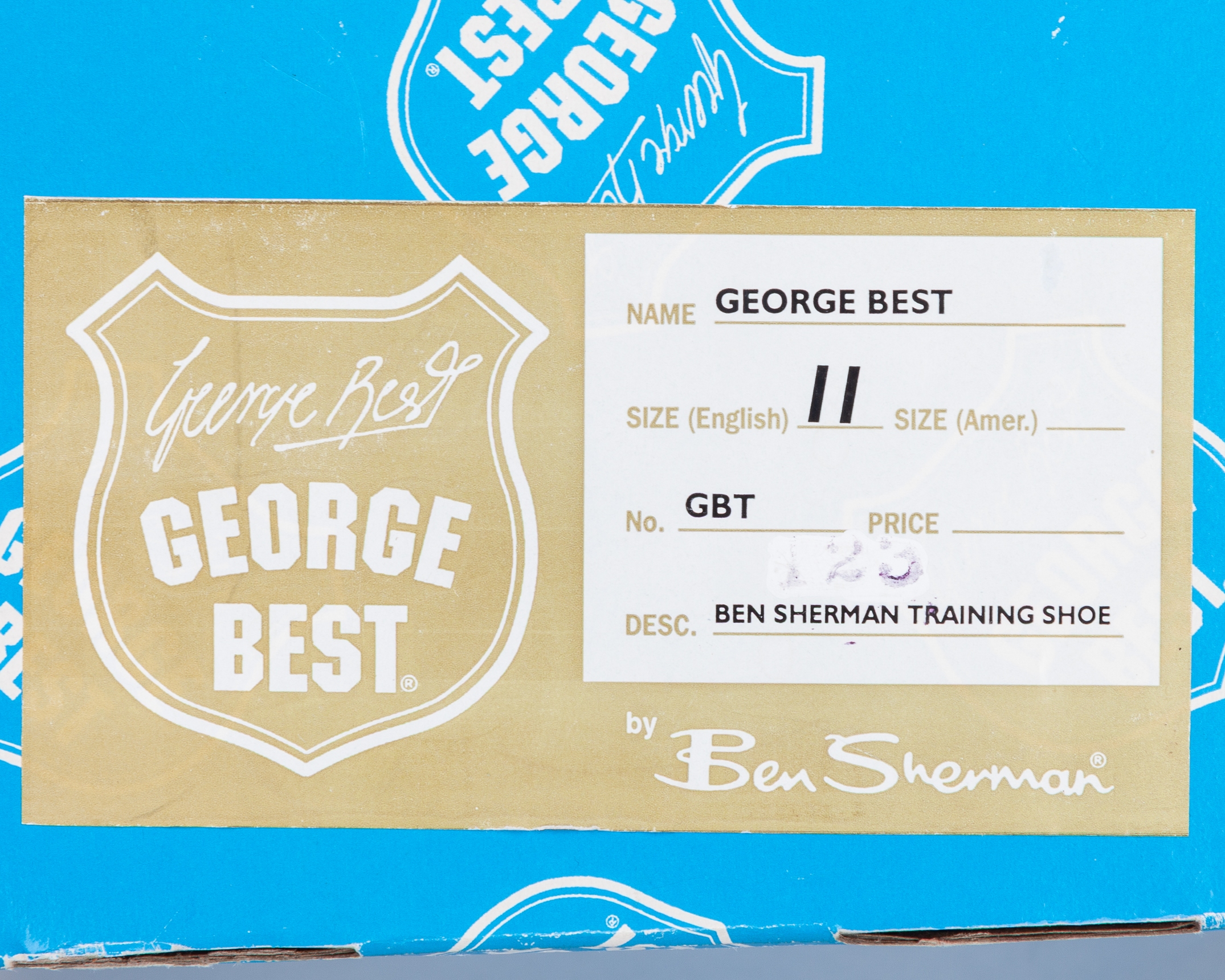 George Best autographed white, grey and red Ben Sherman George Best trainers, UK 11, with limited edition tag, original bag and box, red, black and white George Best football boots, sole pealing (2)