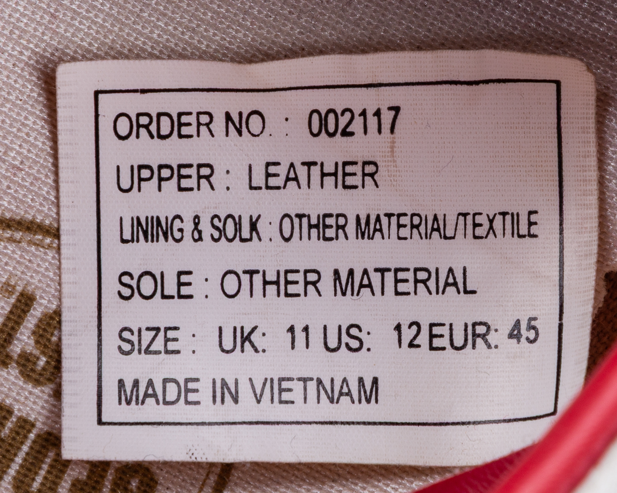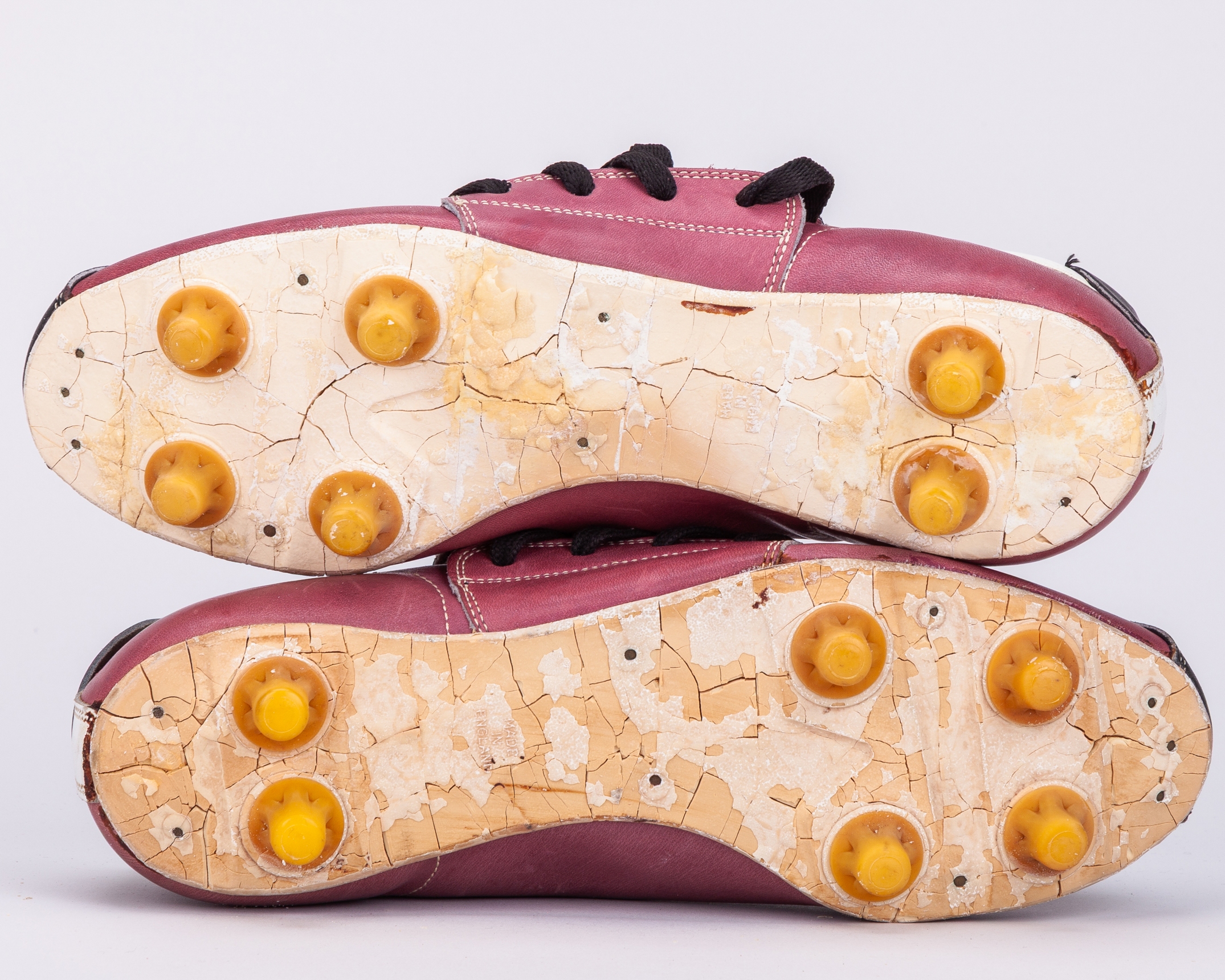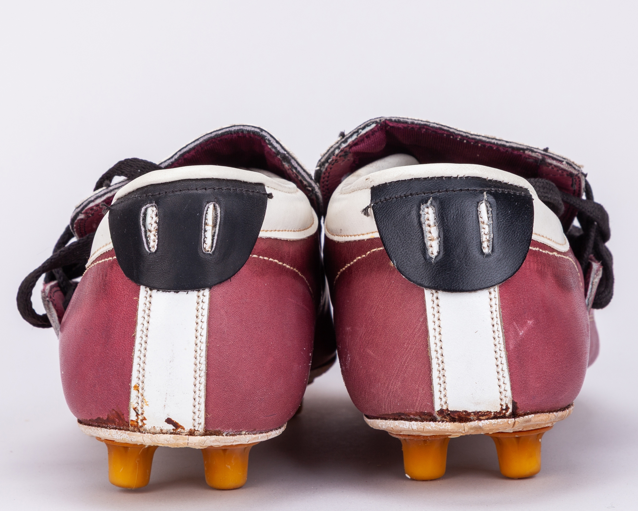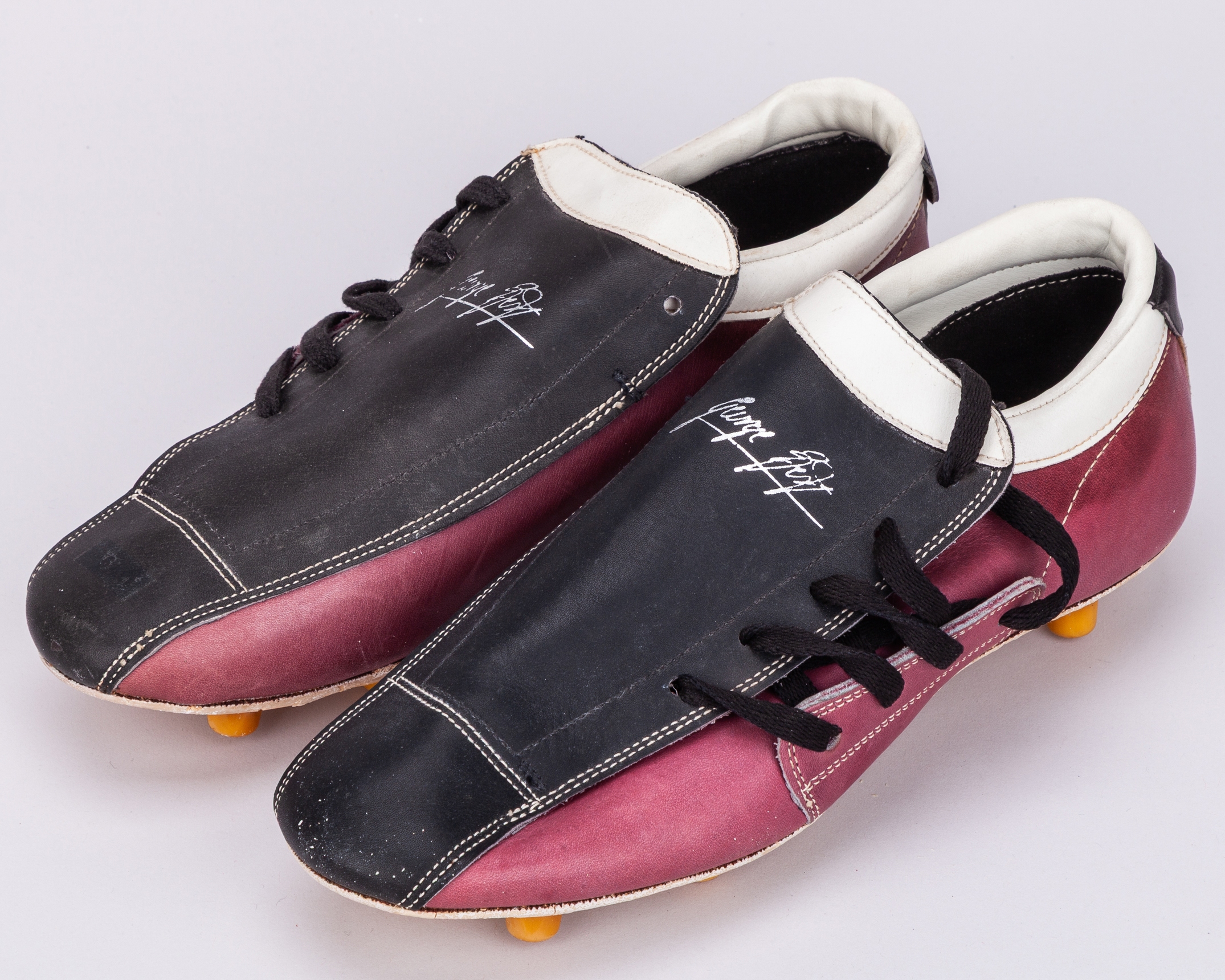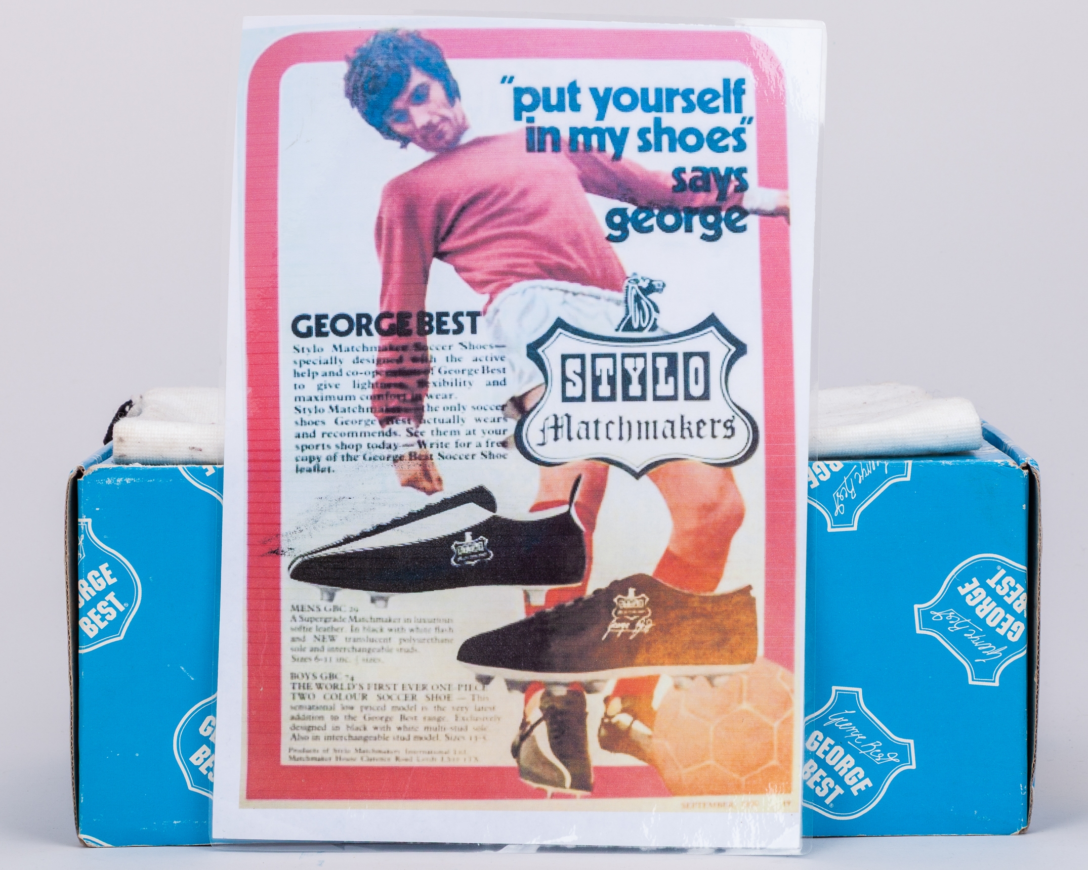 George Best autographed white, grey and red Ben Sherman George Best trainers, UK 11, with limited edition tag, original bag and box, red, black and white George Best football boots, sole pealing (2)