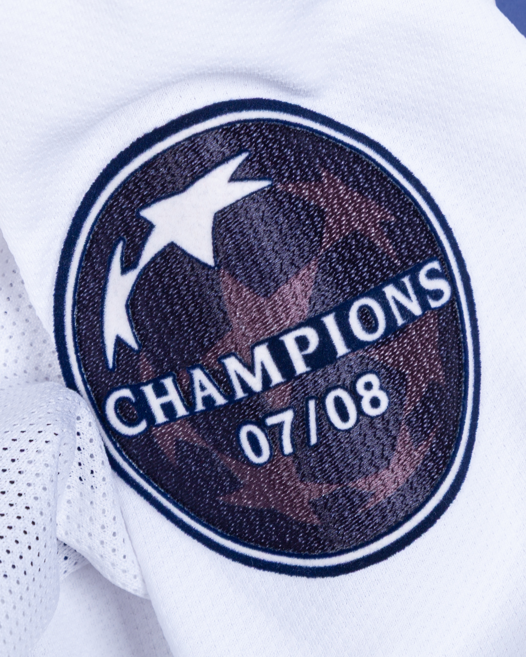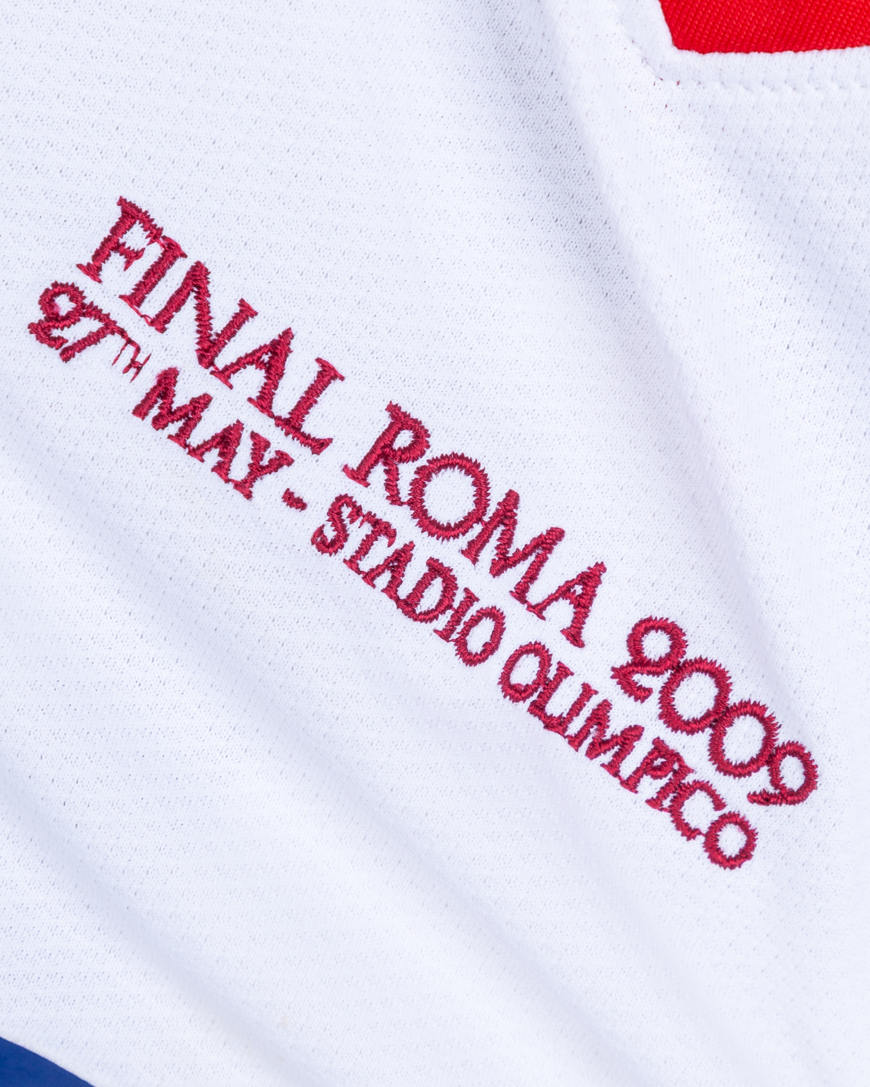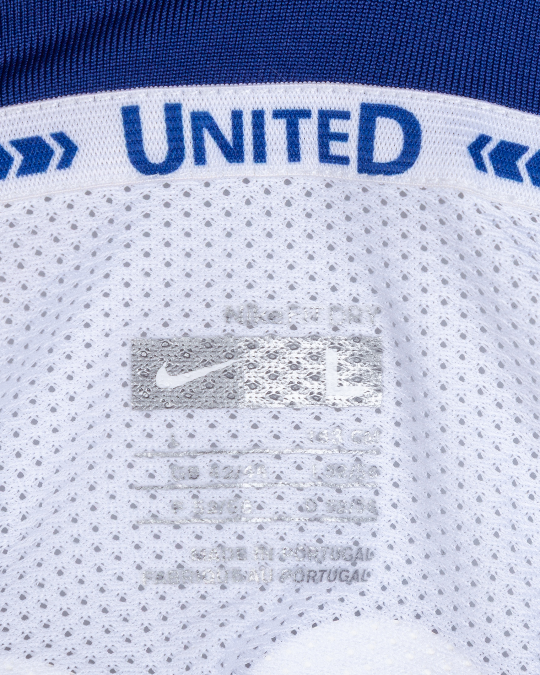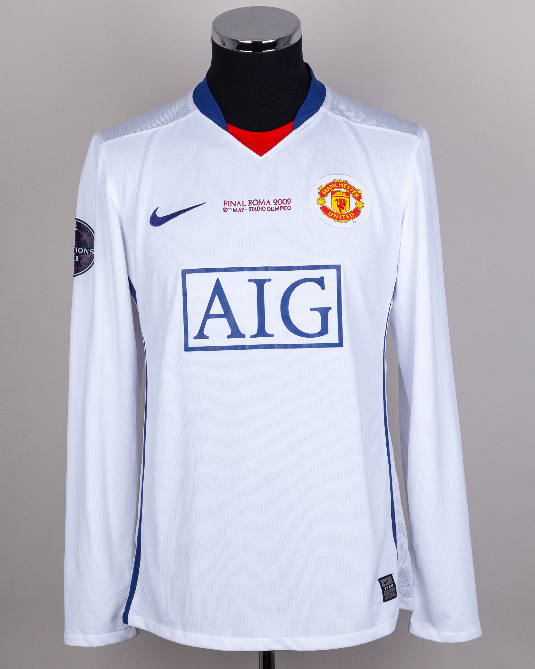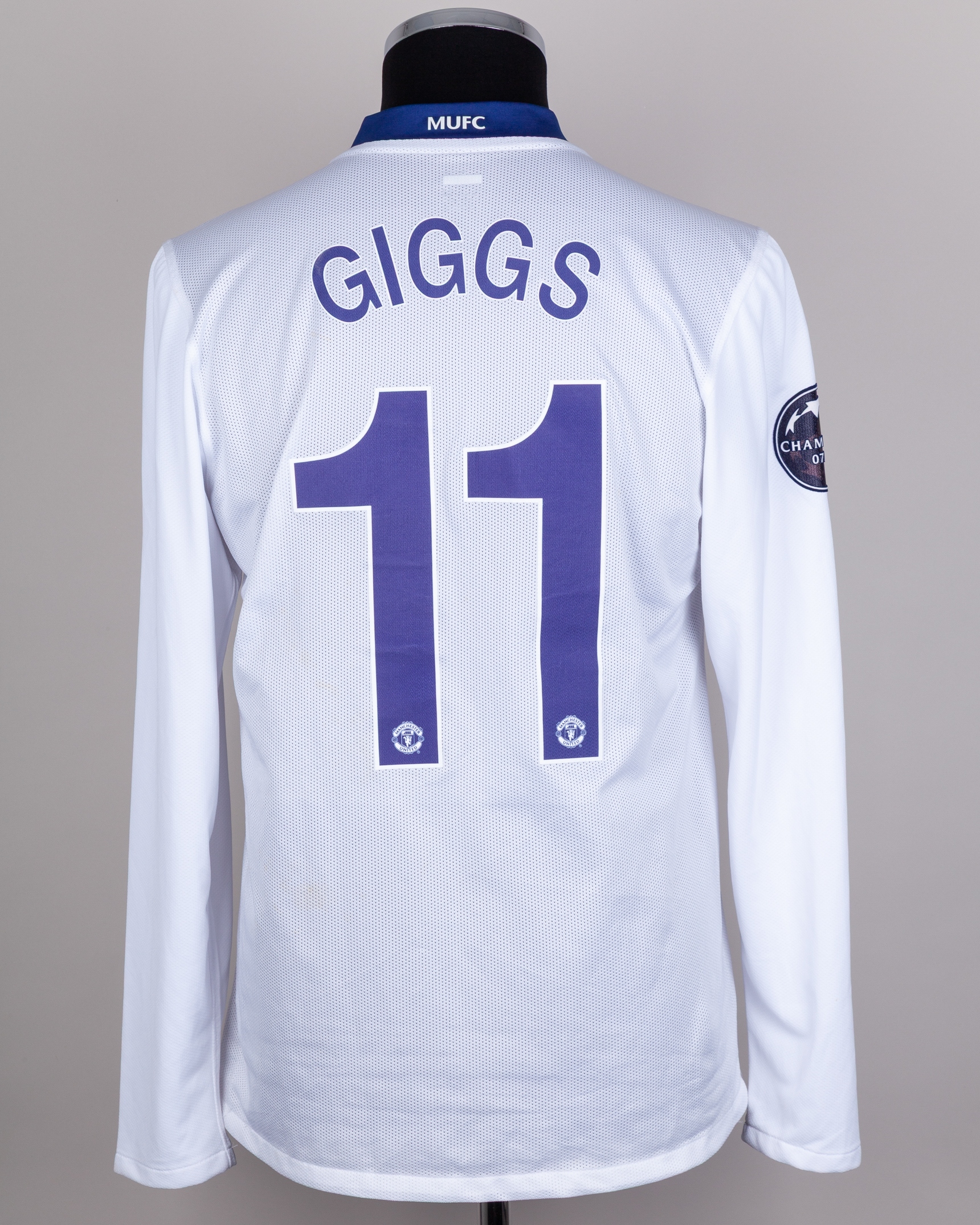 Ryan Giggs white and blue No.11 Manchester United v. Barcelona match issued long-sleeved shirt, 2009, Nike, L, with v-neck collar and embroidered cloth badge inscribed MANCHESTER UNITED, FINAL ROMA 2009 27th MAY - STADIO OLIMPICO, the reverse lettered GIGGS, the right sleeve with Champions League 07/08 flash, with COA from Cult Kits and signed letter from Tony Heywood.