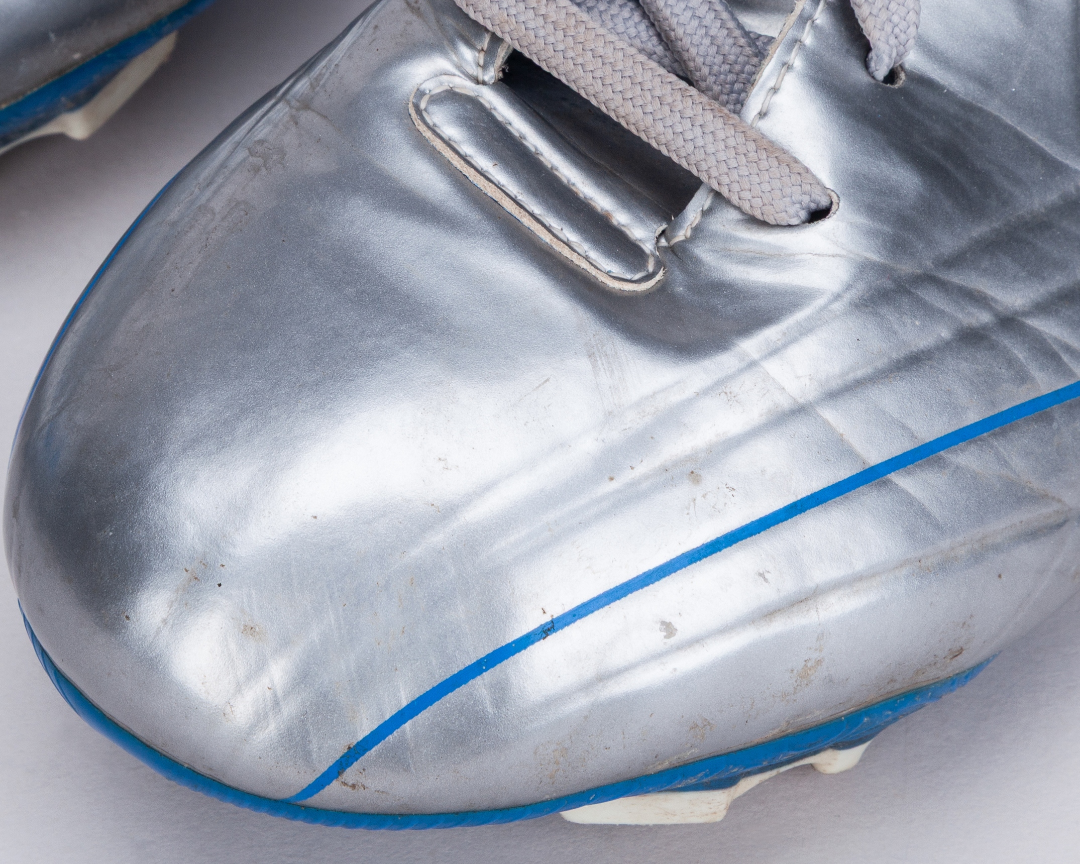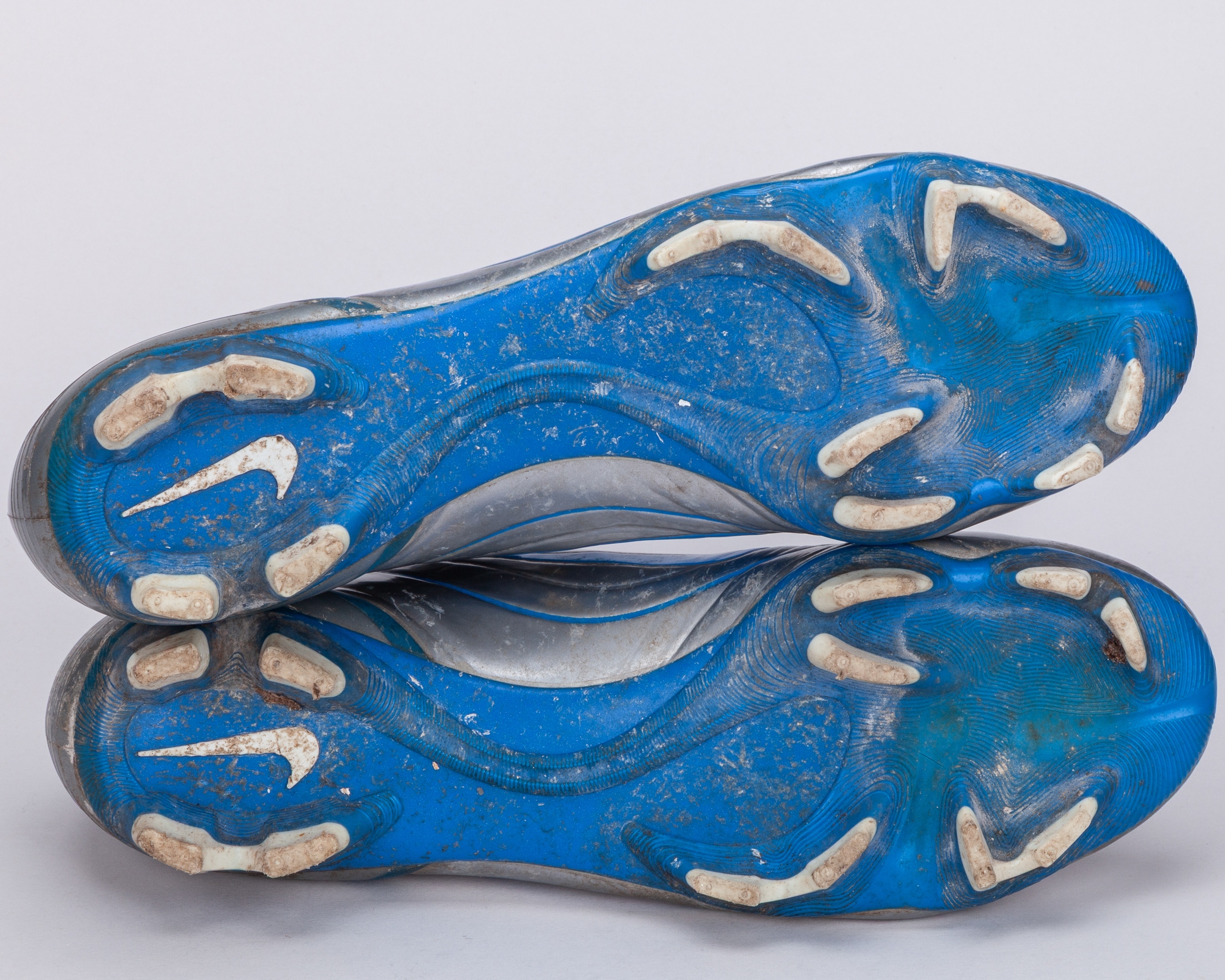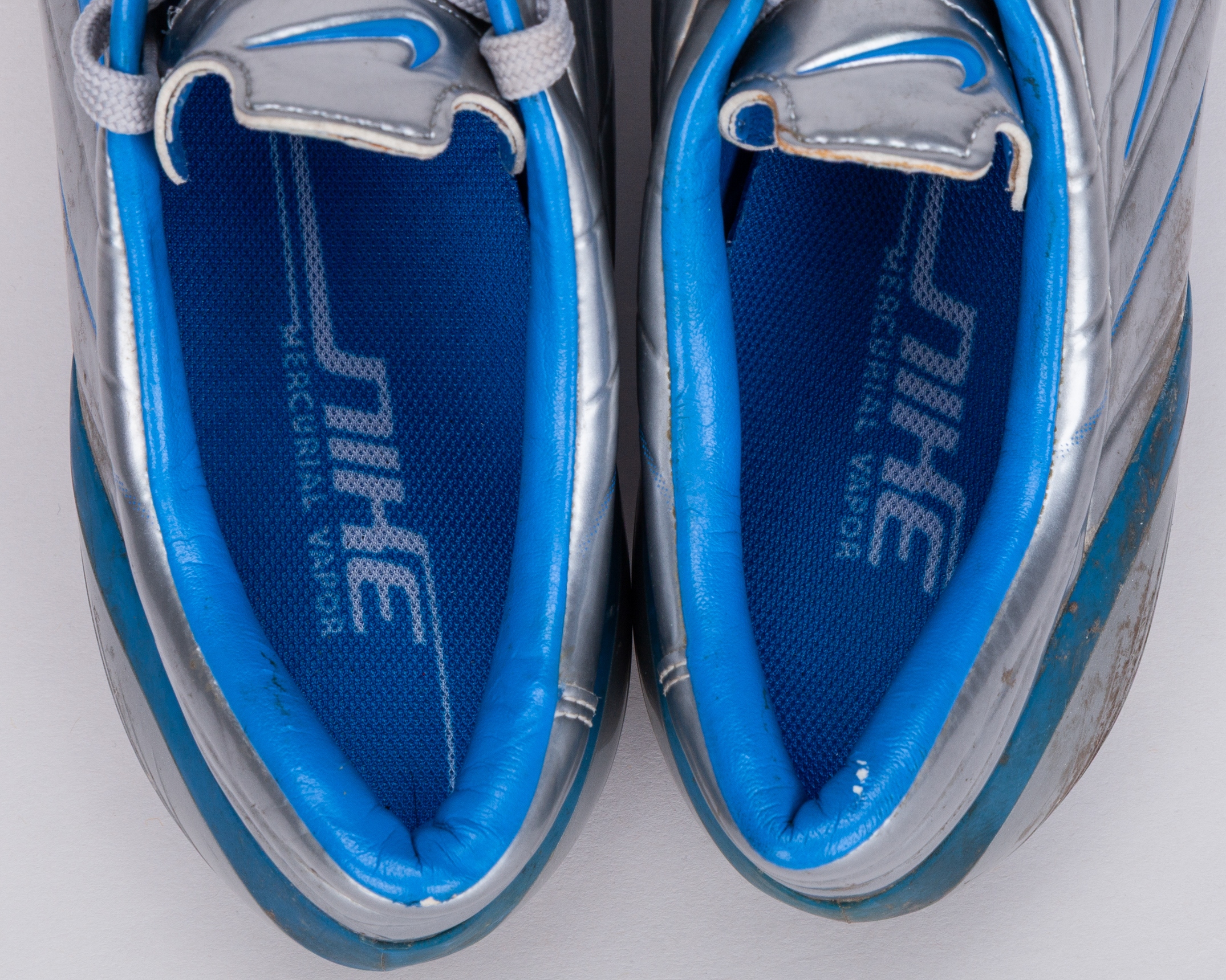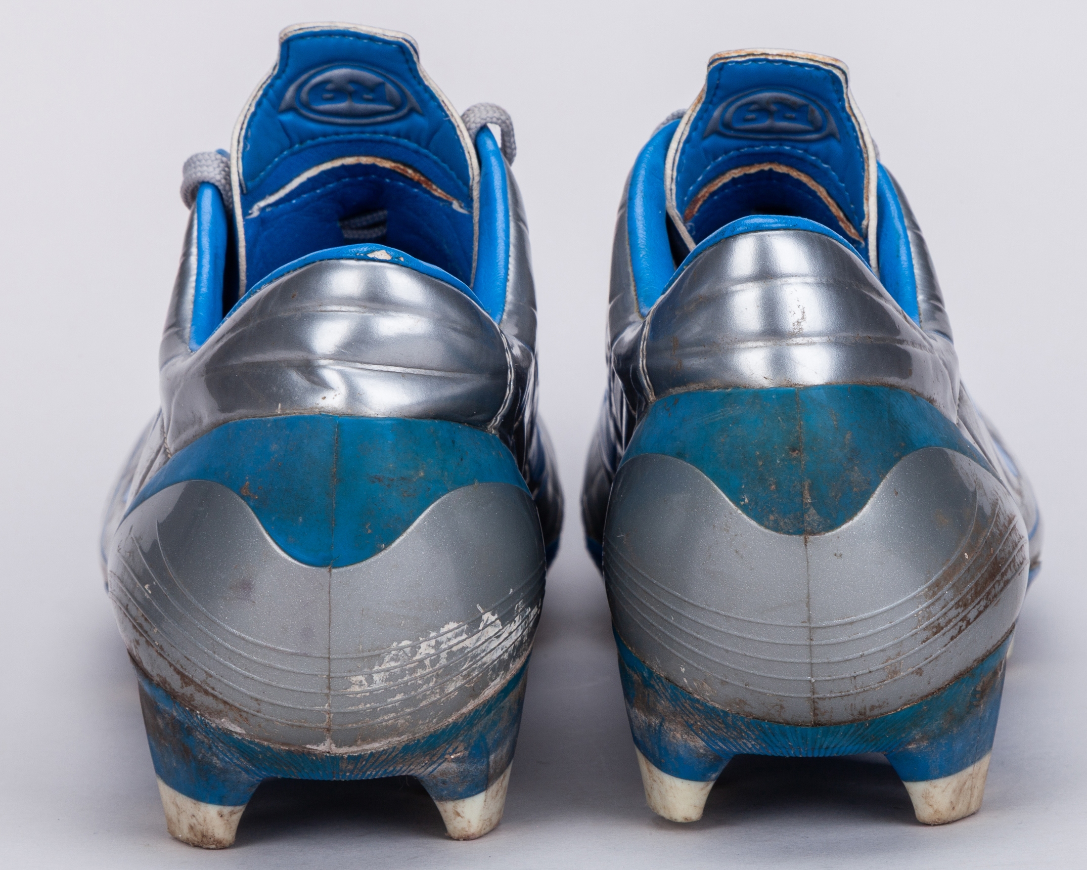 Cristiano Ronaldo a pair of silver and blue Nike worn football boots, 2004, the tongue inscribed R9, areas of wear on boots, soles and interior, the boots were retrieved by Tony from the bin after a training session, with COA from Cult Kits and signed letter from Tony Heywood.