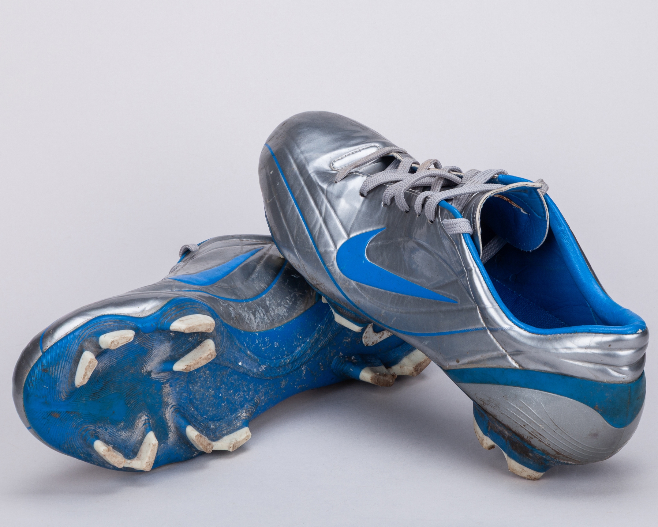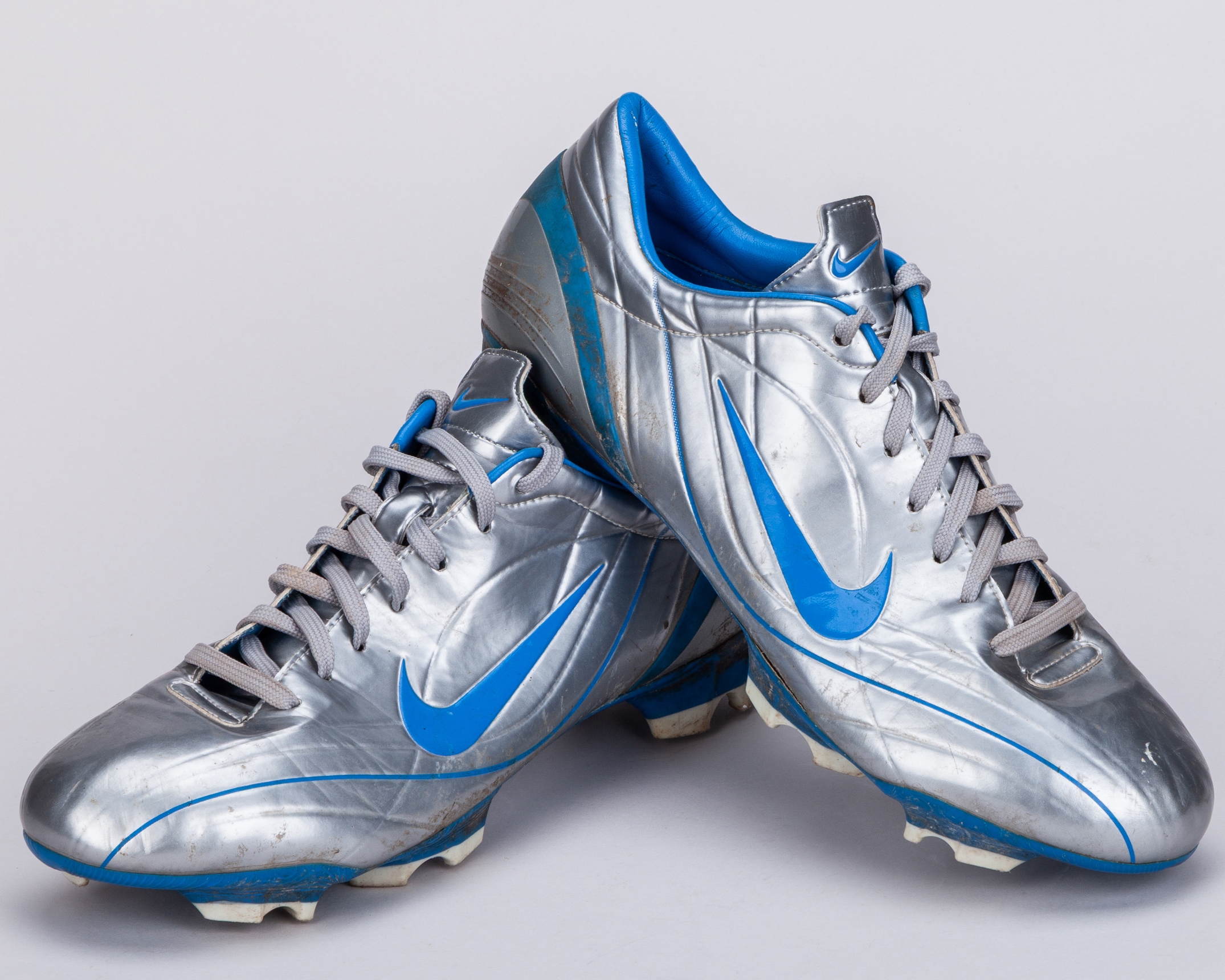 Cristiano Ronaldo a pair of silver and blue Nike worn football boots, 2004