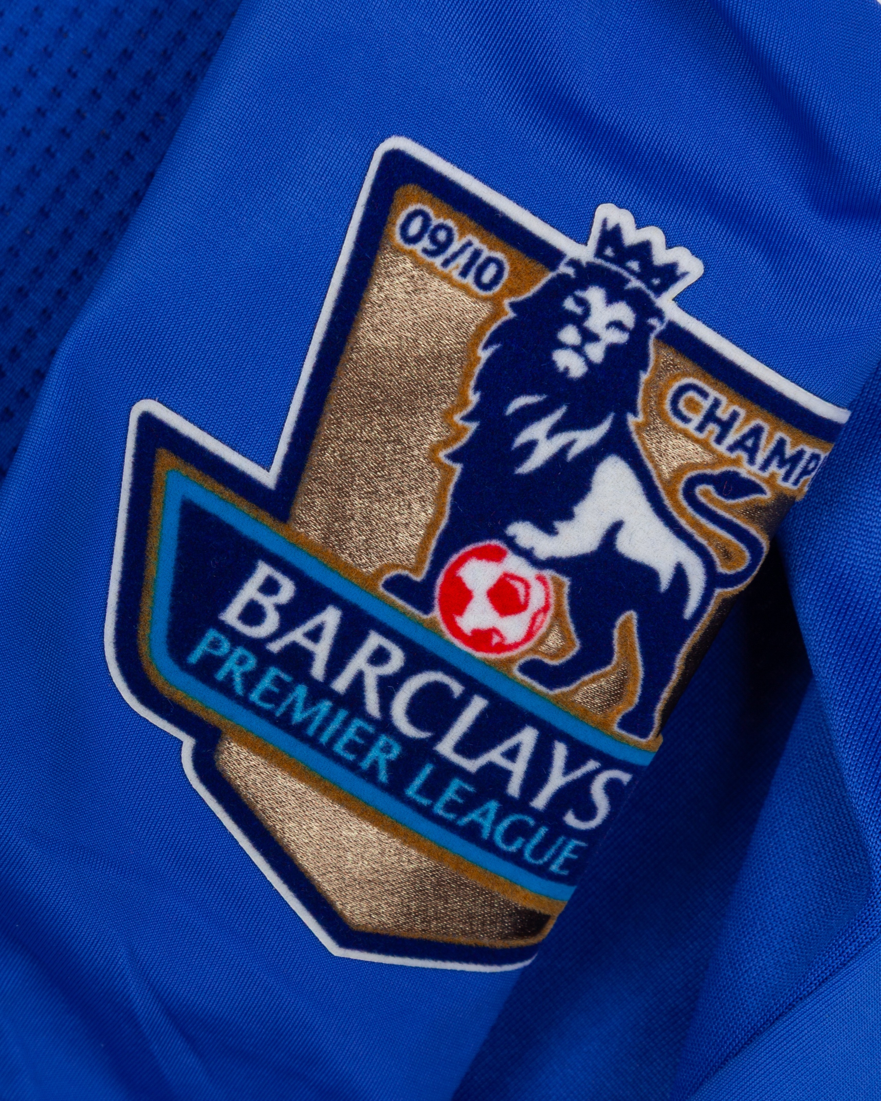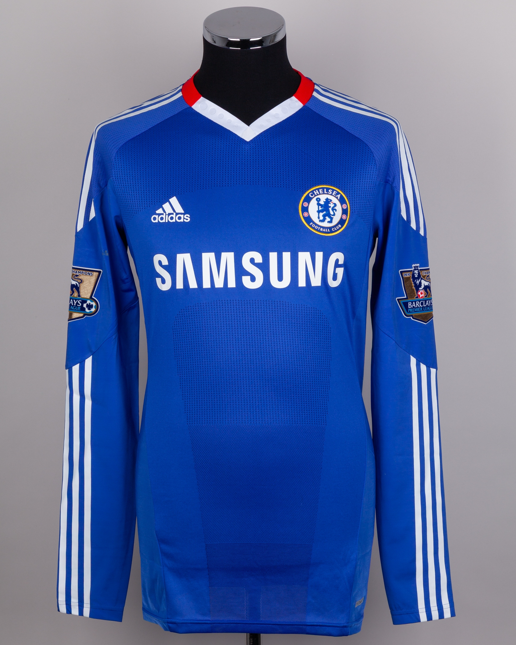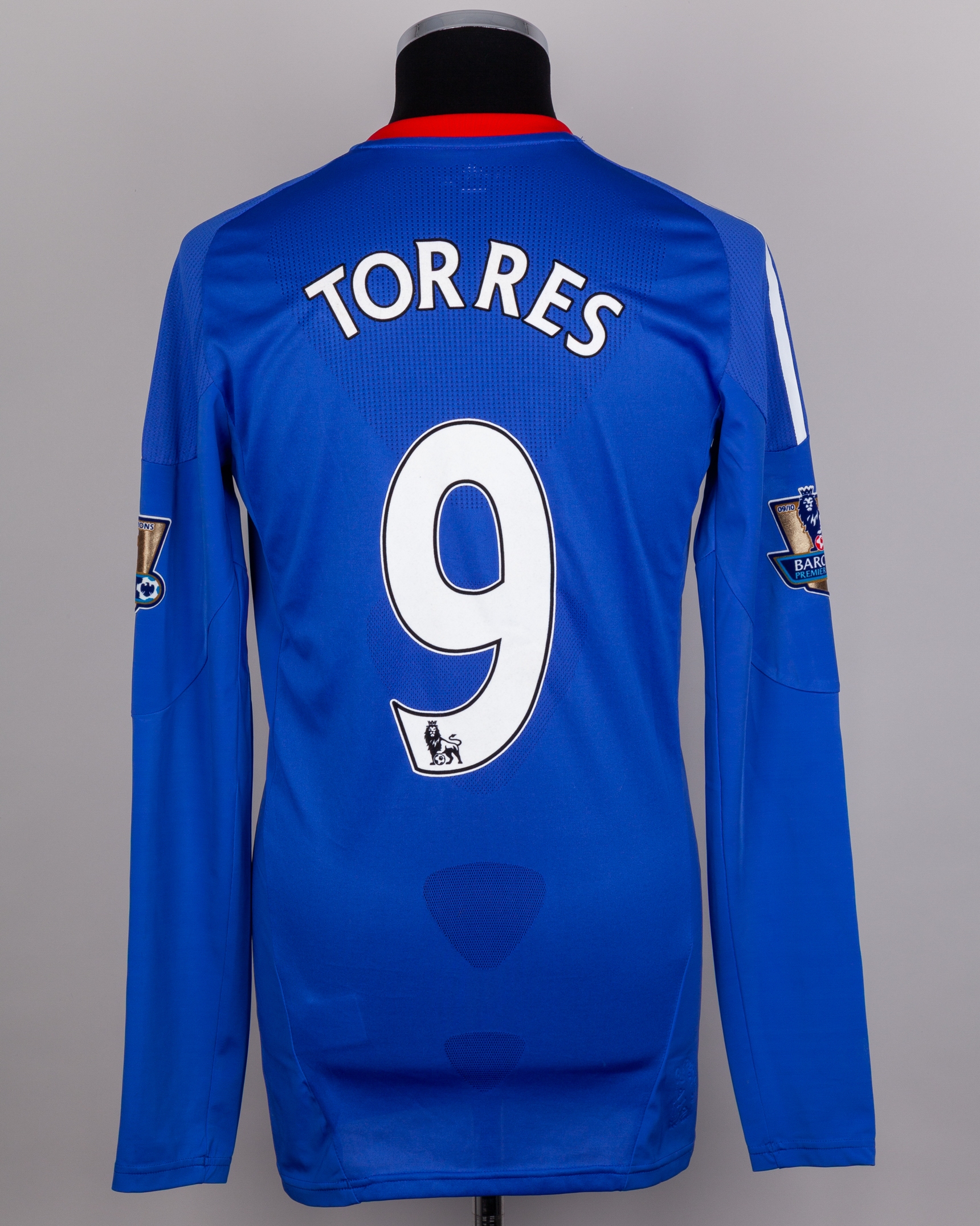Fernando Torres blue and white No.9 Chelsea v. Manchester United match issued long-sleeved shirt, 2010-11, Adidas, L, with v-neck collar and embroidered cloth badge inscribed CHELSEA FOOTBALL CLUB, the reverse lettered TORRES, the sleeves with Barclays Premier League 09/10 Champions flashes, with COA from Cult Kits and signed letter from Tony Heywood