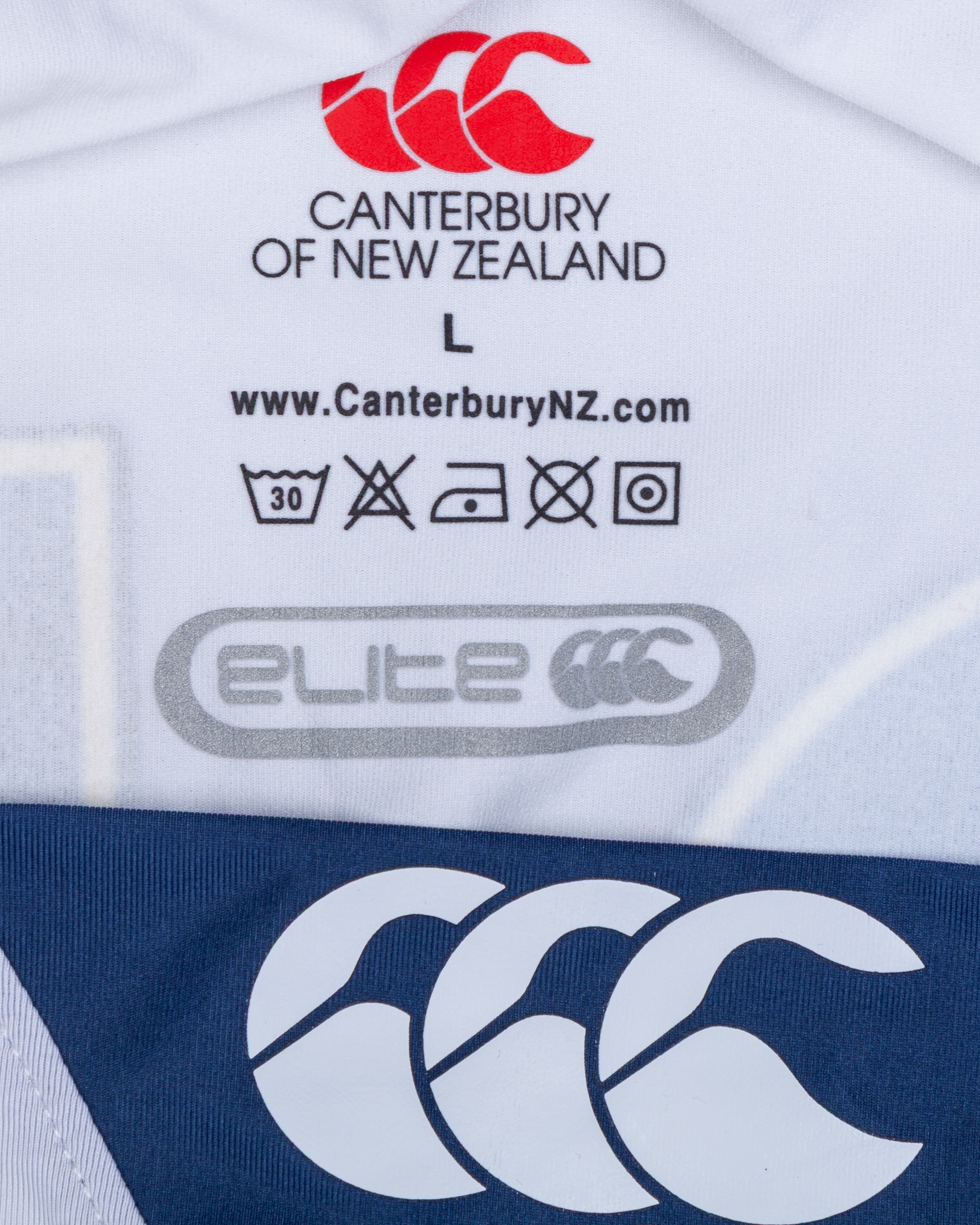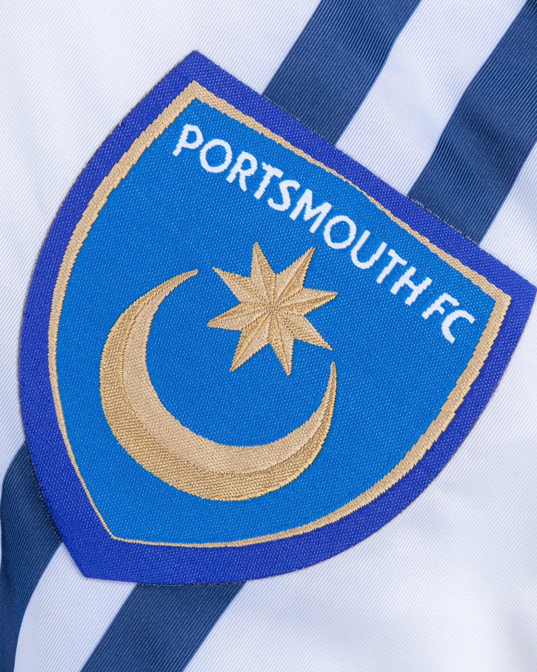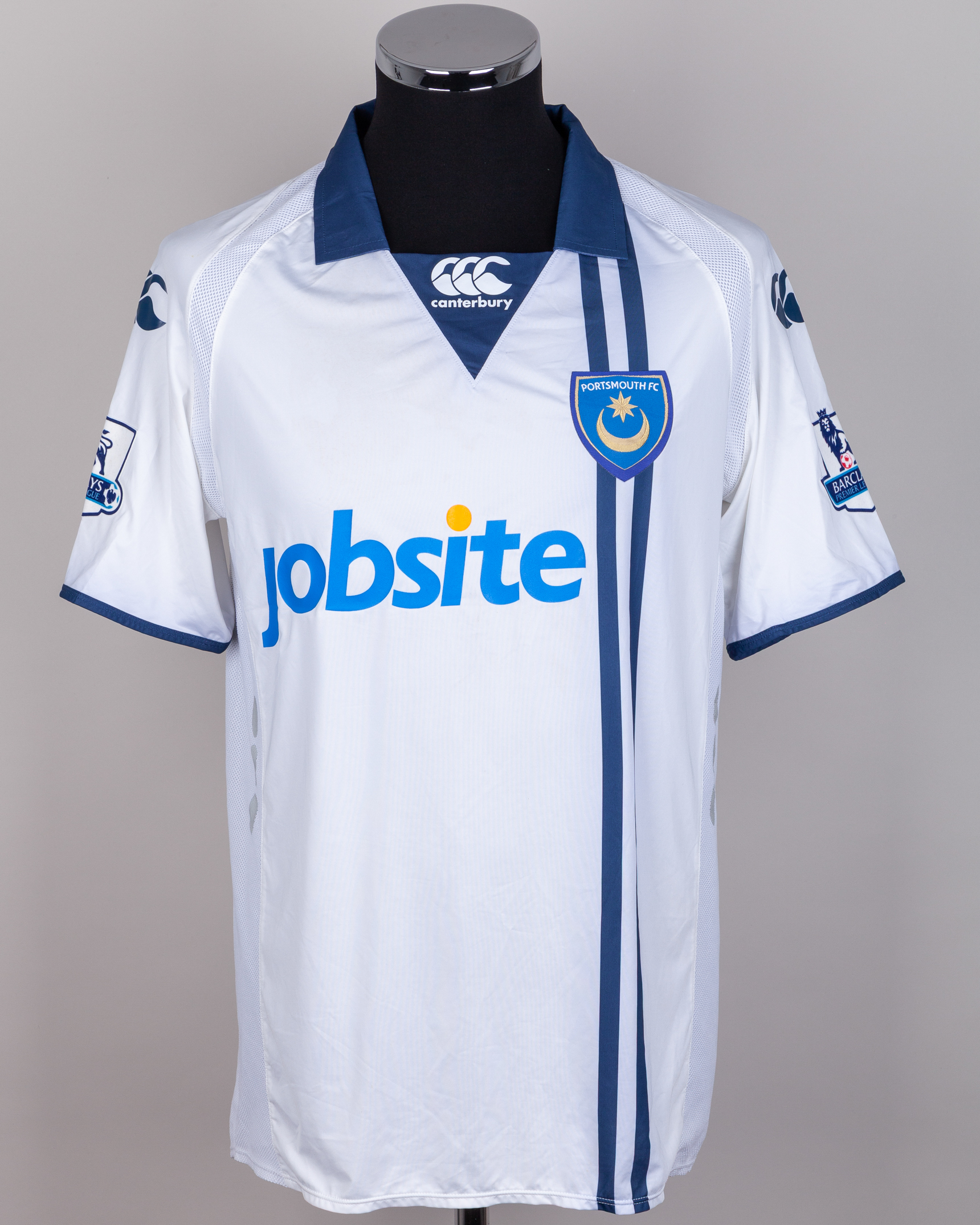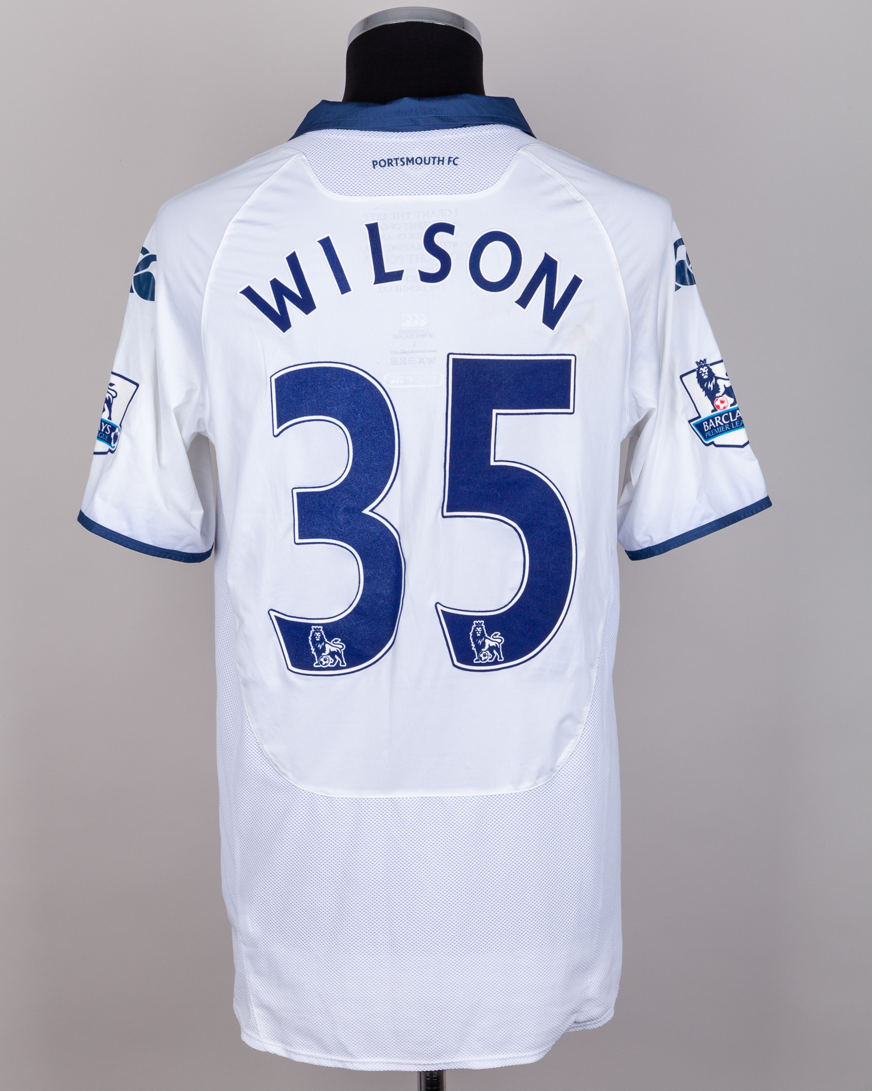 Marc Wilson white and blue No.35 Portsmouth v. Manchester United short-sleeved shirt, 2010, Canterbury, L, with v-neck collar and embroidered cloth badge inscribed PORTSMOUTH FC, the reverse lettered WILSON, the sleeves with Barclays Premier League flashes, with COA from Cult Kits and signed letter from Tony Heywood.