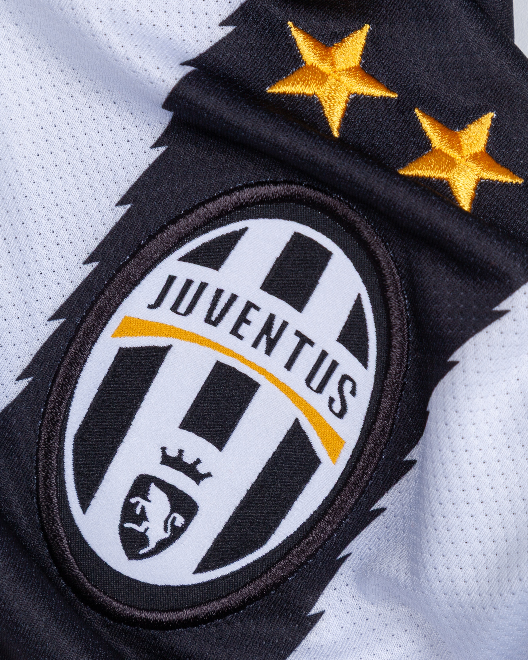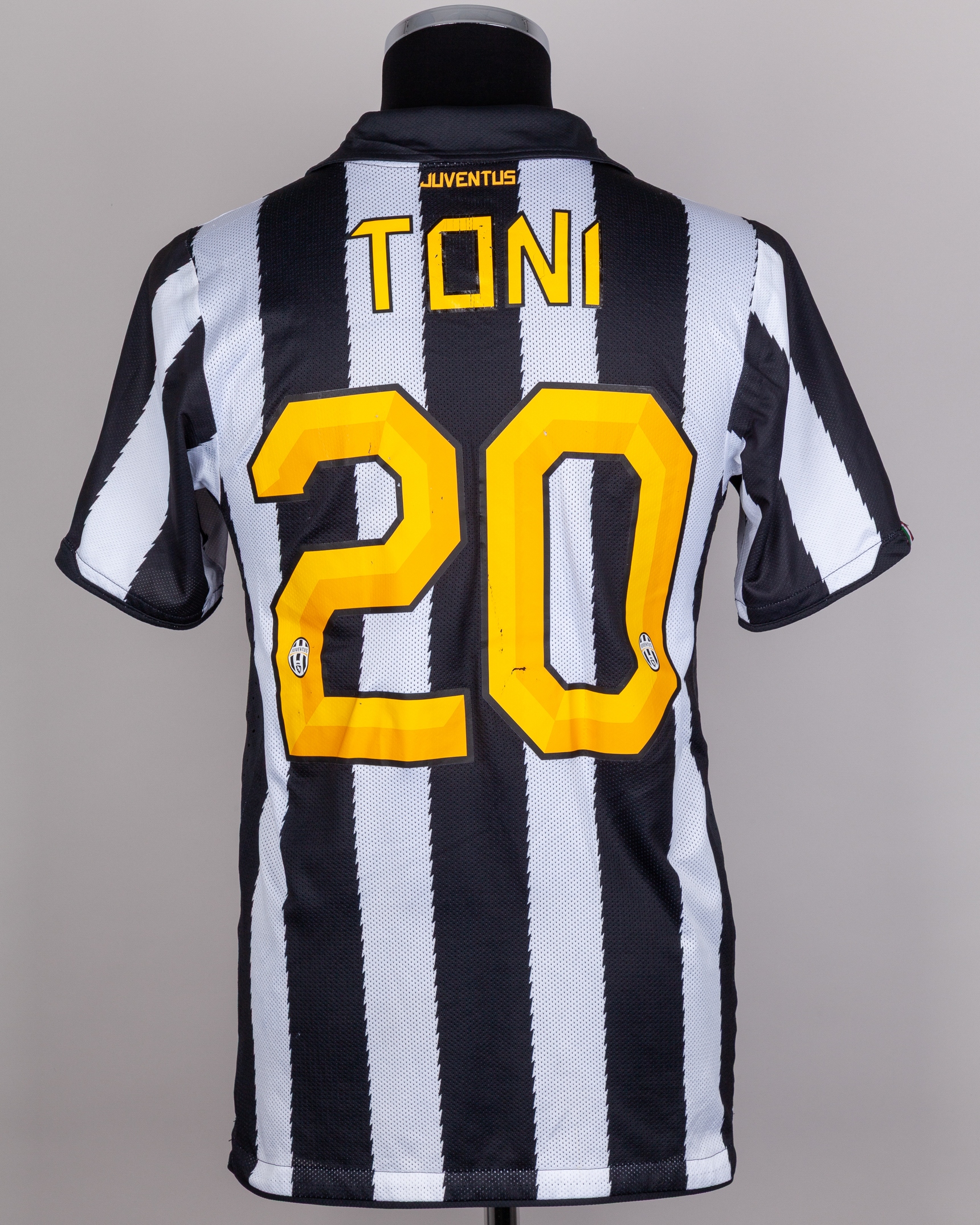 Luca Toni black and white No.20 Juventus v. Manchester United match issued short-sleeved shirt, 2010-11, Adidas, M, with v-neck collar and embroidered cloth badge inscribed JUVENTUS, the reverse lettered TONI, wear to sponsors logo, name set and number, with COA from Cult Kits and signed letter from Tony Heywood