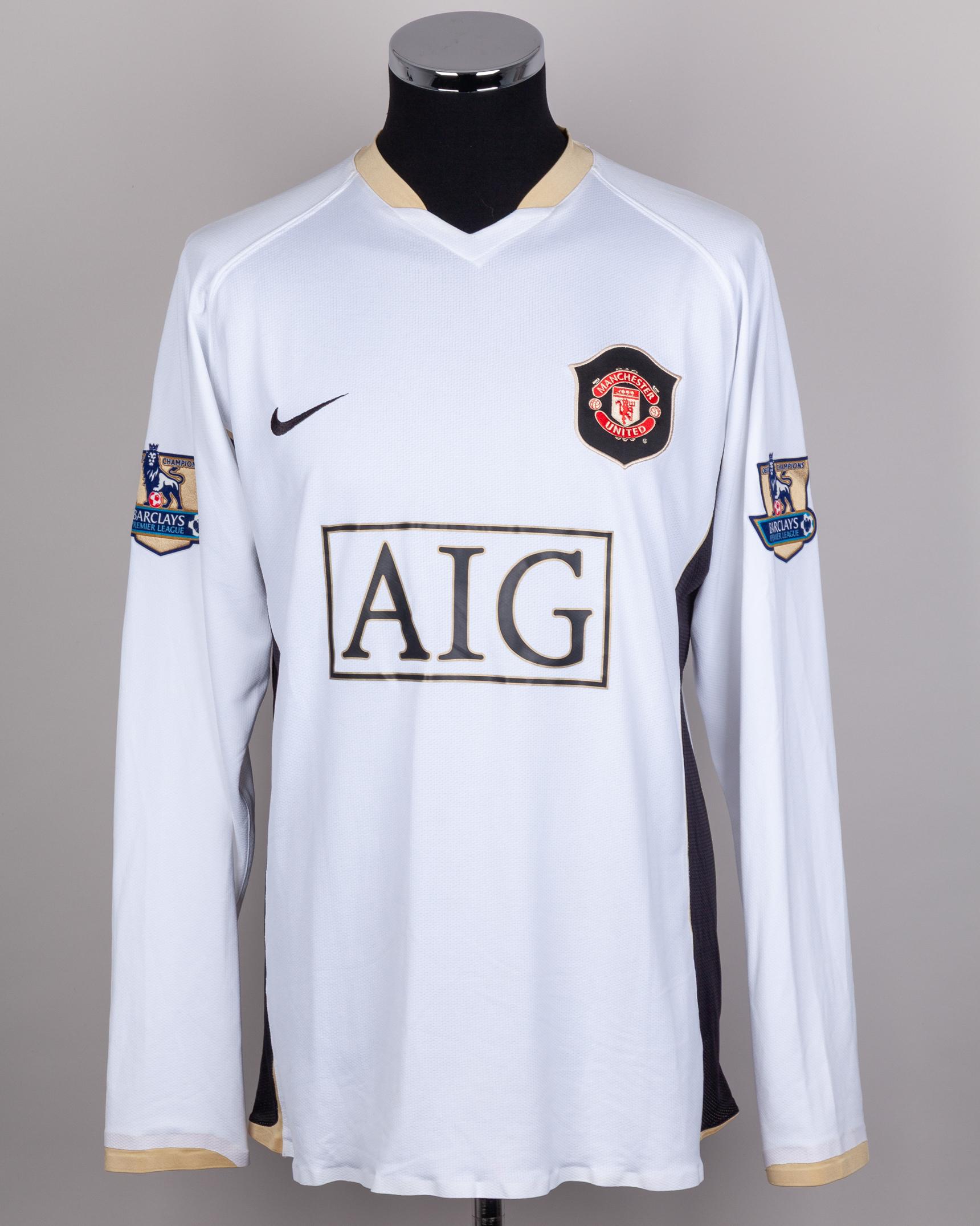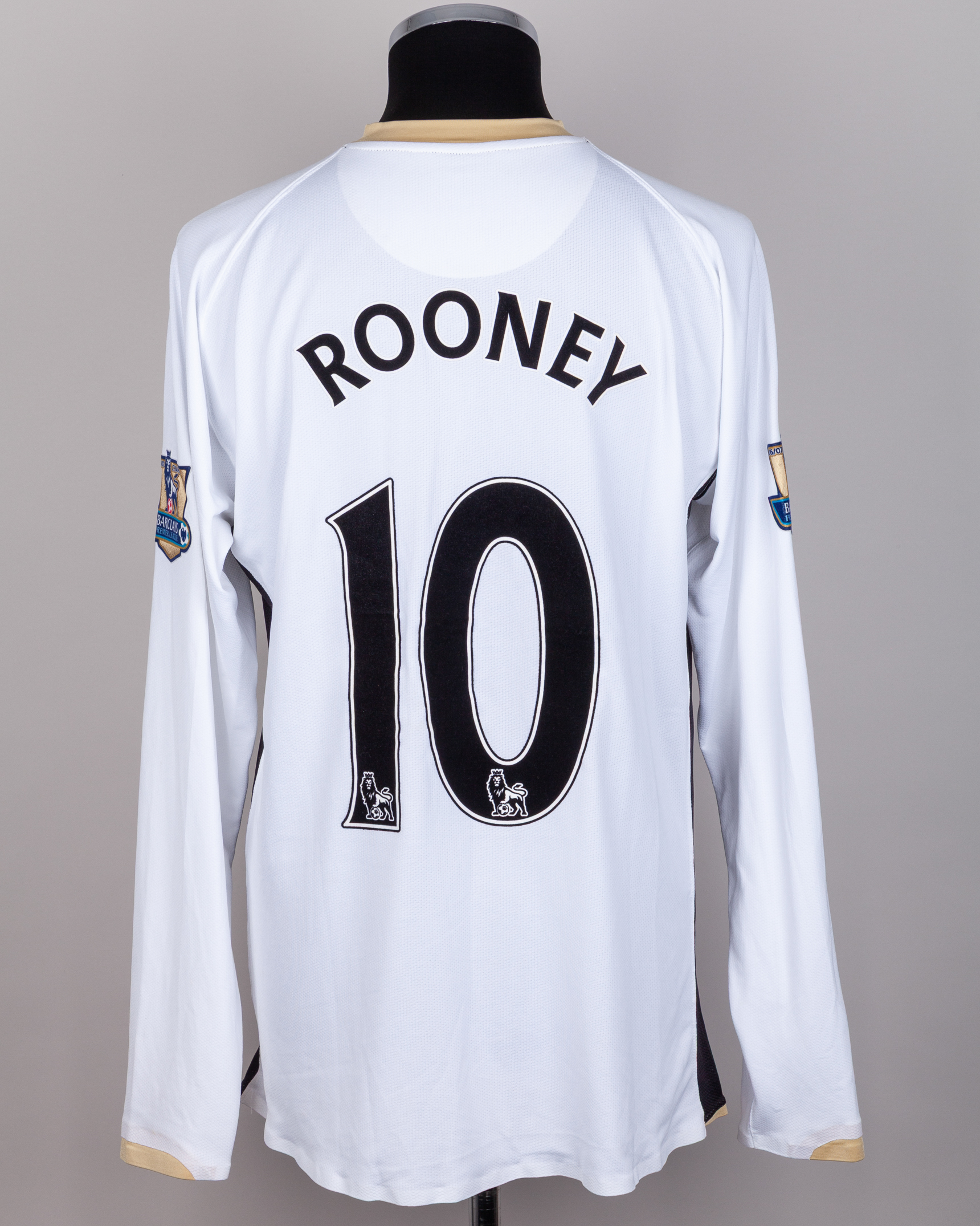 Wayne Rooney white No.10 Manchester United v. Aston Villa match issued long-sleeved shirt, 2007-08, Nike, XL, with v-neck collar and embroidered cloth badge inscribed MANCHESTER UNITED, the reverse lettered ROONEY, the sleeves with Barclays Premier League Champions 06/07 flashes, with COA from Cult Kits and signed letter from Tony Heywood