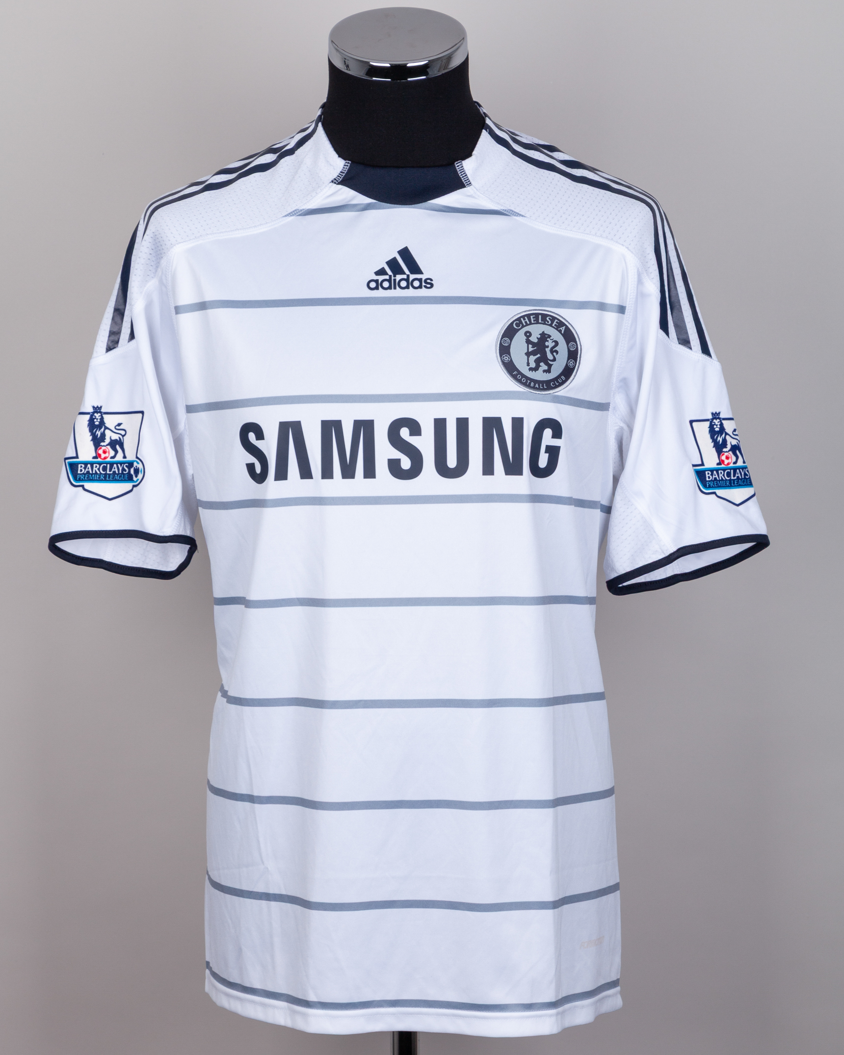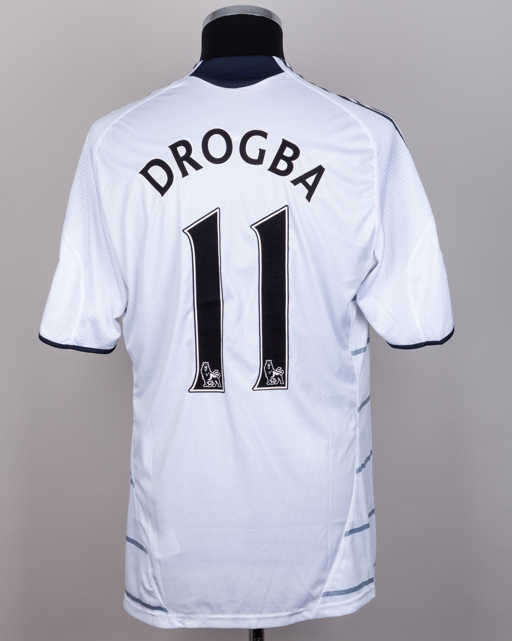 Didier Drogba white and blue No.11 Chelsea match issued short-sleeved shirt, 2009-10, Adidas, L, with crew-neck collar and embroidered cloth badge inscribed CHELSEA FOOTBALL CLUB, the reverse lettered DROGBA, the sleeves with Barclays Premier League flashes, with COA from Cult Kits and signed letter from Tony Heywood