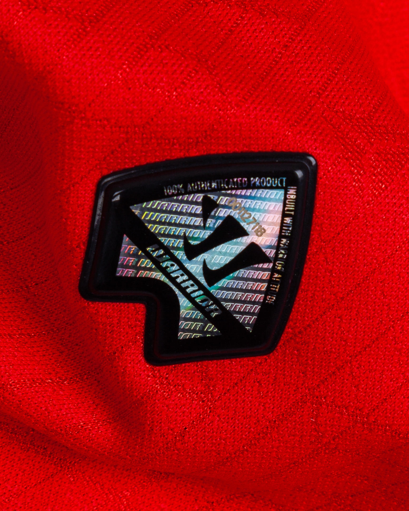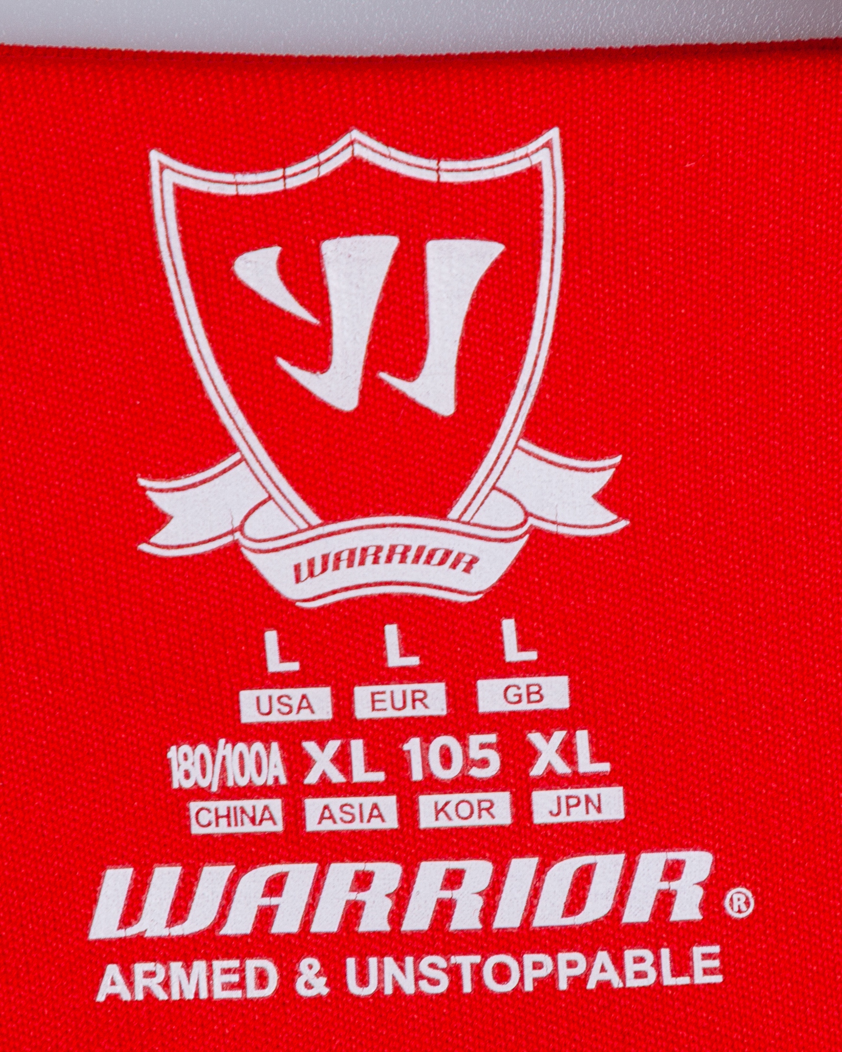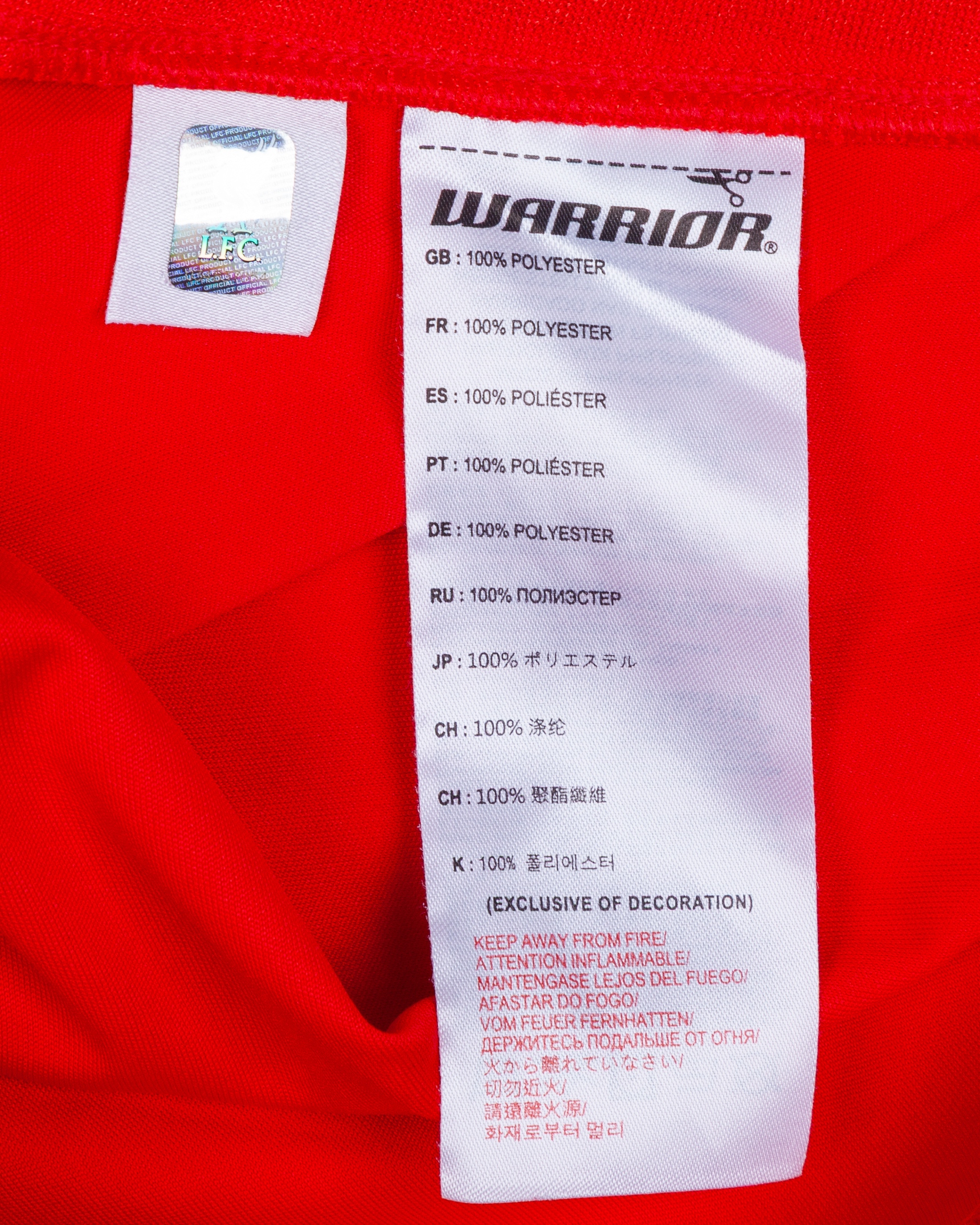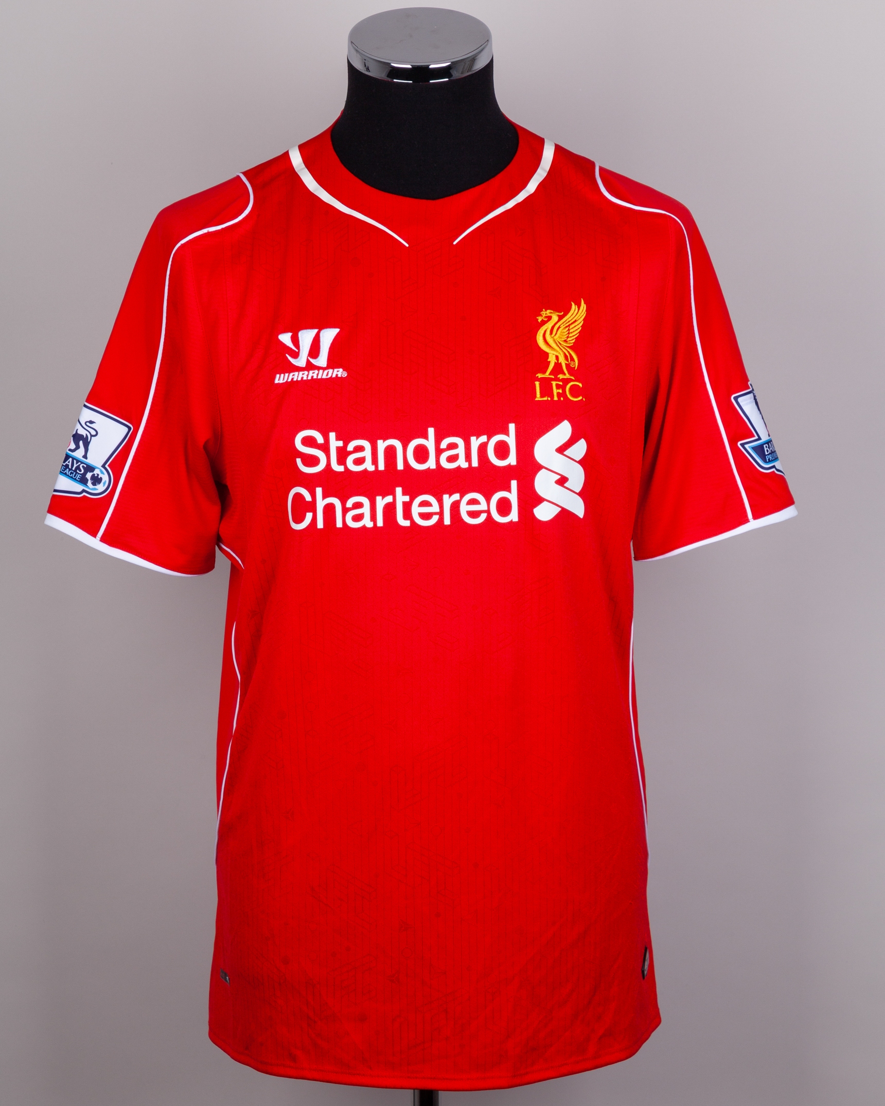 Mario Balotelli red and white No.45 Liverpool v. Manchester United match worn short-sleeved shirt, 2015, Warrior, L, with crew-neck collar and embroidered badge inscribed L.F.C., the reverse lettered BALOTELLI, the sleeves with Barclays Premier League flashes, with COA from Cult Kits and signed letter from Tony Heywood.