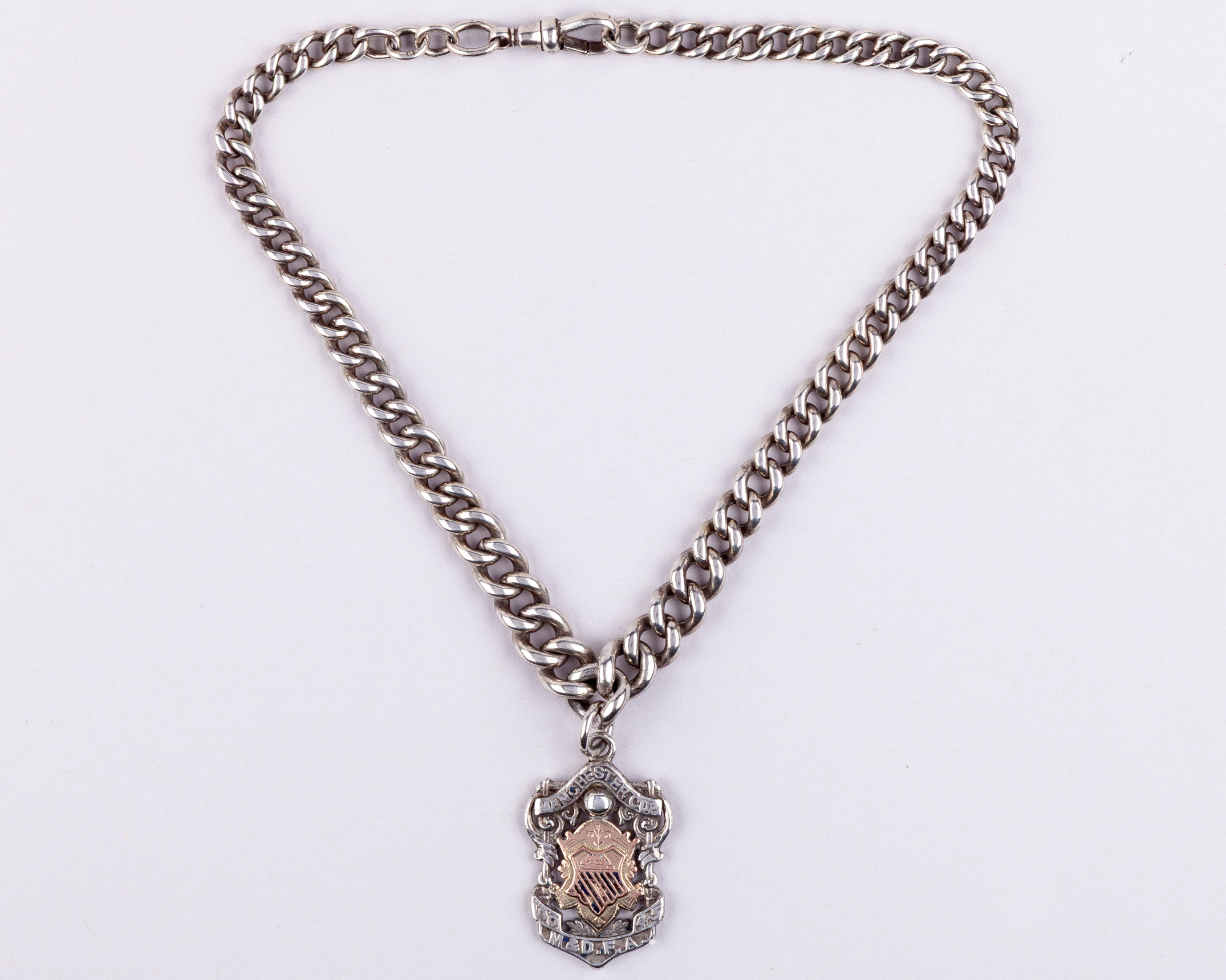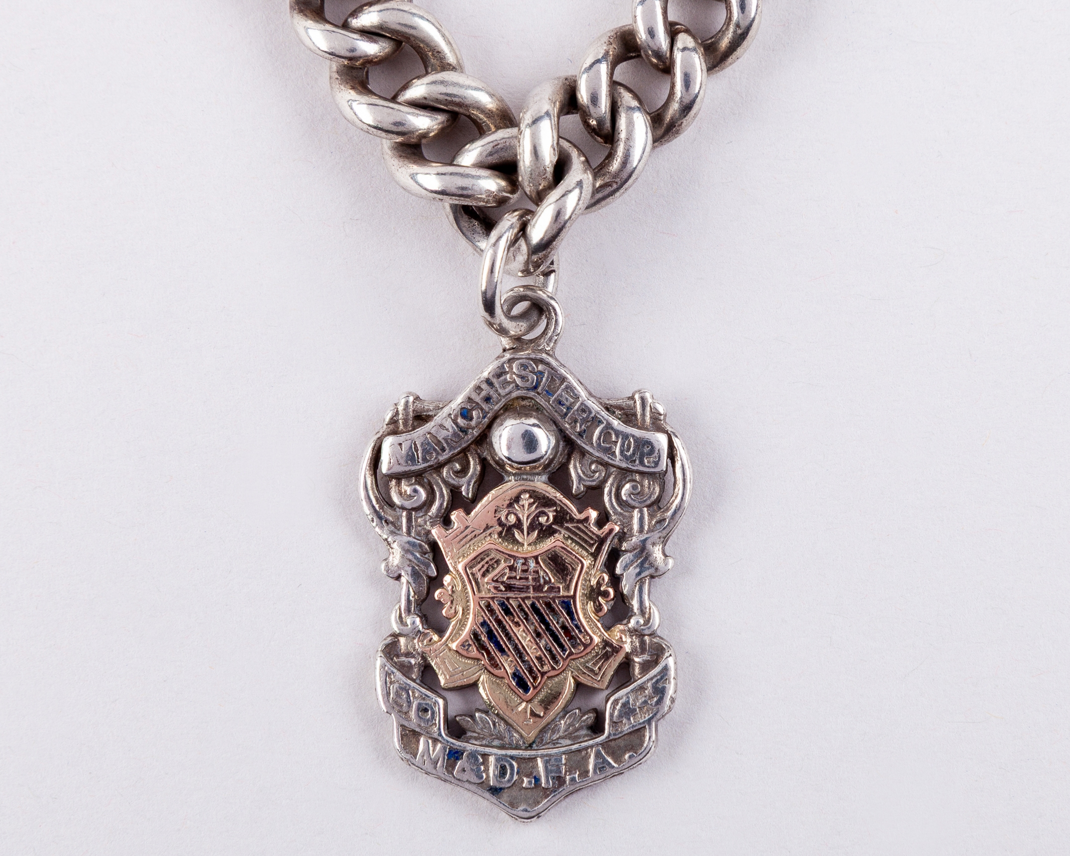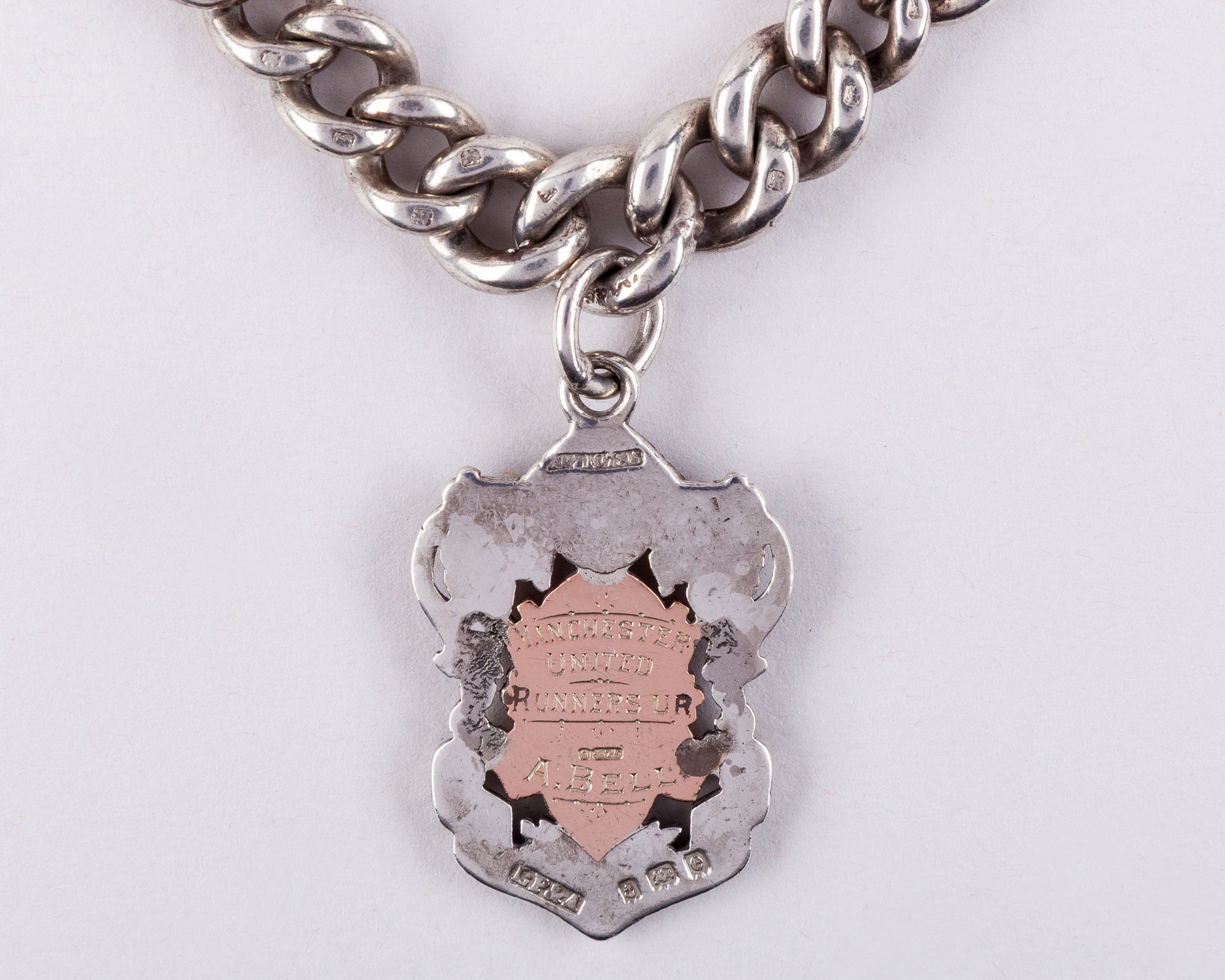 A 9ct gold and silver Manchester Cup runners-up medal, 1904-05, the obverse inscribed MANCHESTER CUP 1904-5 M & D F.A., the reverse inscribed MANCHESTER UNITED RUNNERS UP, A.BELL, medal rubbed, with heavy silver chain, 55grms