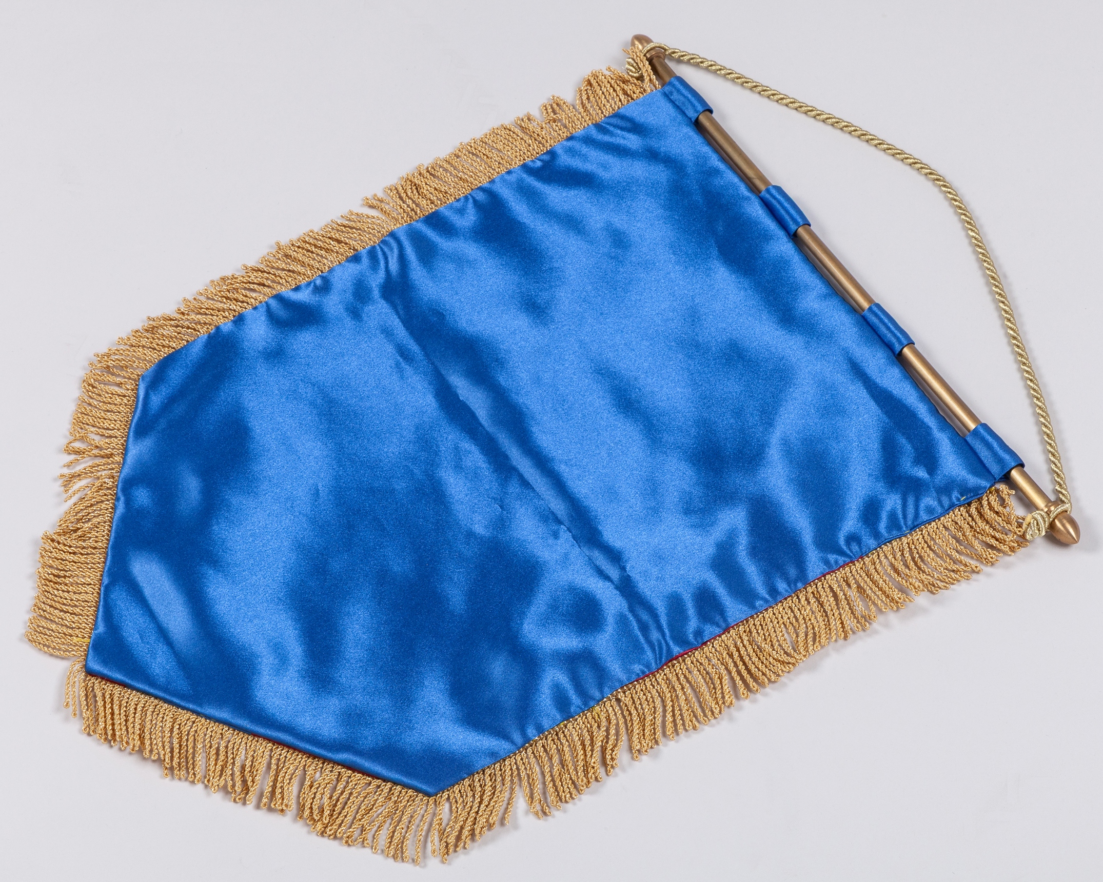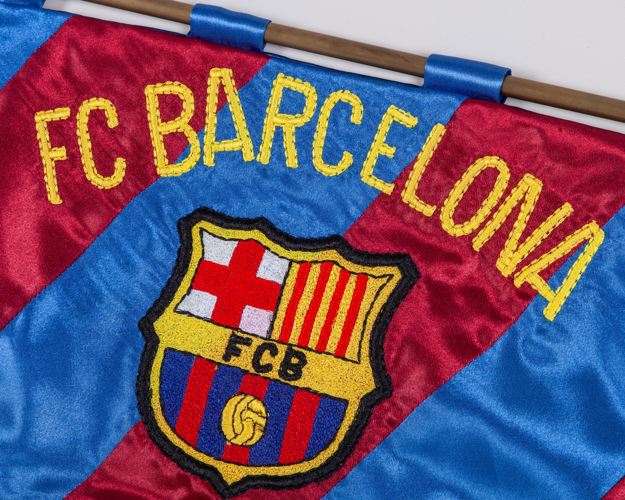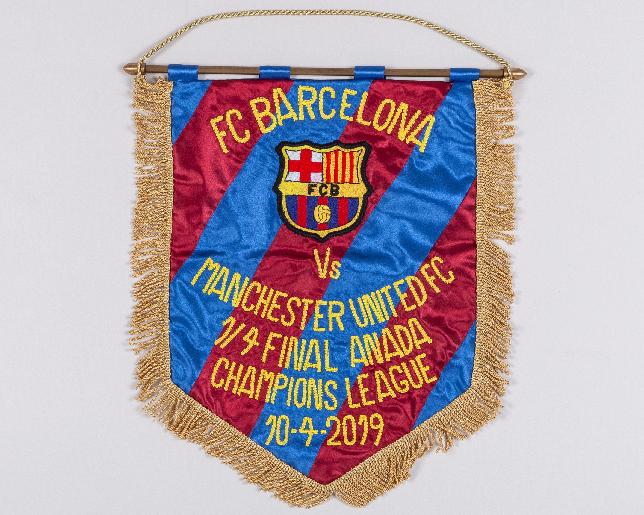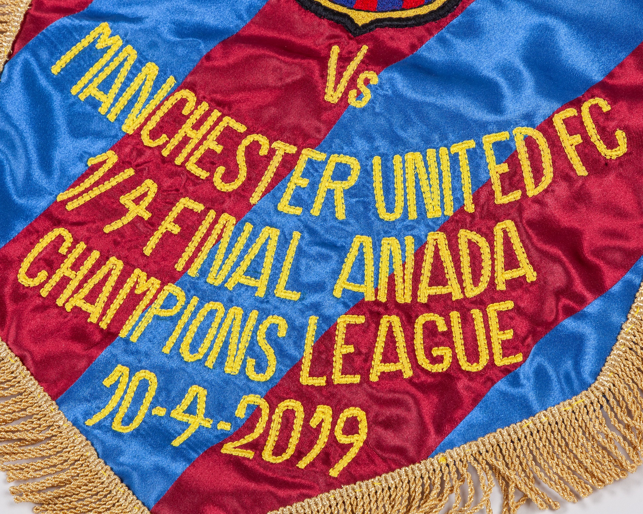 A garnet and blue Barcelona v. Manchester United embroidered pennant, 2019, inscribed FC BARCELONA Vs MANCHESTER UNITED FC ¼ FINAL ANADA CHAMPIONS LEAGUE 10-4-2019, with hanging bar