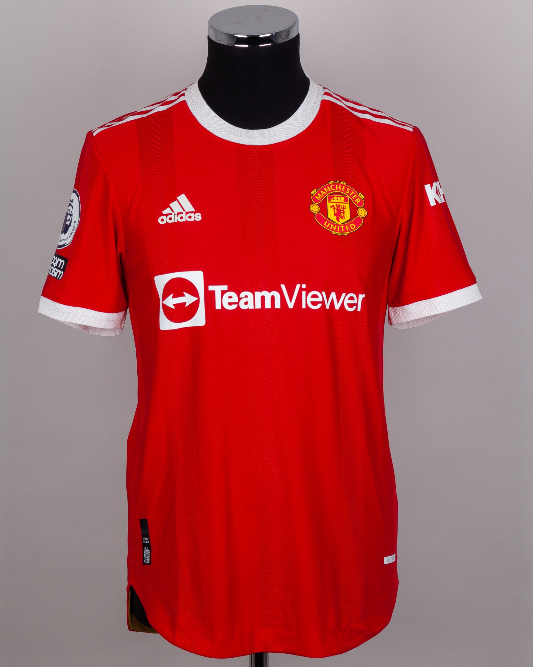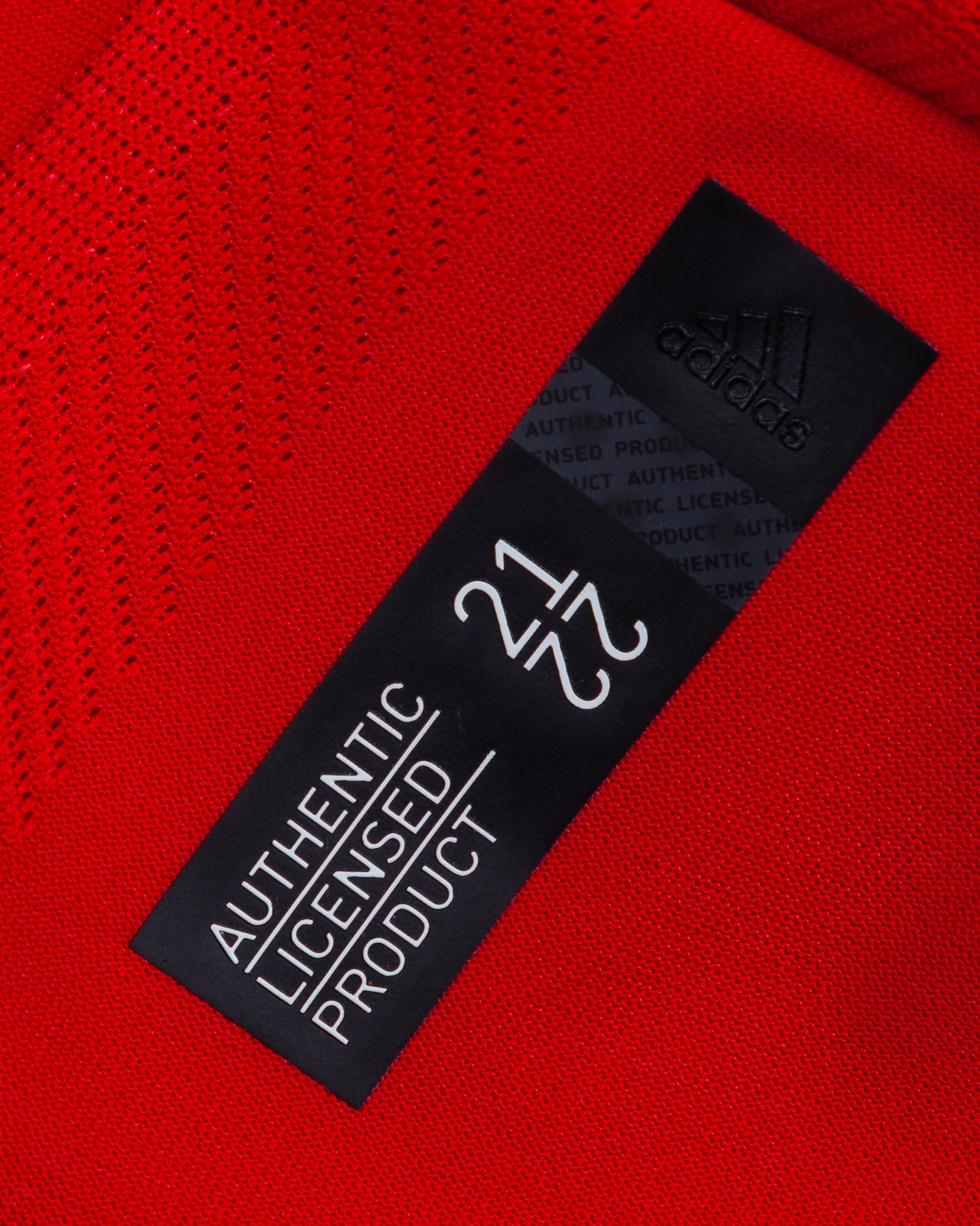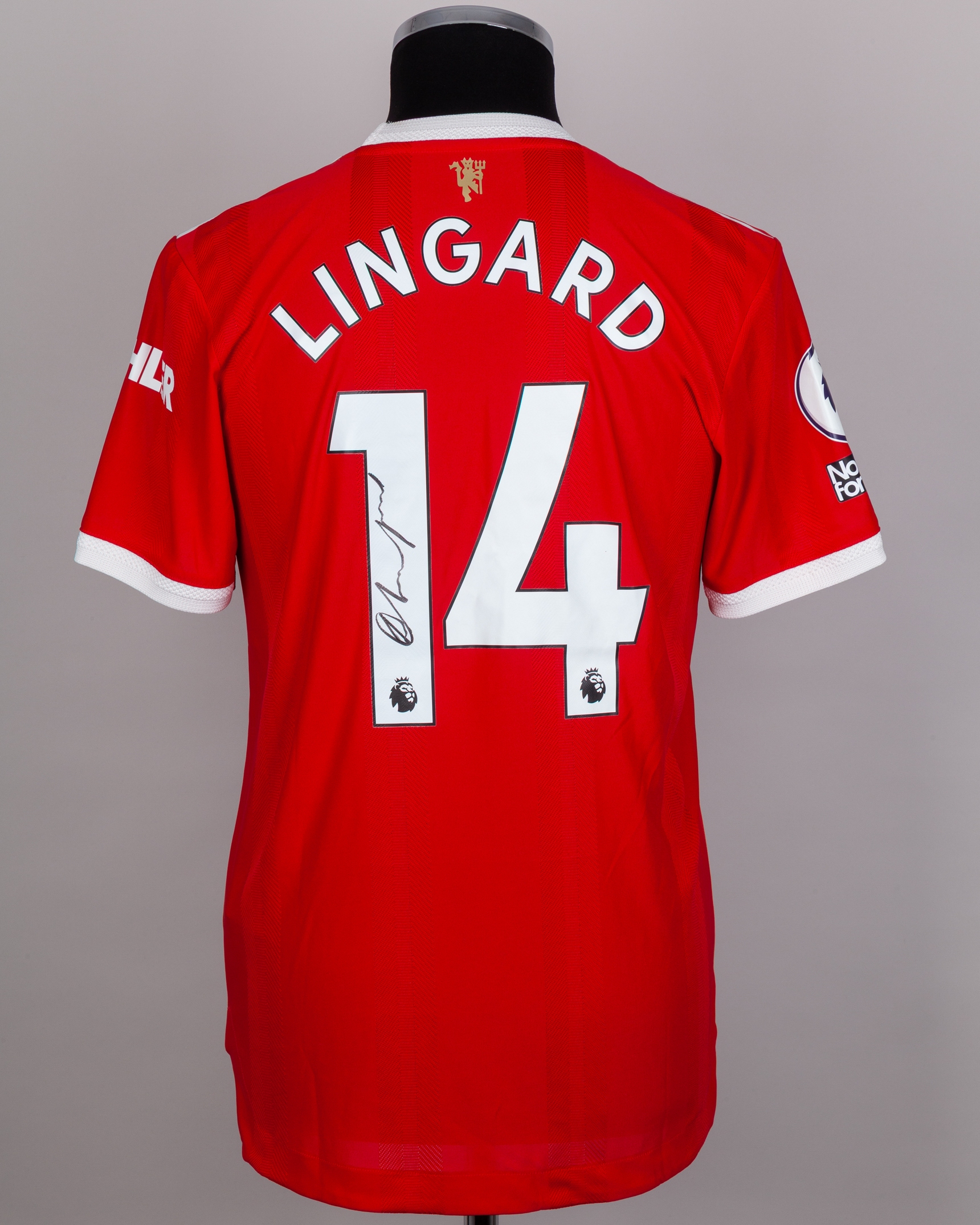 Jesse Lingard autographed red No.14 Manchester United short-sleeved shirt, 2021-22, Adidas, 5, with crew-neck collar and printed badge, the reverse lettered LINGARD, autographed on the number, the right sleeve with Premier League flash