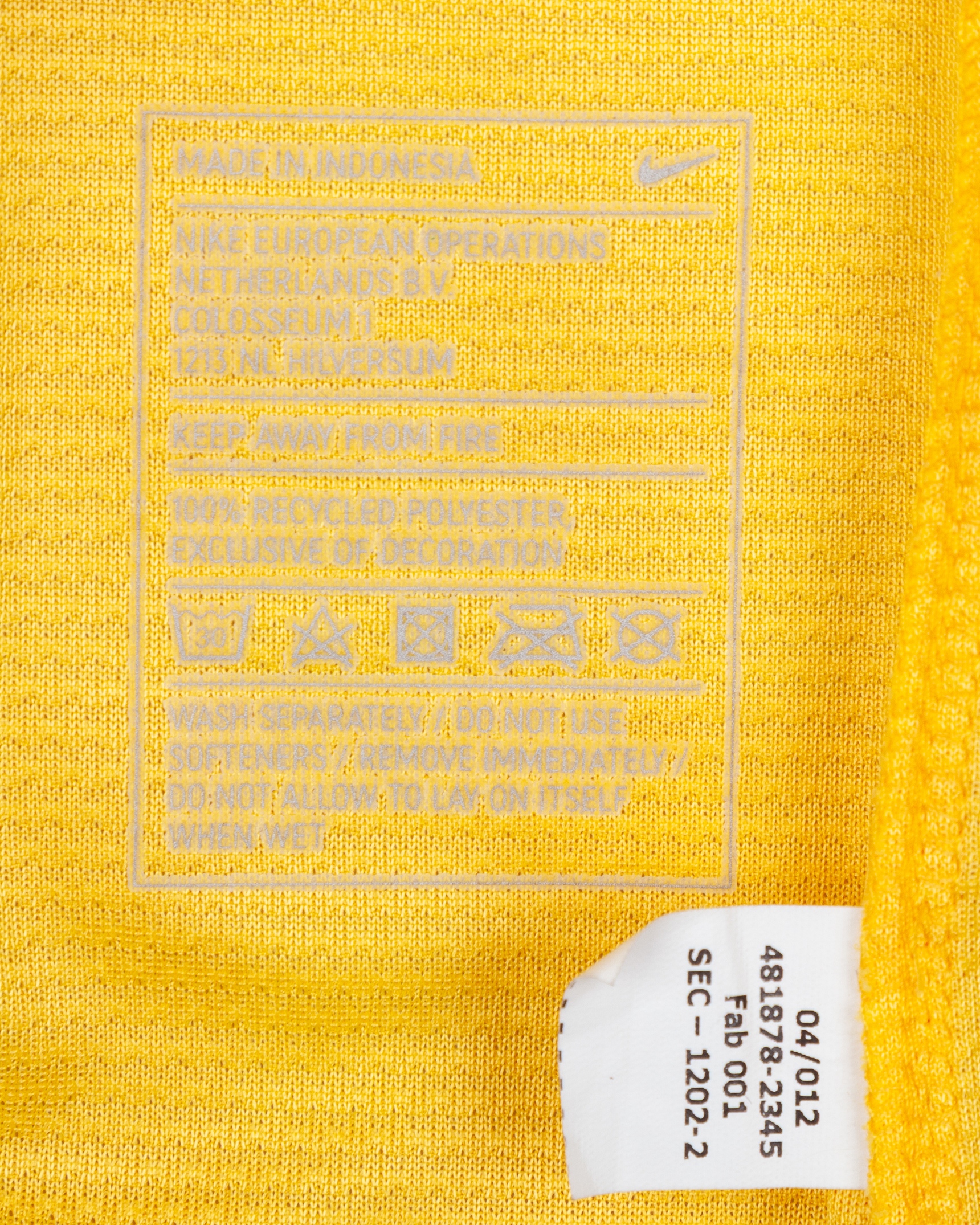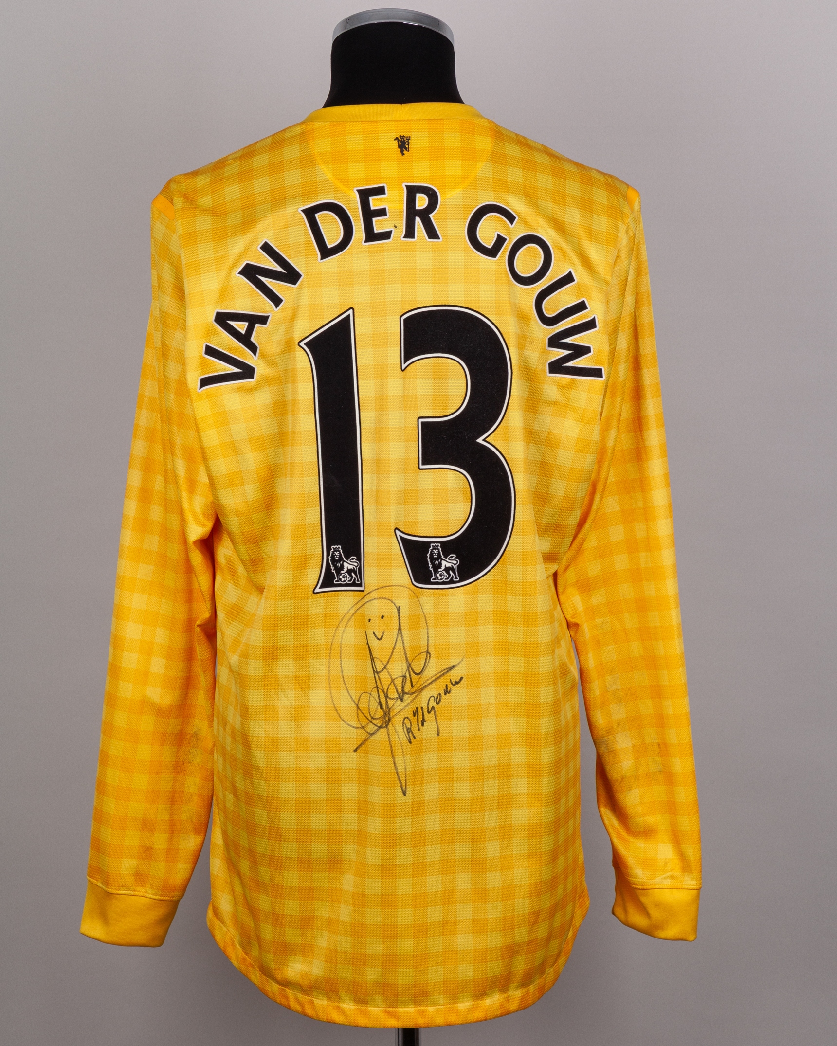 Raimond Van Der Gouw autographed yellow No.13 Manchester United Legends goalkeeper shirt, 2012-13, Nike, XL, with crew-neck collar and printed badge, the reverse lettered VAN DER GOUW, autographed on the front and back, with some staining particularly on the shoulders, small holes on shoulders