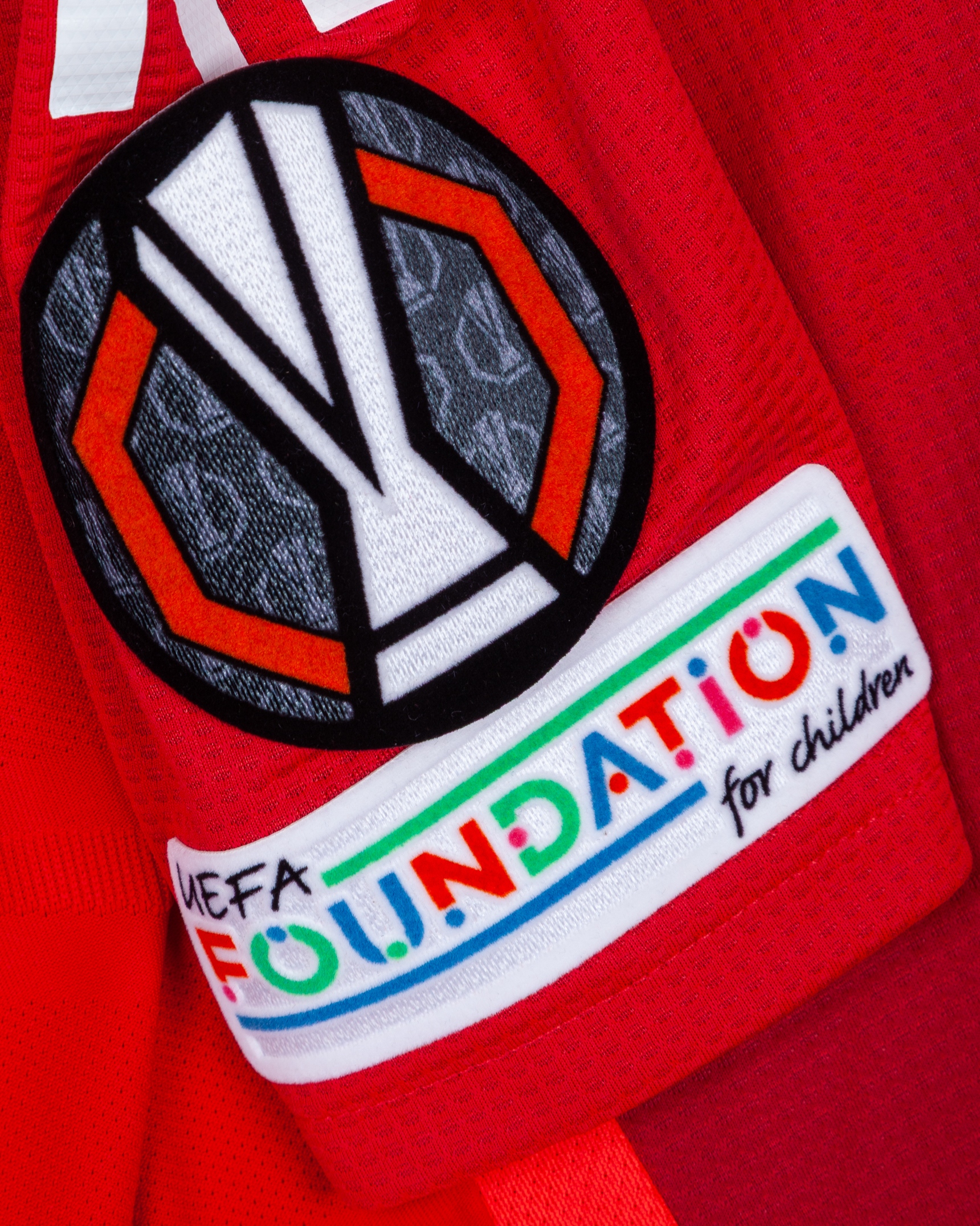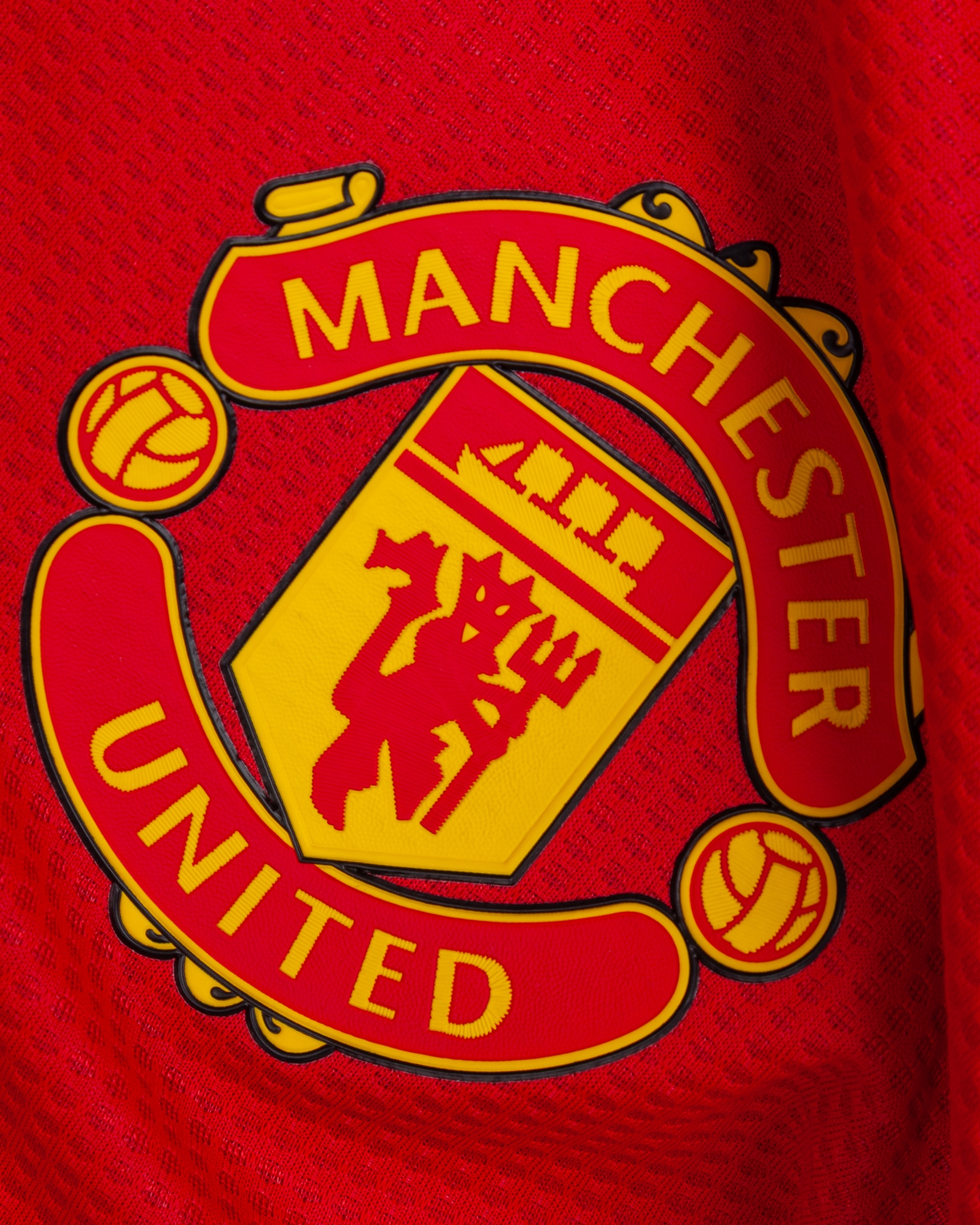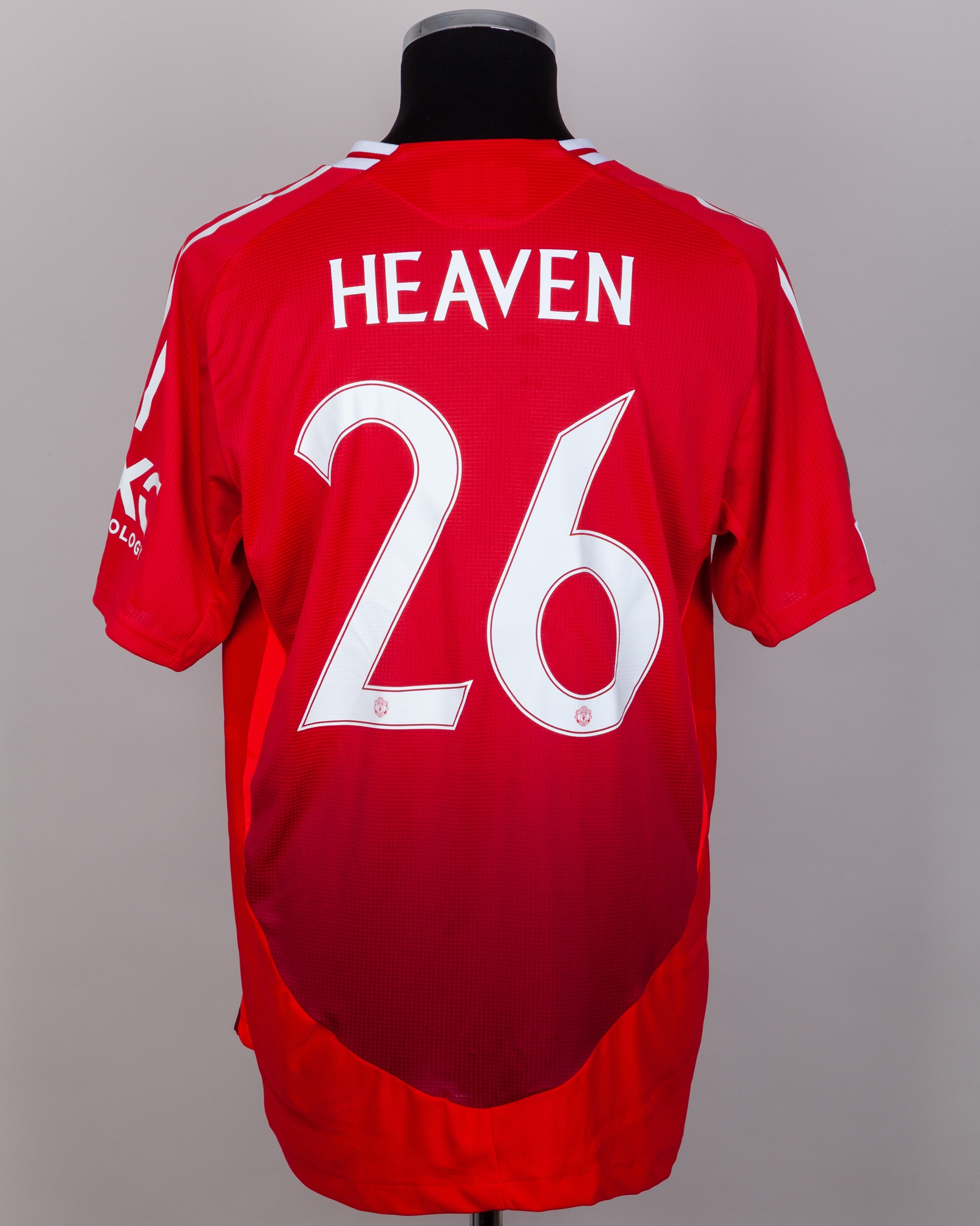 Ayden Heaven red No.26 Manchester United short-sleeved shirt, 2024-25, Adidas, XL, with crew-neck collar and printed badge, the reverse lettered HEAVEN, the right sleeve with Europa League and UEFA foundation flahses, flash loose