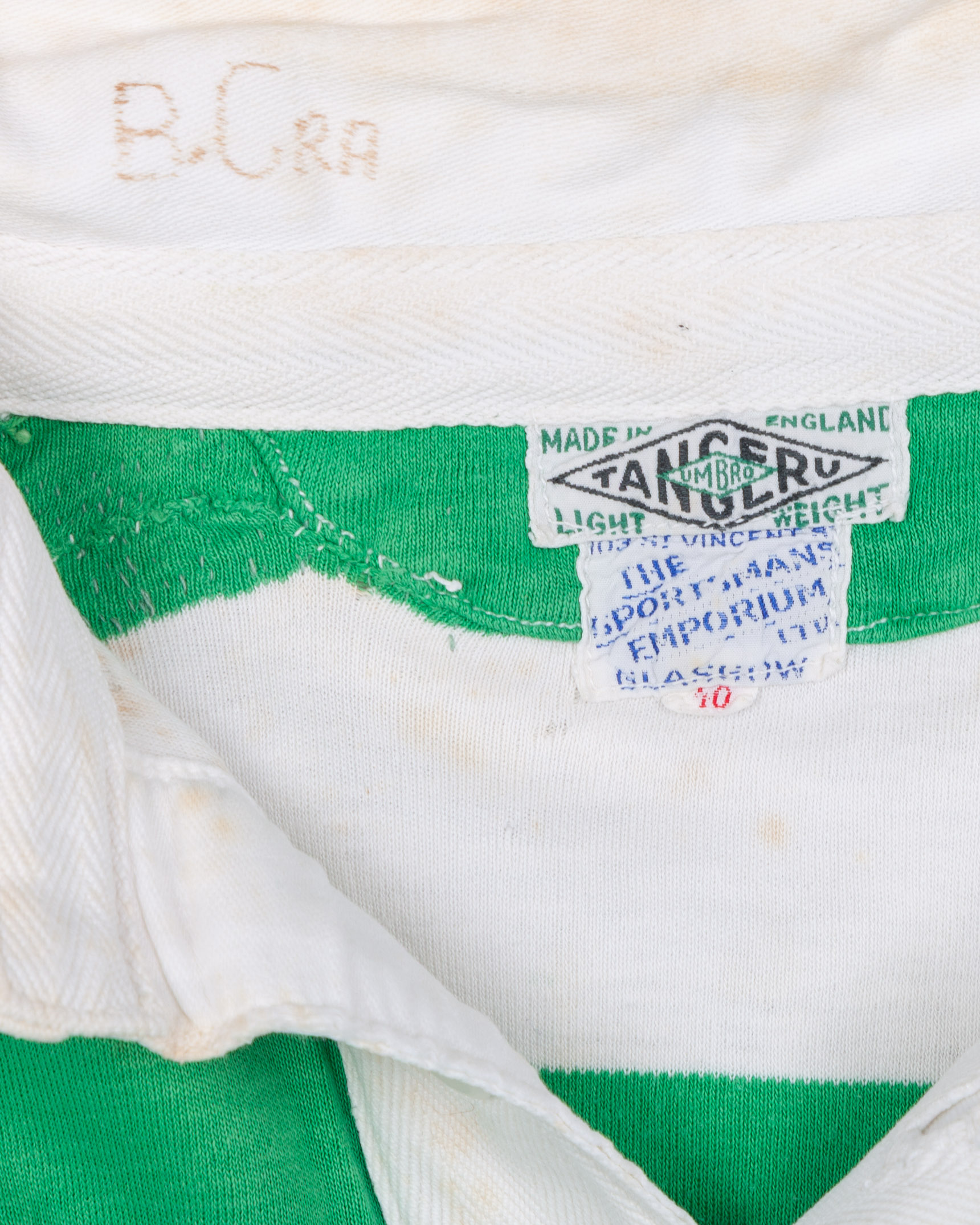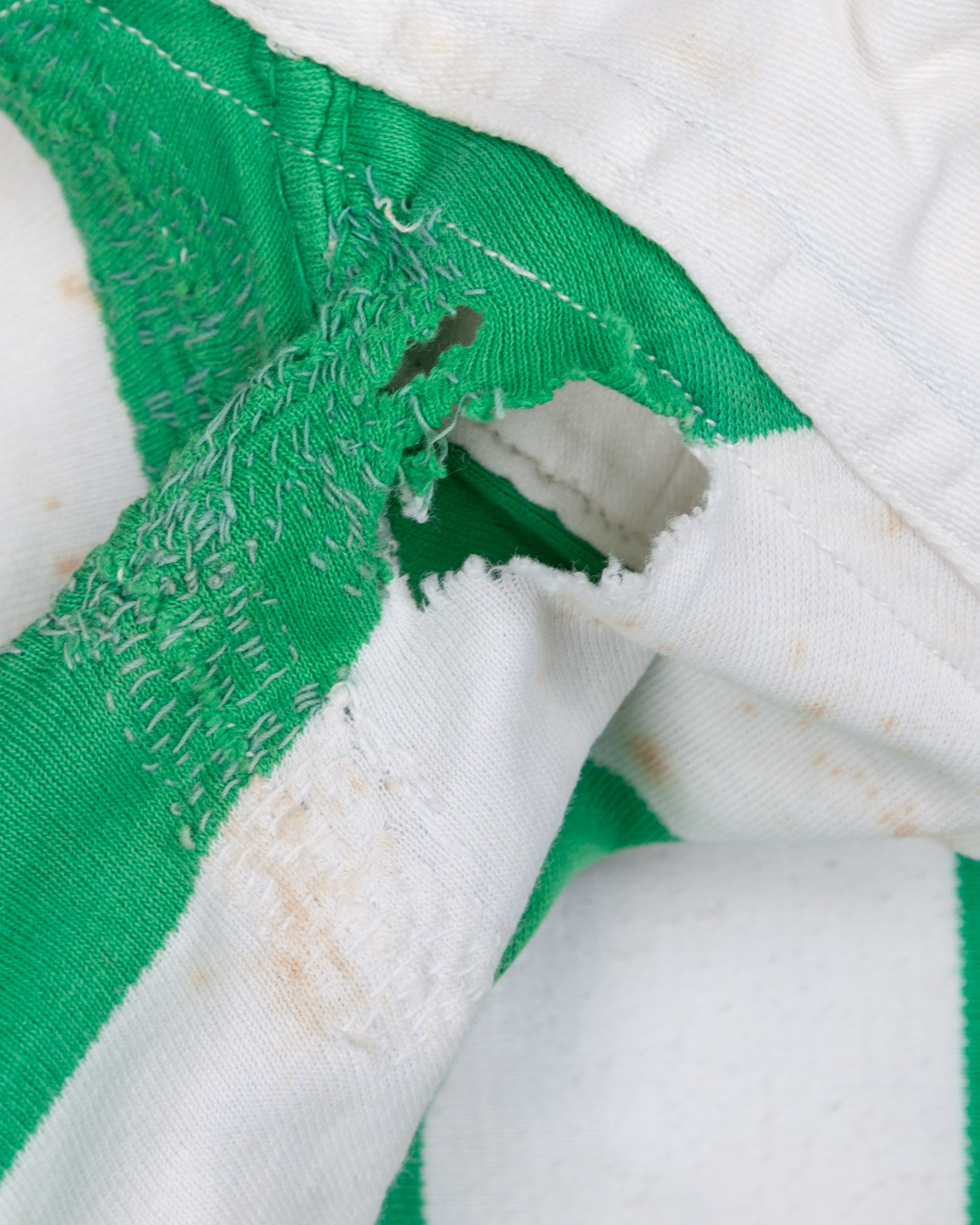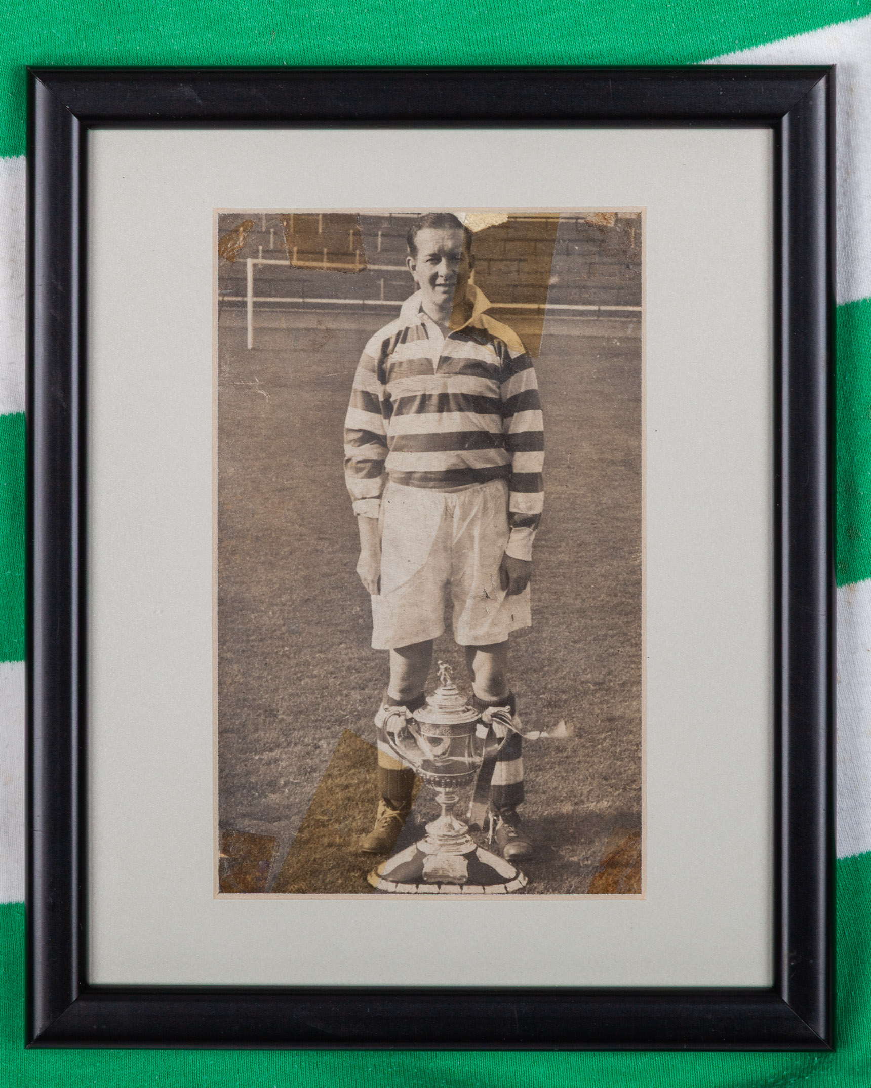 Charlie Tully green and white Celtic v. Motherwell Scottish Cup Final shirt, 1951, Umbro, with button-up collar, with black and white photograph of Charlie Tully in the shirt with Scottish Cup trophy, the shirt stained front and back, the shoulders torn and with repairs, the collar inscribed in ink B.Cra