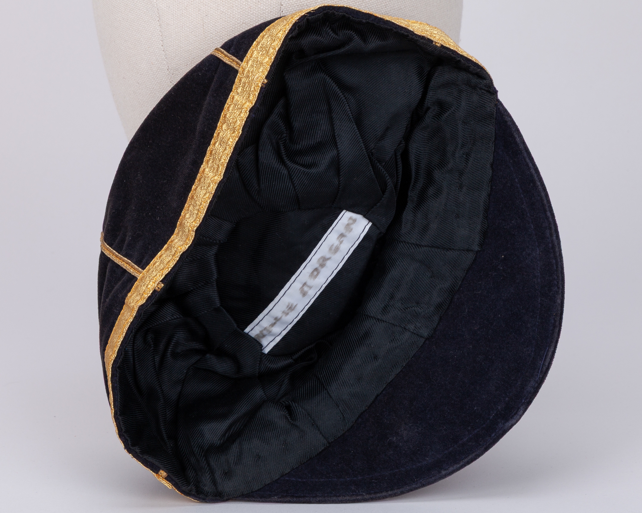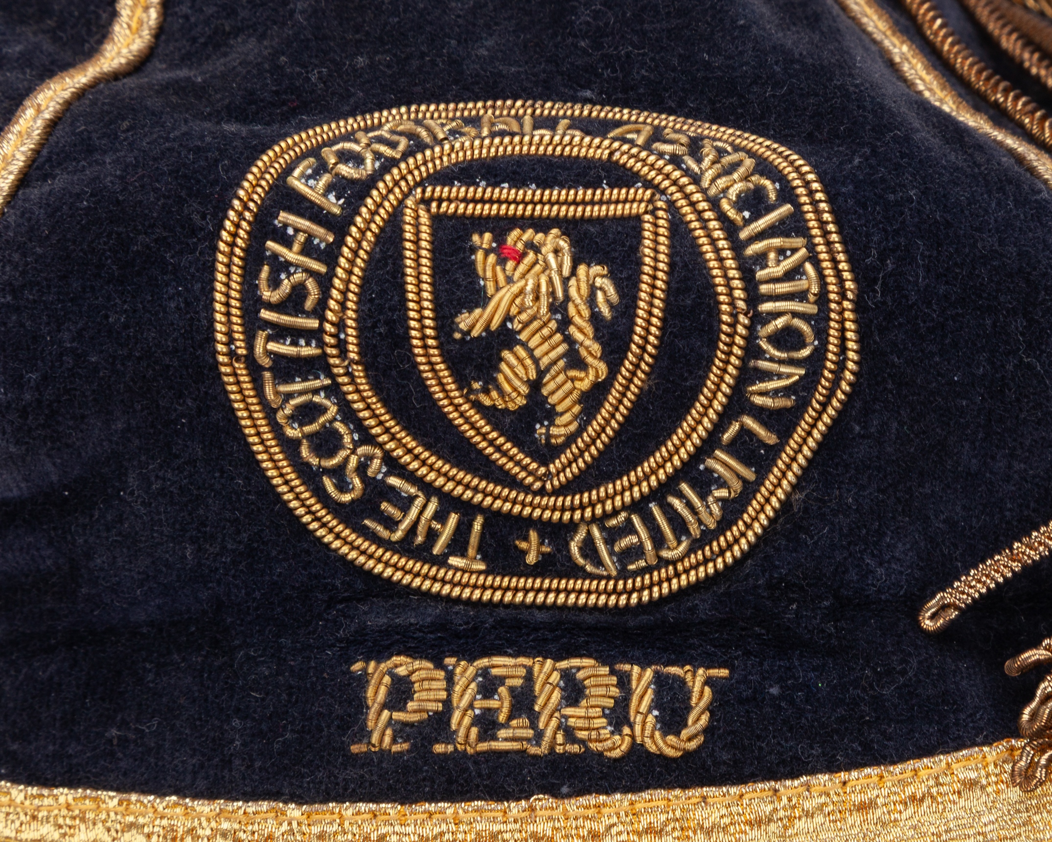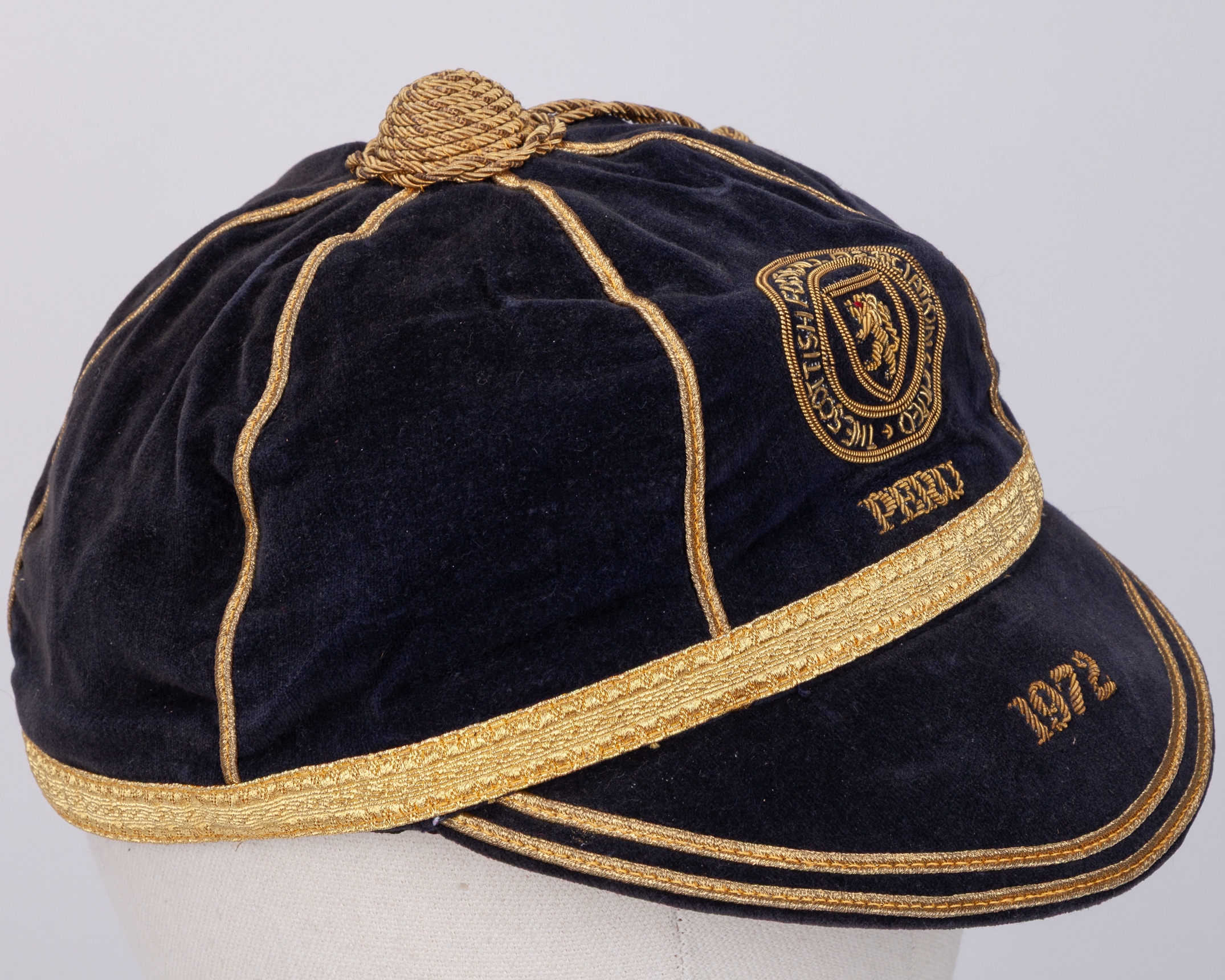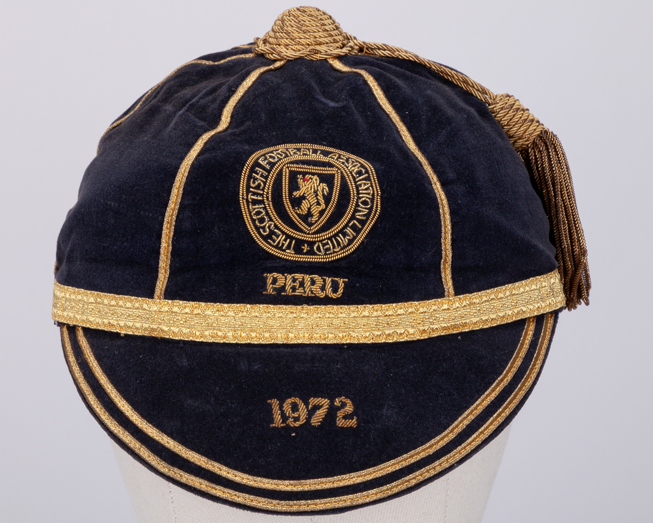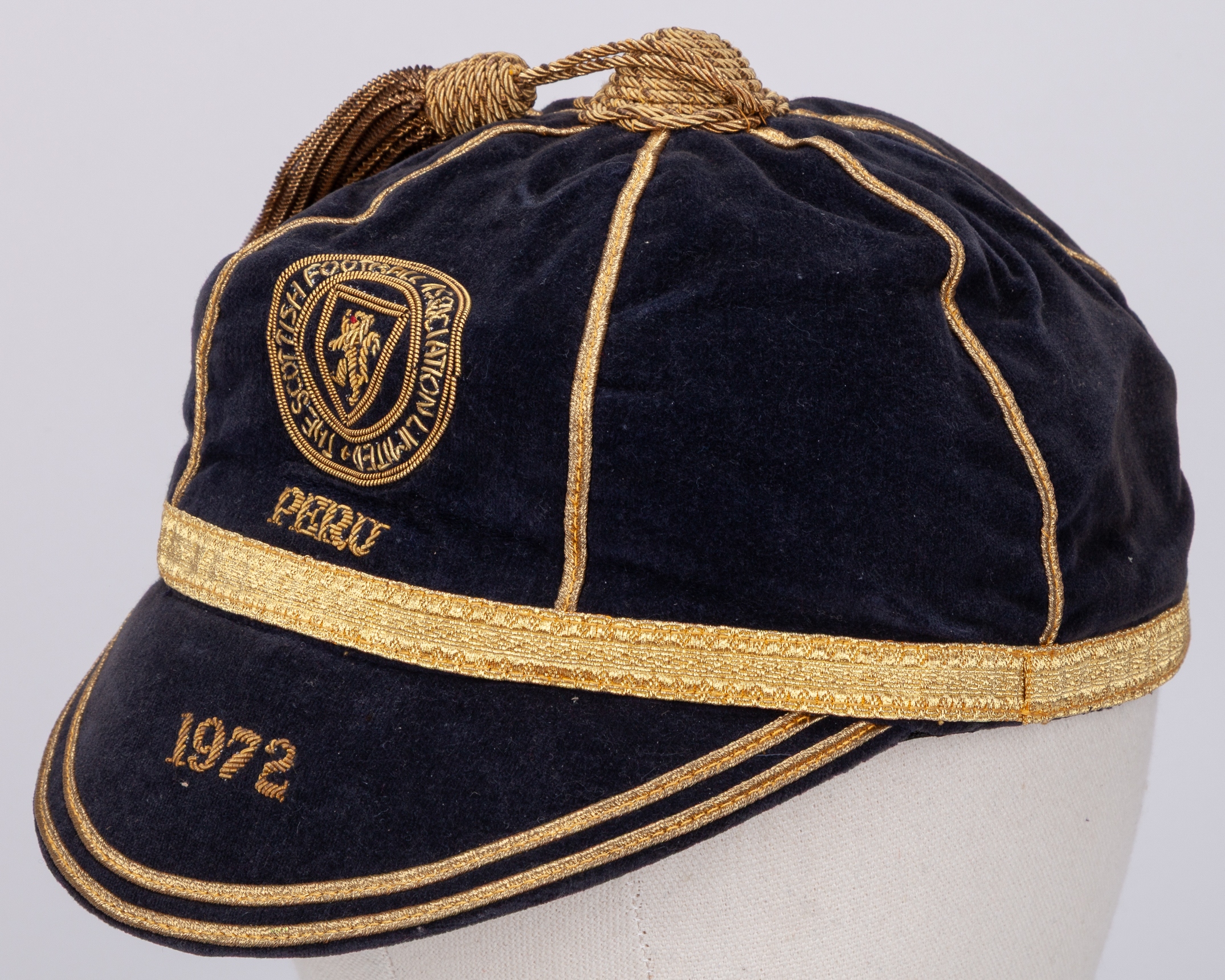 Willie Morgan blue Scotland v. Peru International cap, 1972, blue velvet cap with gilt tassel and braiding with embroidered crest inscribed PERU 1972, the interior inscribed in ink Willie Morgan